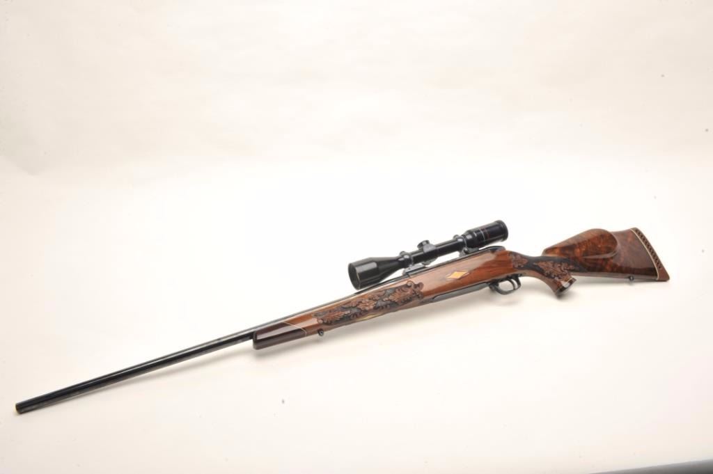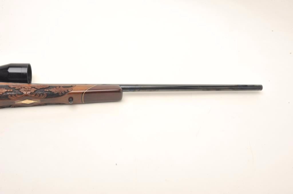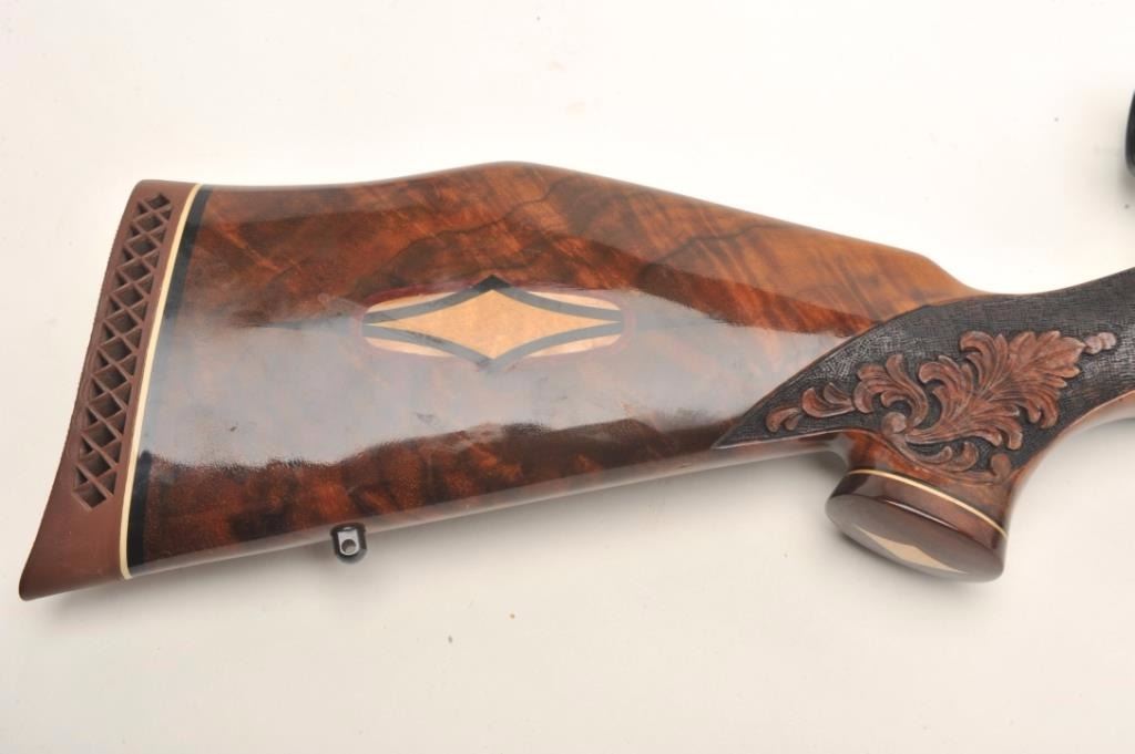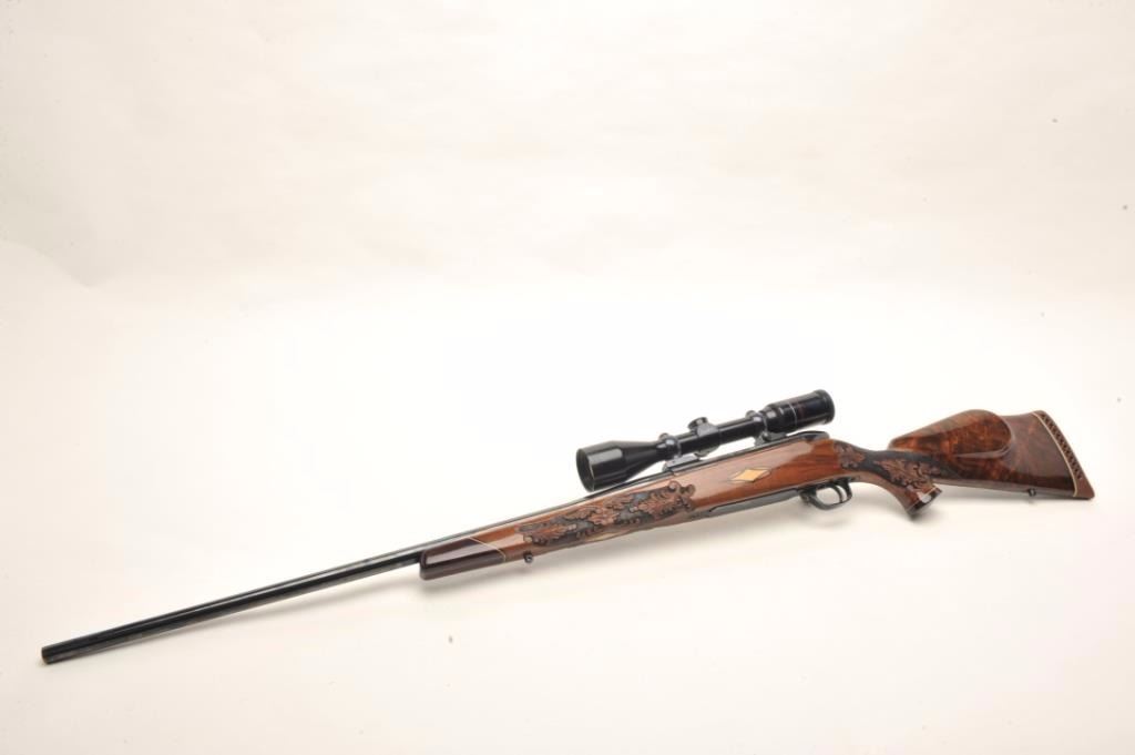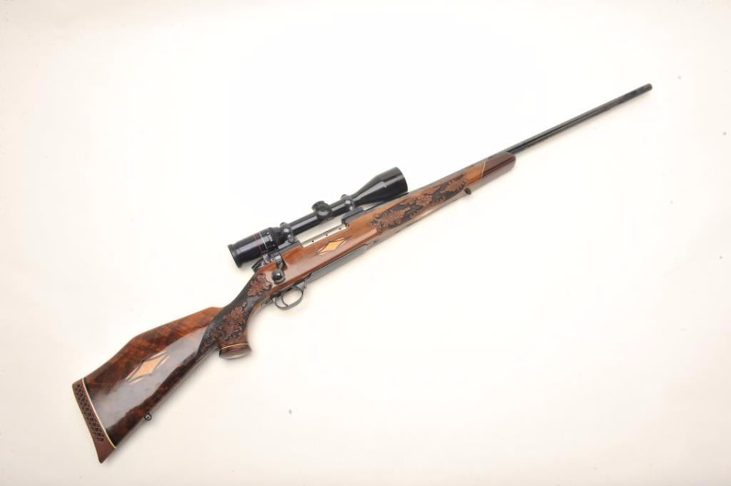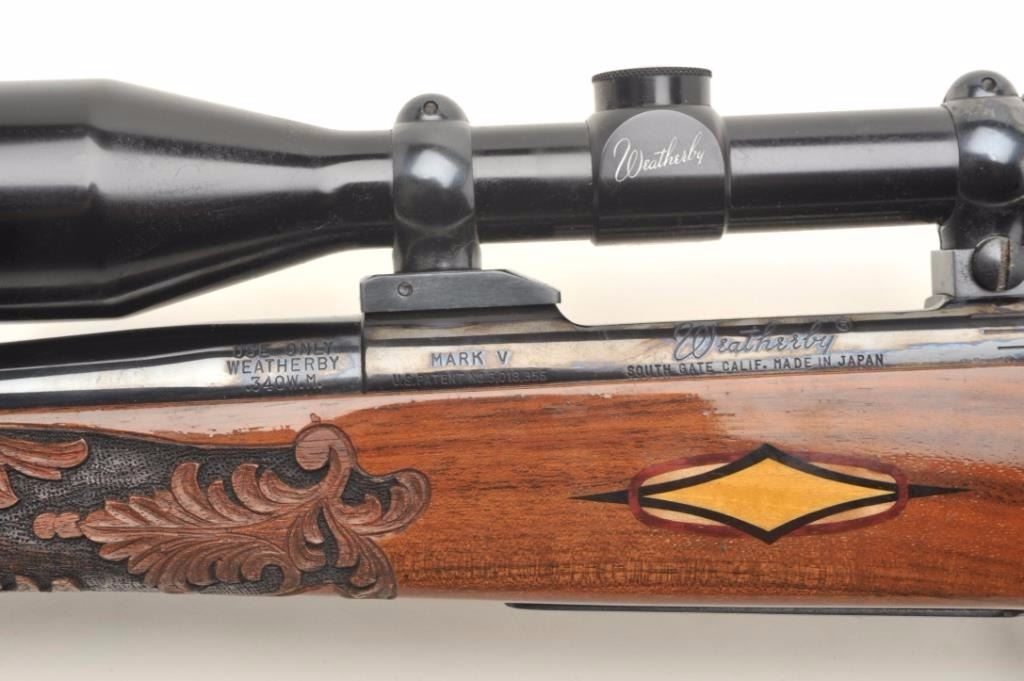 Weatherby Mark V bolt action custom rifle, .340 W.M. caliber, 26” round ported barrel, blued finish, custom hand carved and inlaid deluxe grained stock, S/N H185742, mounted with a Weatherby Supreme 3-9x44 scopedisplaying fine optics. This rifle is in overall fine condition showing approximately 99% original blued finish, very good to fine bore, crisp action, sharp markings and beautifully customized deluxe wood stock. (Modern/PPT). Est.: $2,500-$5,000.
