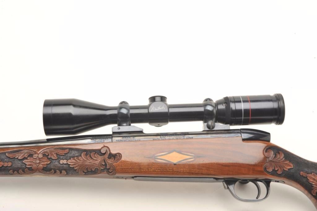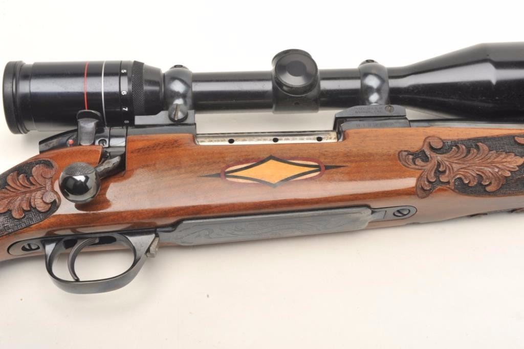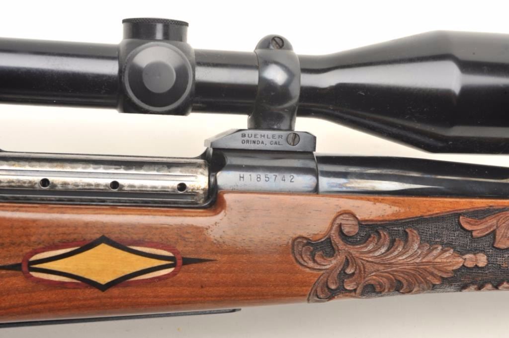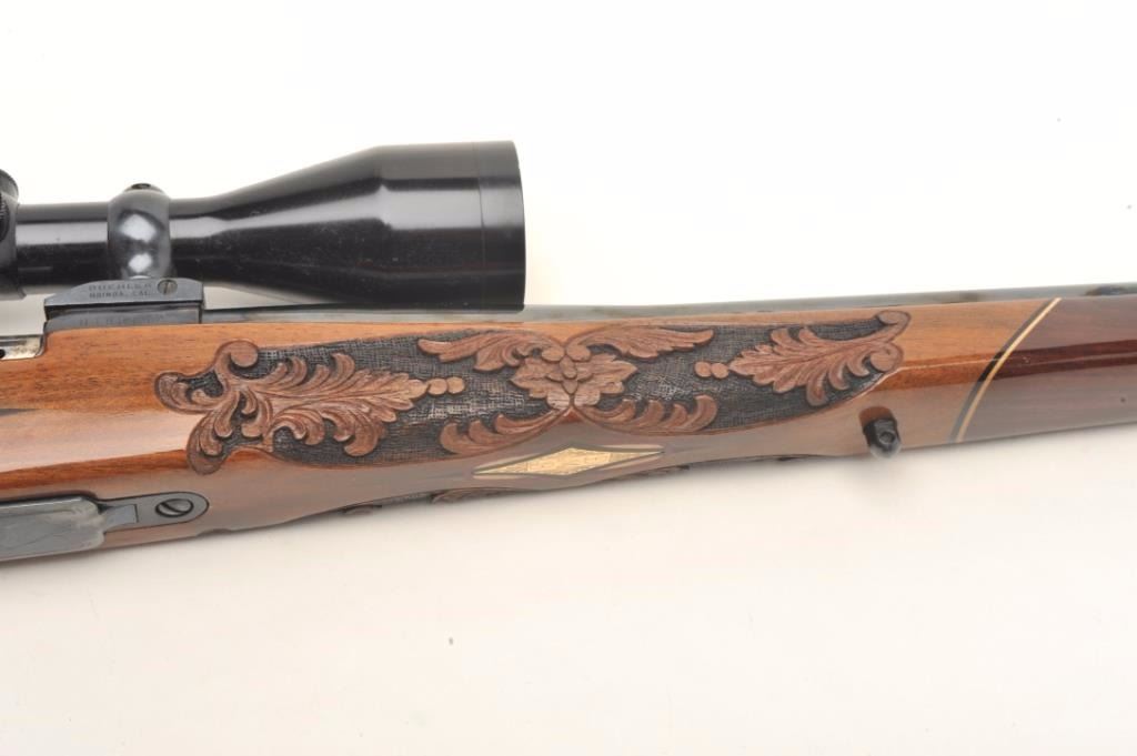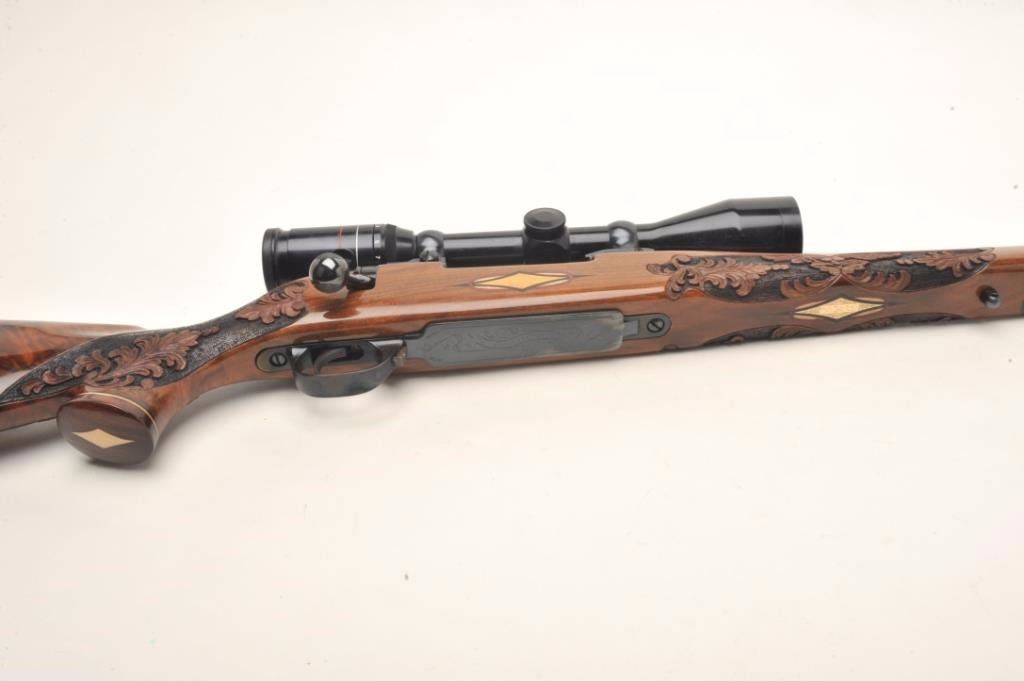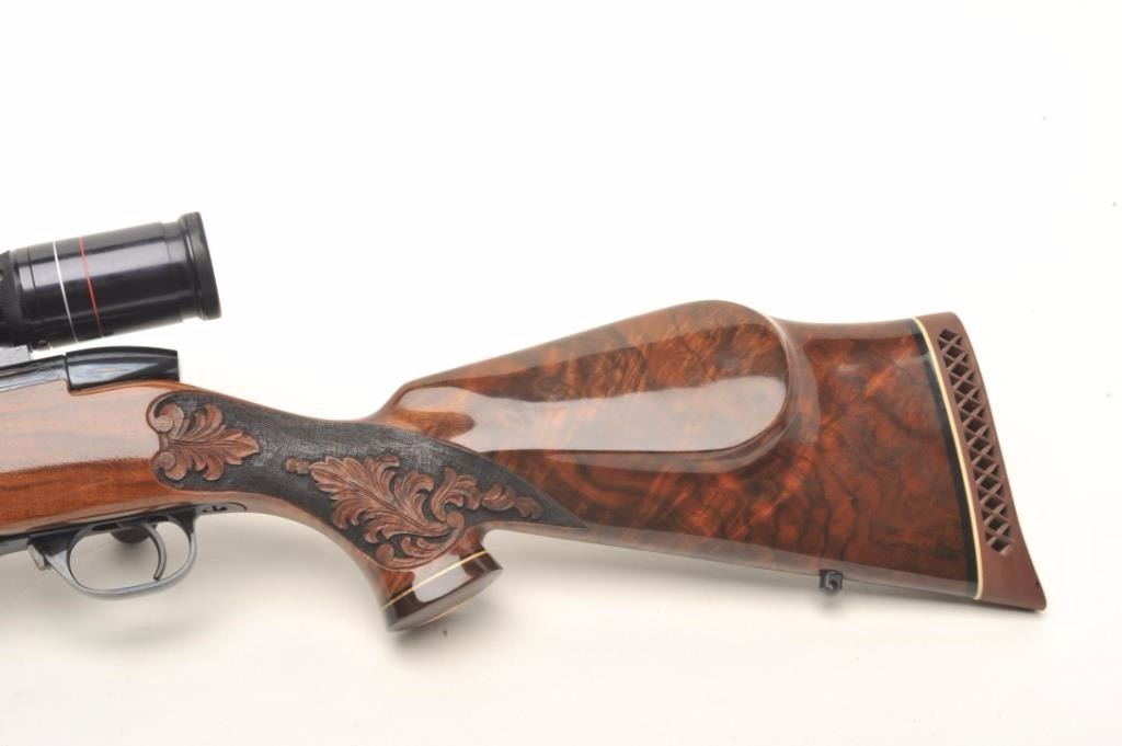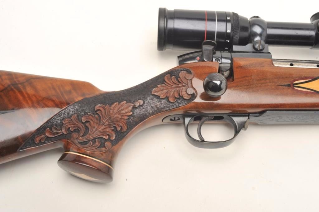 Weatherby Mark V bolt action custom rifle, .340 W.M. caliber, 26” round ported barrel, blued finish, custom hand carved and inlaid deluxe grained stock, S/N H185742, mounted with a Weatherby Supreme 3-9x44 scopedisplaying fine optics. This rifle is in overall fine condition showing approximately 99% original blued finish, very good to fine bore, crisp action, sharp markings and beautifully customized deluxe wood stock. (Modern/PPT). Est.: $2,500-$5,000.