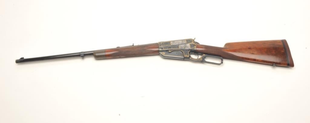 Magnificent engraved Winchester Model 95 lever action rifle, in exhibition style with African Hunting scenes, deep floral engraving and gold line borders; .35 W.C.F. caliber, 24” heavy round barrel, blued finish, deluxecheckered wood stocks with horn forend tip and Winchester hard rubber butt pad, S/N 425386, in overall excellent condition showing minimal handling. (Modern). Est.: $6,000-$12,000.