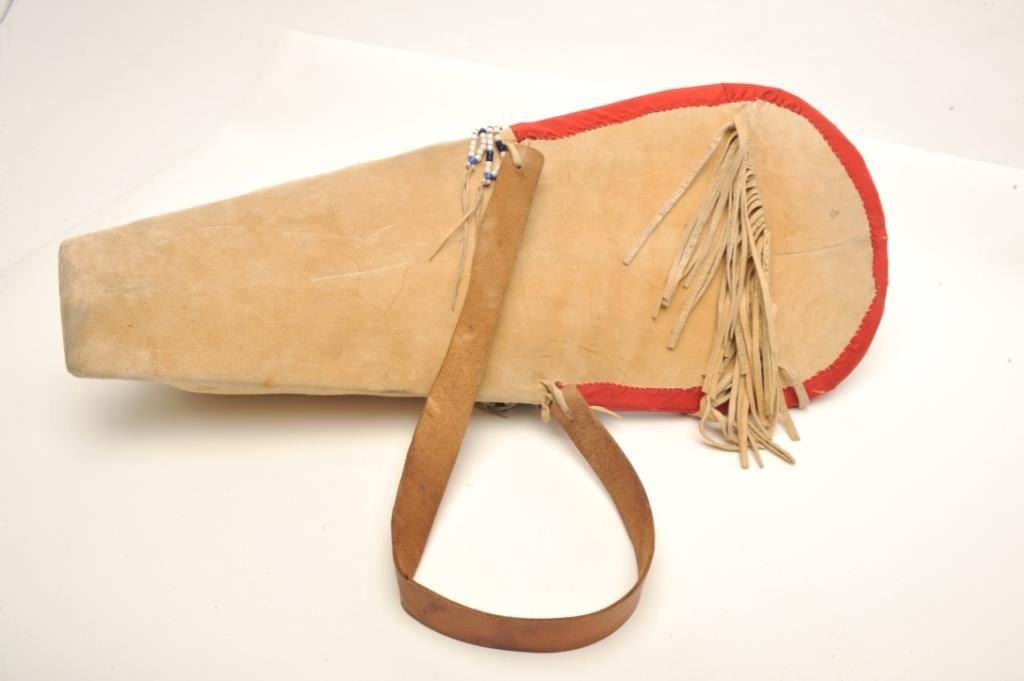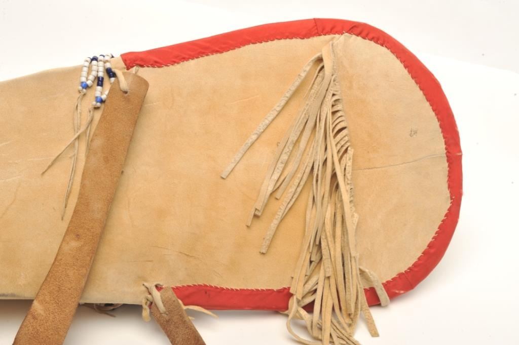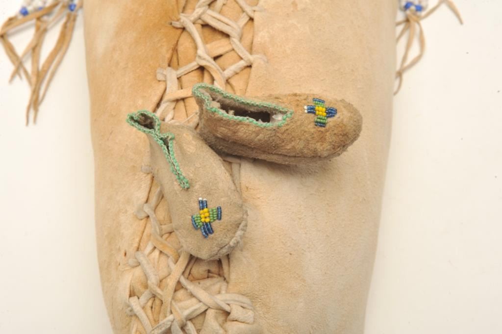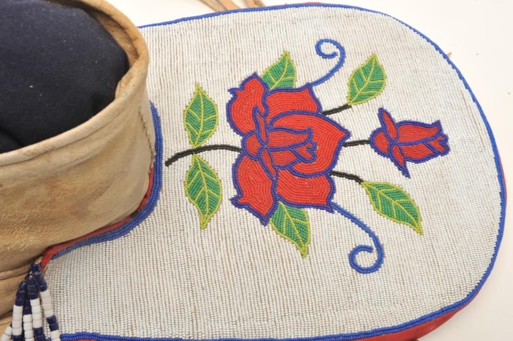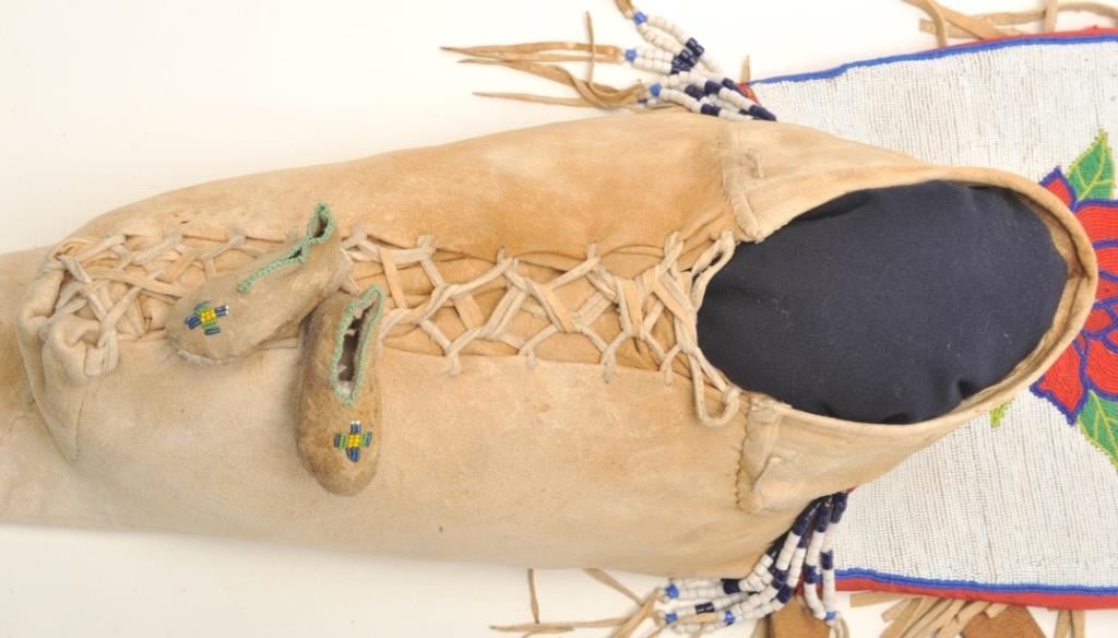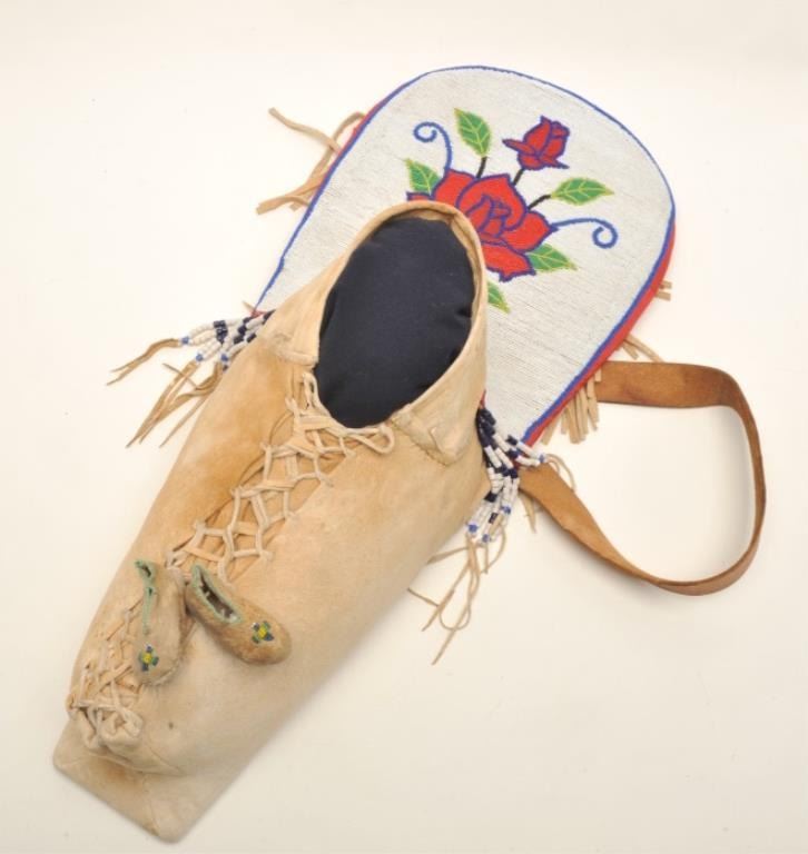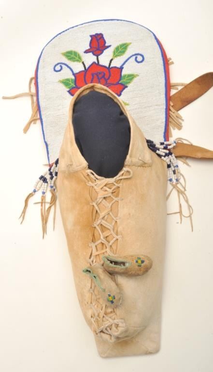 Shoshone cradleboard, finely beaded with fringe and trade cloth; exceptional turn-of-century; approximately 30” tall and 12” wide at beaded headboard area; small infant’s pair of beaded moccasins attached. Est.: $3,000-$6,000.