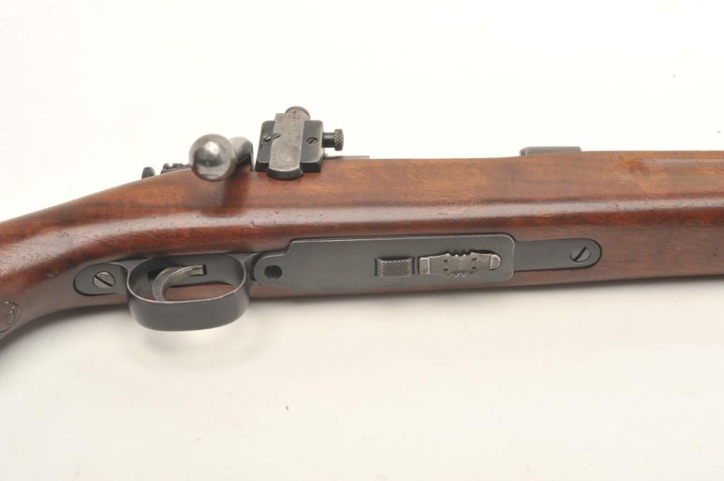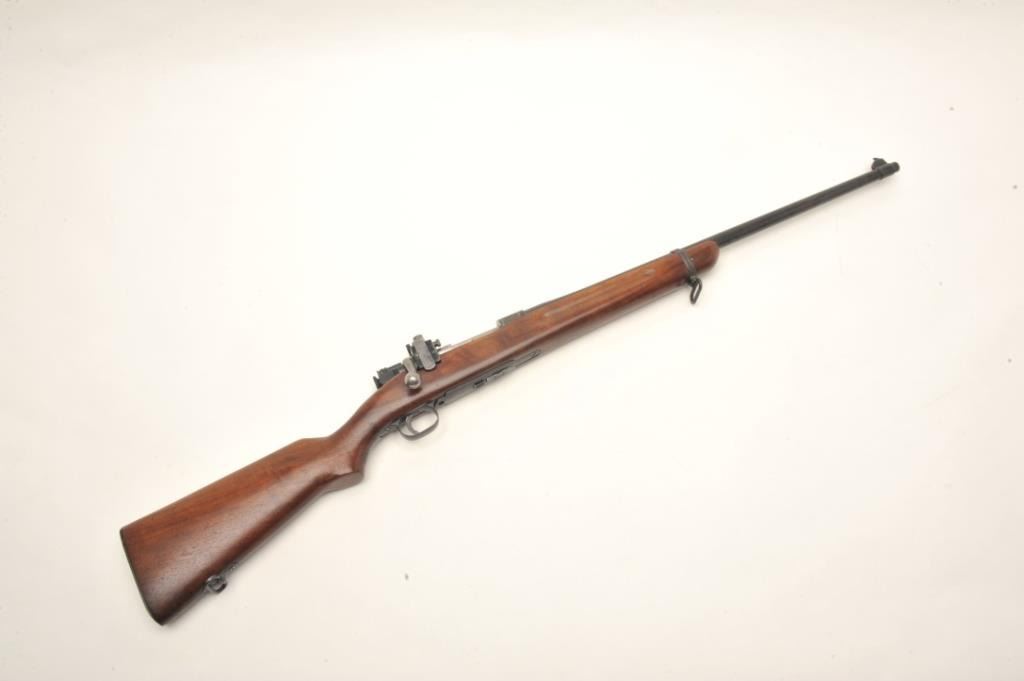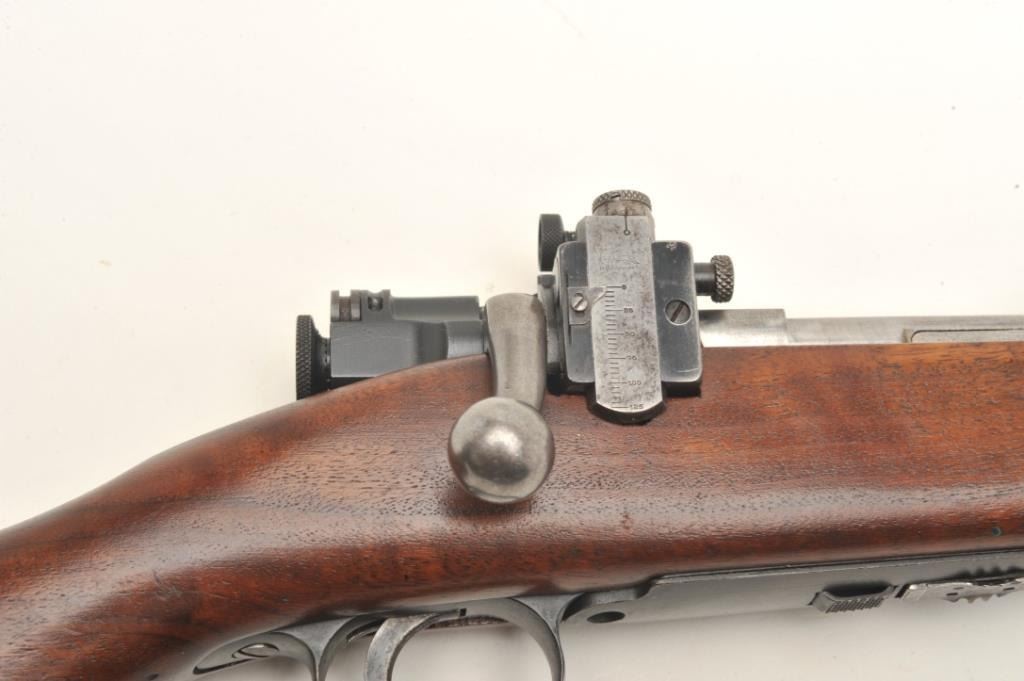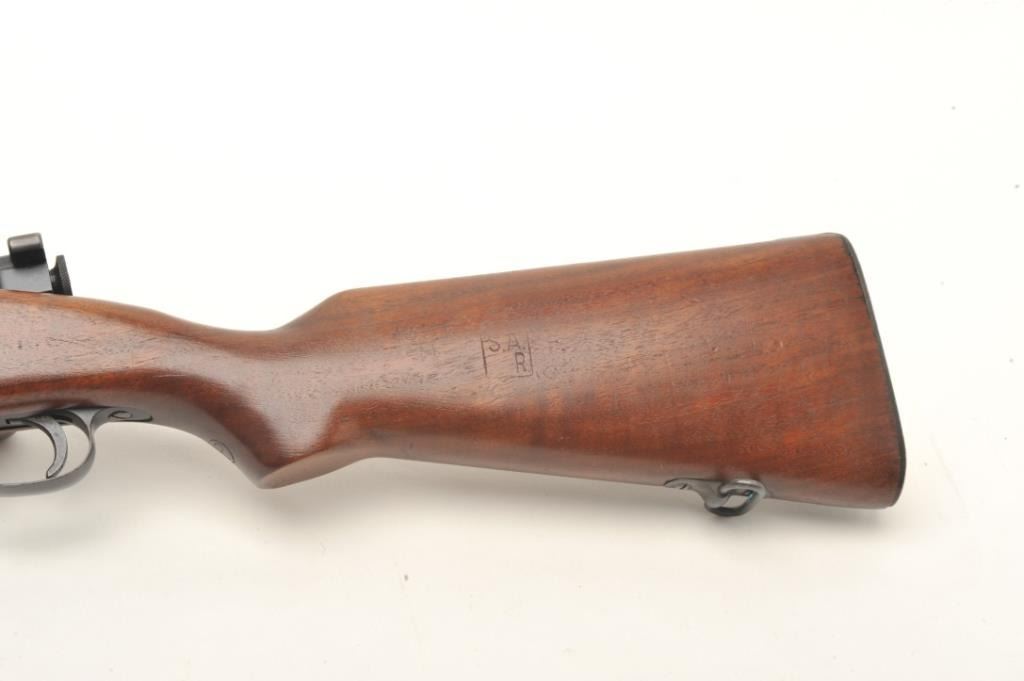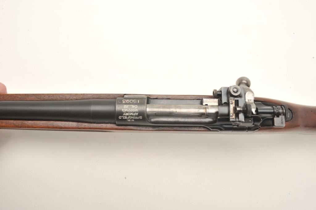U.S. Springfield Model 1922 (top of receiver marked “M1922MI1”) bolt action rifle, .22LR caliber only, 24” barrel marked S.A./flaming bomb/6-37, parkerized finish, M2 bolt, adjustable rear sight, wood half stock withsling swivels, S/N 15093B, in overall very good + condition displaying the majority of its military parkerized finish, very good to fine bore, crisp action, very good markings and very good to near fine wood with sharpcircle P proof and S.A./R. cartouche on left side of butt stock; there is another cartouche in the same area that is lighter but appears to be “S.A.” over “H”. (C&R). Est.: $700-$1,400.