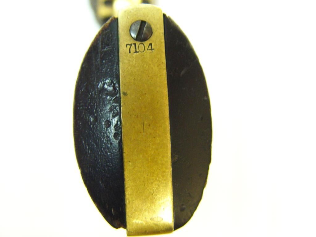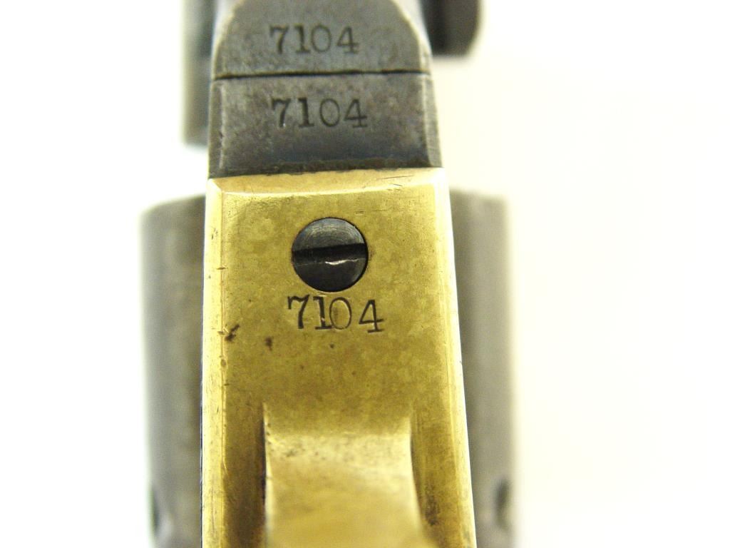 Colt 1861 Navy with desirable Naval anchor marking on the barrel and inspected by “G.G.” on the cylinder with 1871-72 patent dates and made as a .38 caliber centerfire cartridge arm serial numbered in its ownrange, S/N 7104. Pictured on page 262 of “Colt Conversions” by Bruce McDowell and formerly Sam Pachanian Collection. In near fine original condition showing 60%-80% original blue and case hardening with somenatural aging and patina. Near fine grips with minor imperfections. All matching serial numbers and sharp overall. Some bright case color and blue where protected. A collector’s quality 1861 that is rarely found Navalmarked and inspected by G.G. who was well known for inspecting cuttless. (Antique) Est.: $5,000-$10,000