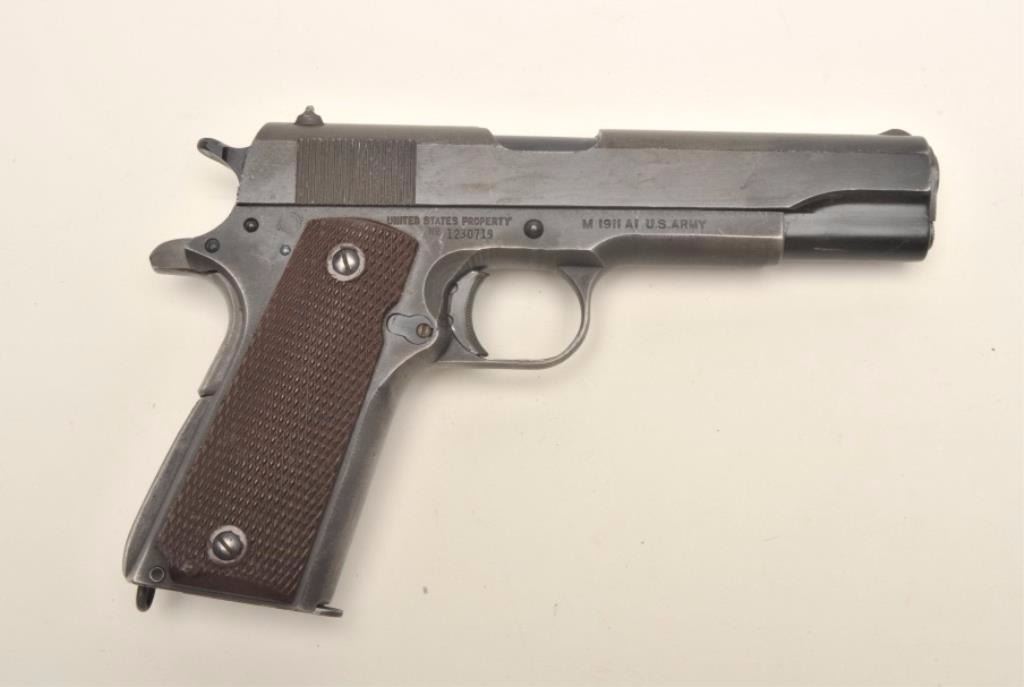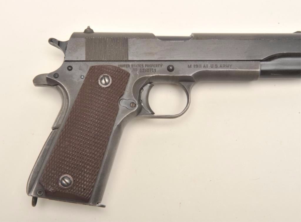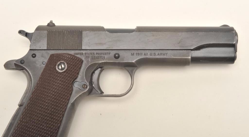 Colt United States Property Model 1911-A1 semi-automatic pistol, .45 caliber, 5” barrel, two tone green and black (at muzzle area) military finish, checkered brown plastic grips, S/N 1230719, in overall finecondition showing approximately 98% original military finish, fine bore, crisp action, sharp markings and fine grips. (C&R/PPT). Est.: $1,500-$3,000.