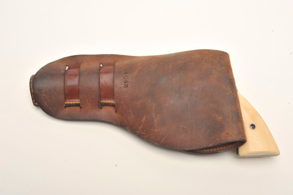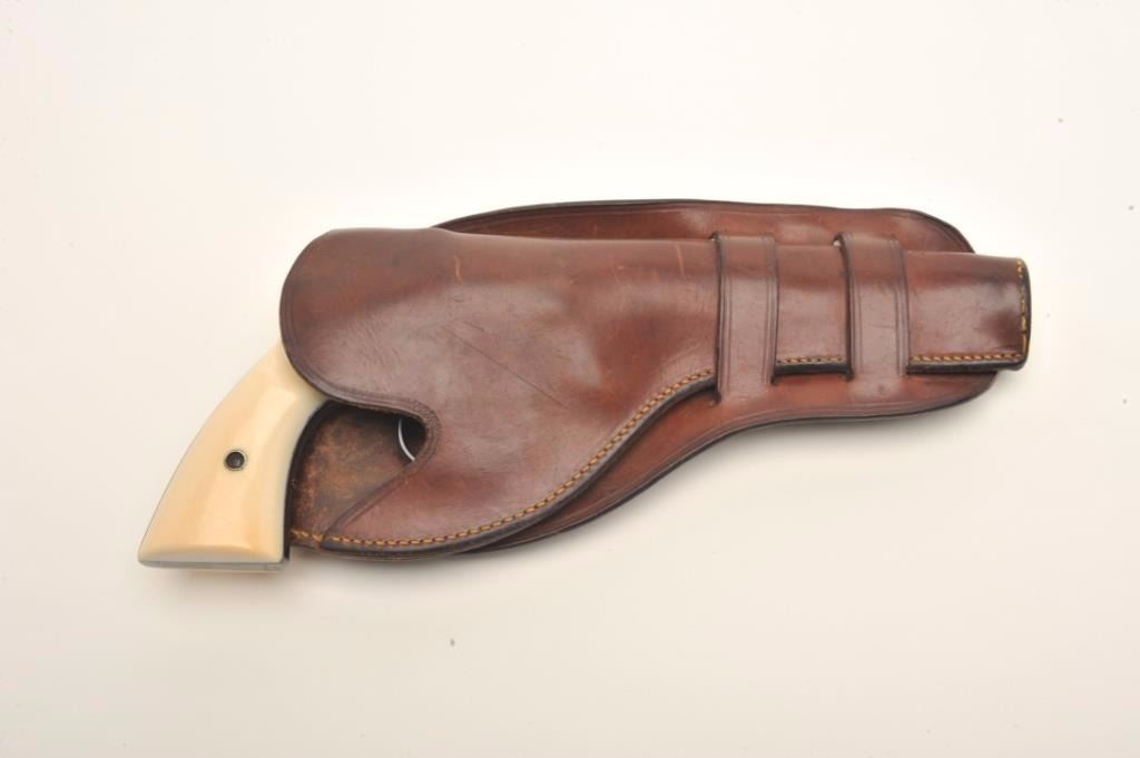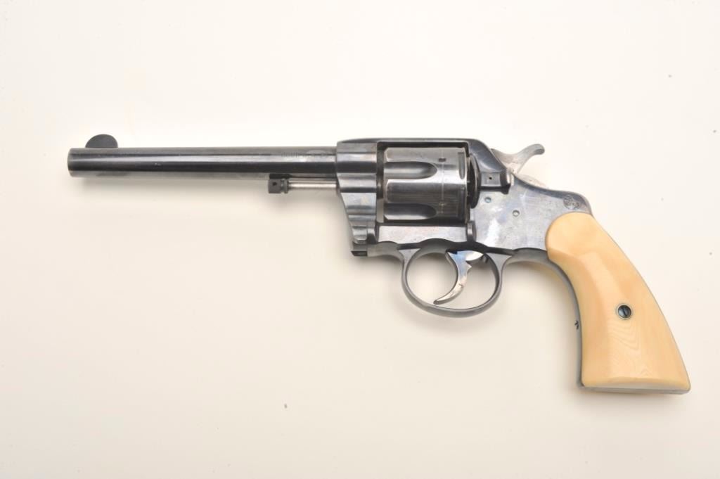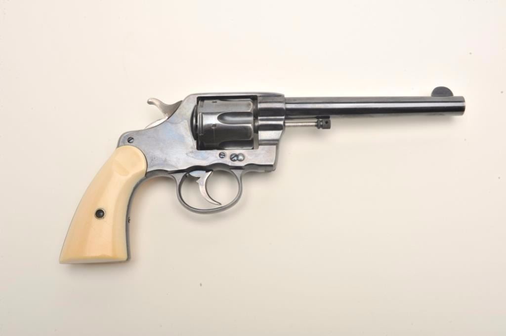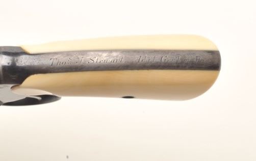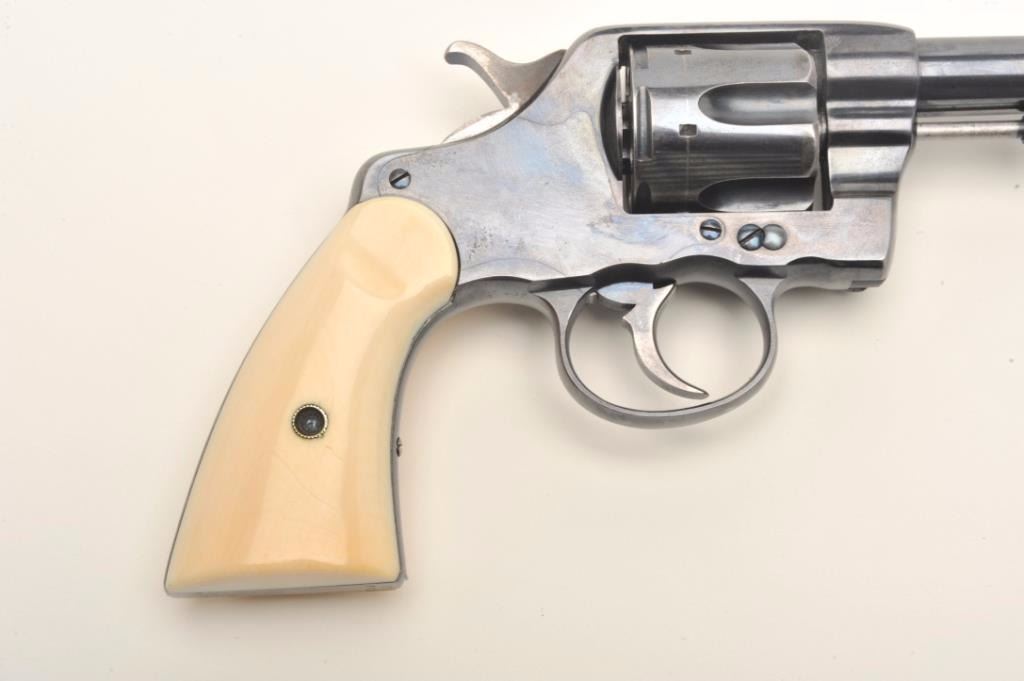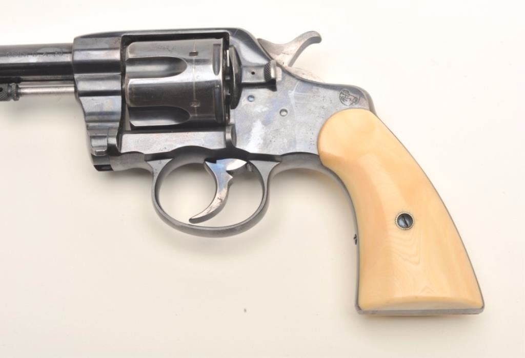 Colt Model 1892 DA 38 Long Colt revolver factory or period inscribed, "Thomas J Stewart, ADJ General of Pa" with original ivory grips, serial #87880. Made in 1897 the revolver remains in original fine conditionwith 90-95% original bright blue and near fine colt made grips. Slight handling, minor carry and use only, Thomas J Stewart was the head of Pennsylvania National Stewart was heavilyinvolved in politics, state militia, and GAR along with veterans affairs. At least 1 other presentation Colt inscribed Tothill R Hillard was shipped to Stewart. We have sent for a factory letter and will announcedetails if received by the auction. With period holster. Est. $2,000-$4,000.