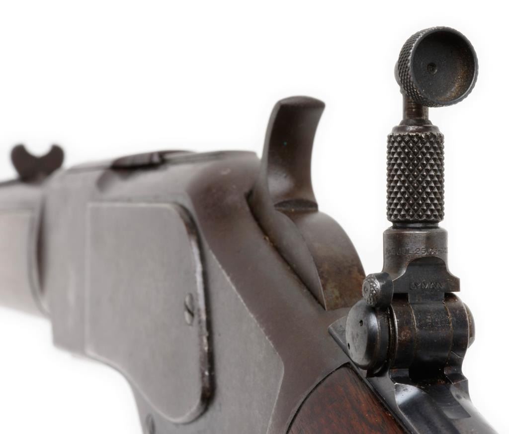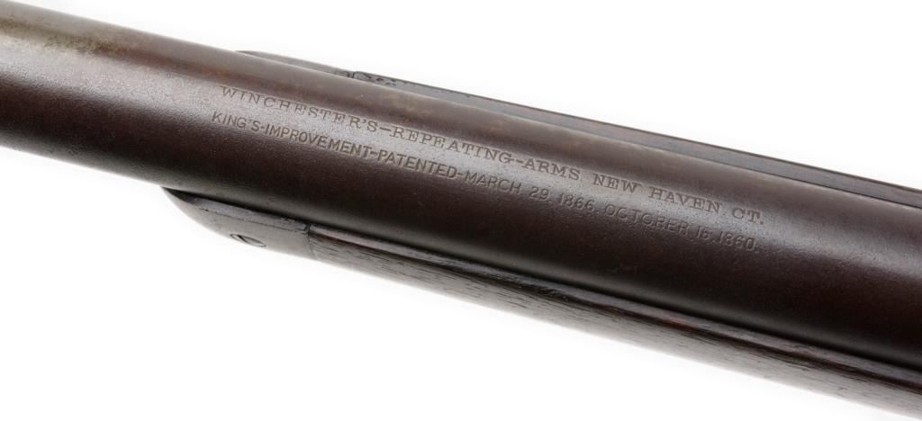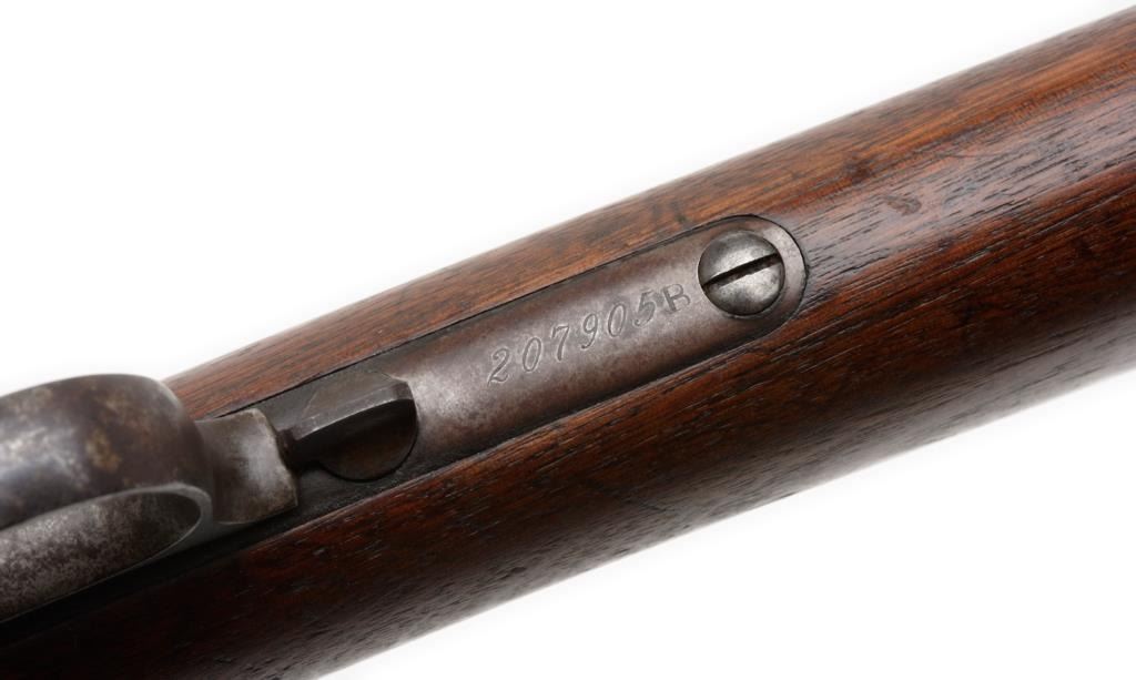 Winchester Model 1873 lever action rifle, .38-40 caliber, 24” round barrel, S/N 207905B, blued finish, half magazine, adjustable flip-up tang peep sight, wood stocks in overall very good condition showing a dark patina to metal surfaces with some scattered erosion, areas of original blue finish on the receiver and traces in protected areas of the barrel; fine bore, crisp action and markings; very good woodwith some staining to the forend and scattered old mars and dings from use and storage. Original factory letter included confirming features and noting receipt in warehouse on July 7, 1886 with shippingaccomplished on the same date to order number 6874. Est.: $1,750-$3,500.