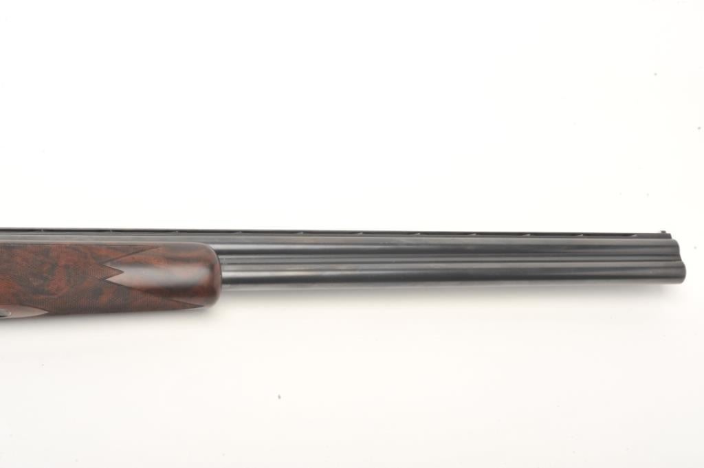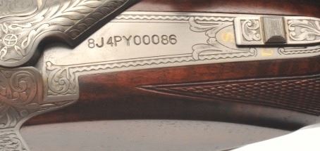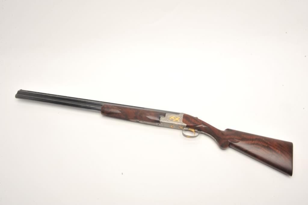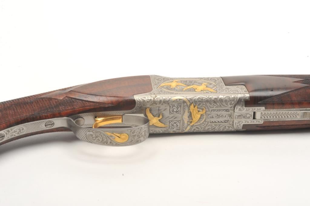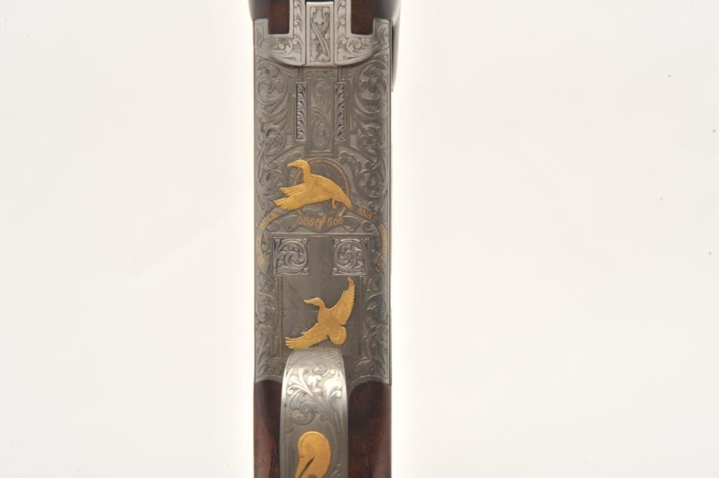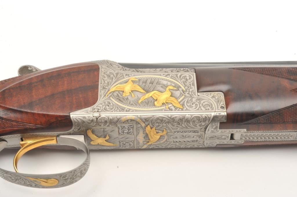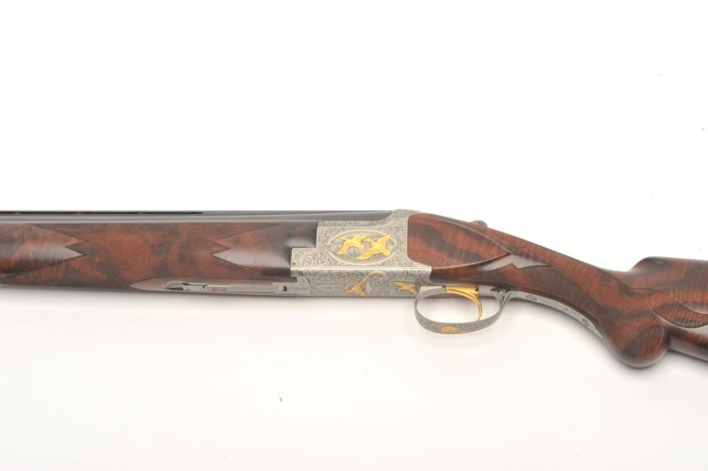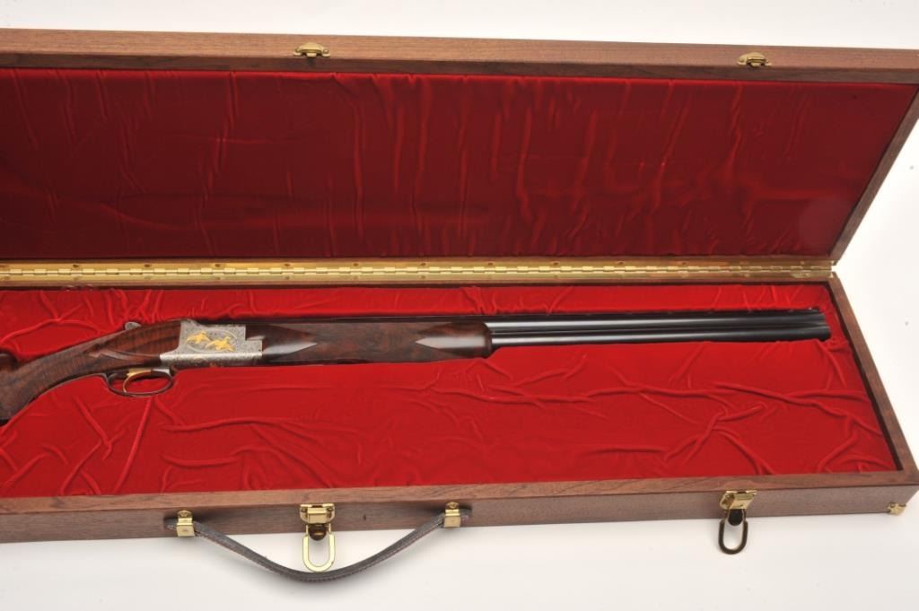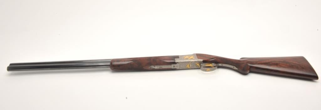 Browning Superposed High Grade Black Duck Model O/U shotgun, 12 gauge, serial #8J4PY00086. This shotgun, along with the two prior lots, comprises three matched examples of the Browning Waterfowl Superposed Series. According to the consignor, only 13 Waterfowl sets with matching serial numbers were produced. This high grade, Belgian made Browning is as new in the box with 28” barrels featuring a full-length ventilatedrib and ivory bead front sight. The upper barrel is modified choke while the lower is full choke. The shotgun barrels retain nearly all of their blued finish with only the lightest of handling marks. The coinfinished, relief engraved receiver is finished in the white with gold inlayed game scenes on both sides depicting Black Ducks. The underside of the action is marked 086 of 500 in gold, indicating the limitedproduction of the series. The shotgun comes in the original box with all associated paperwork and manuals. The finely checkered wood stocks are in excellent condition with beautiful, oil finished American Walnut burl