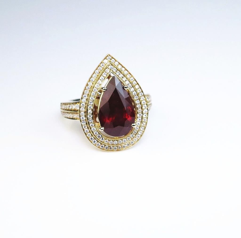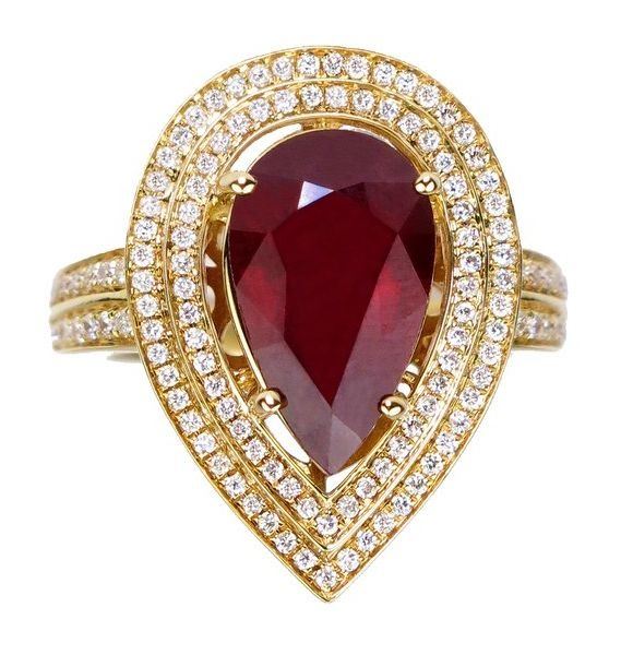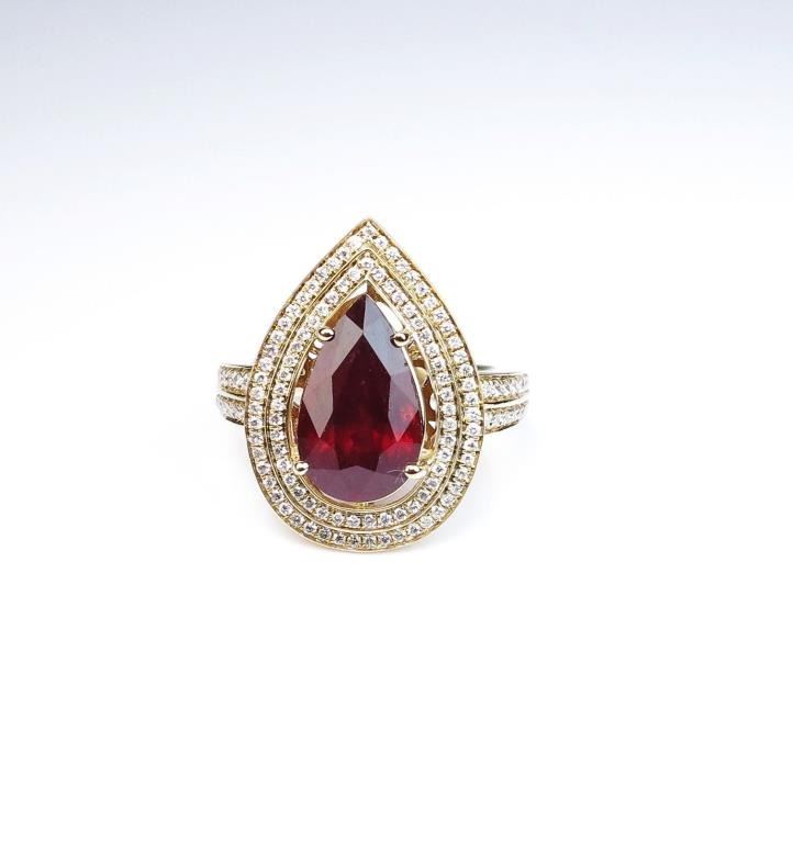 Lot 200a Magnificent Ruby and Diamond Ring featuring a 5.66 carat pear shaped ruby beautifully framed with