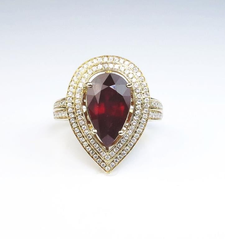 Magnificent Ruby and Diamond Ring featuring a 5.66 carat pear shaped ruby beautifully framed with a double row of 120 micro set diamonds weighing approx. 2.00 carats of G-H colors and SI clarity set in 14 karat yellowgold. Retail $5,000-$6,000 Estimates $2,000-$3,000