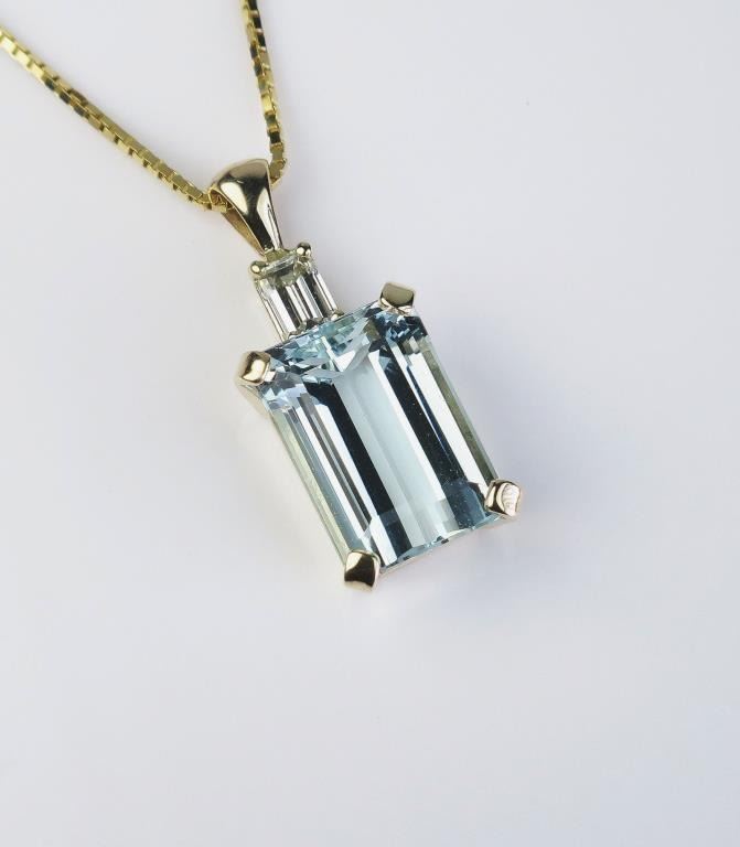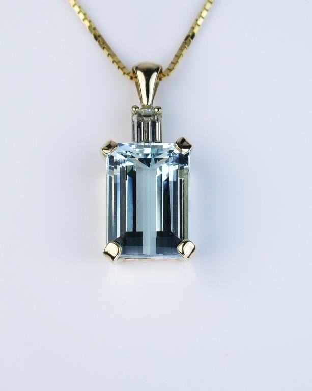 Fine Quality Aquamarine and Diamond Pendant featuring an approx. 8.00 carat aquamarine accented with an emerald cut diamond weighing approx. 0.50 carats with I color and VVS clarity set in 14 karat yellow gold. Retail$3,000-$4,000 Estimates $2,000-$3,000 Nice