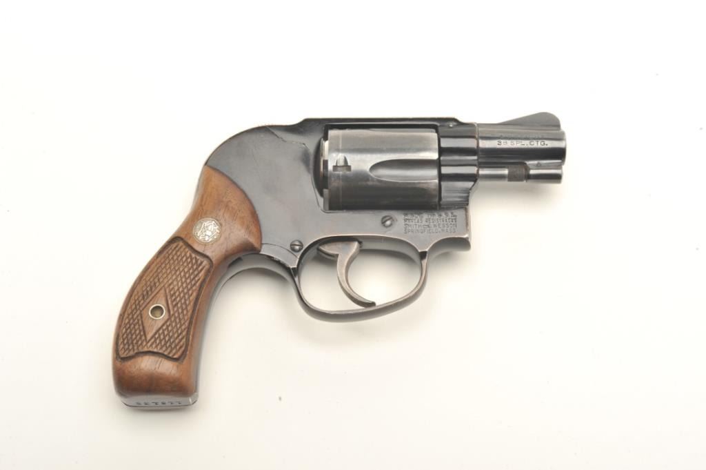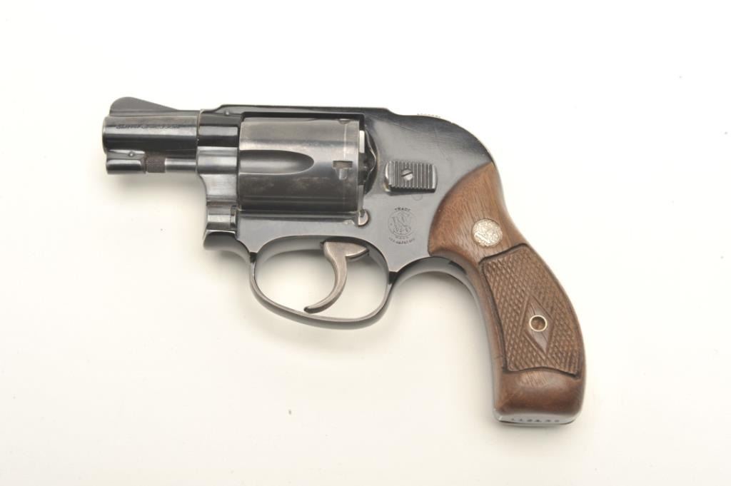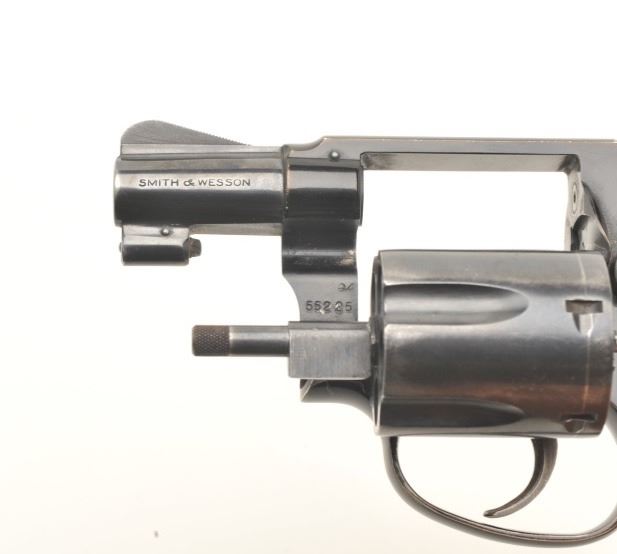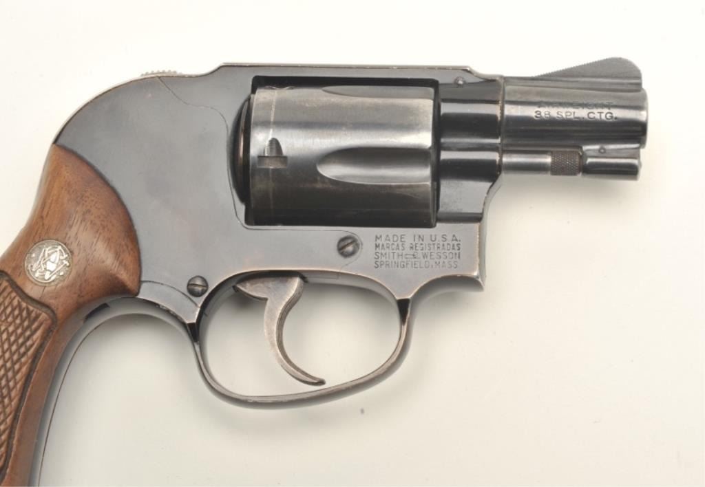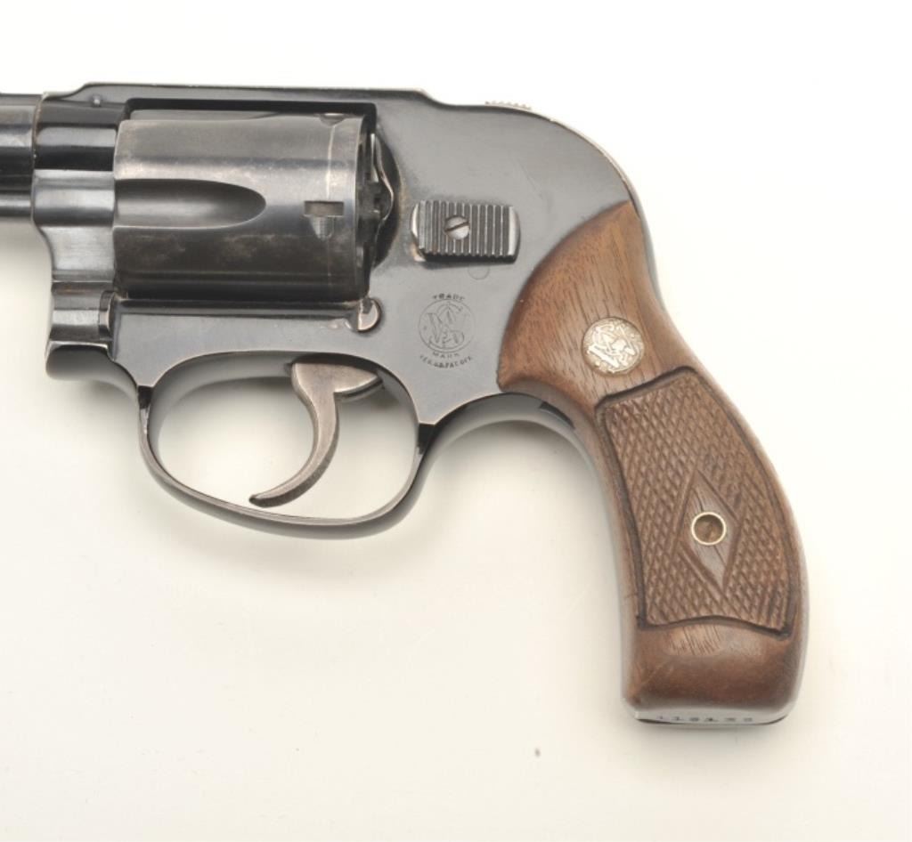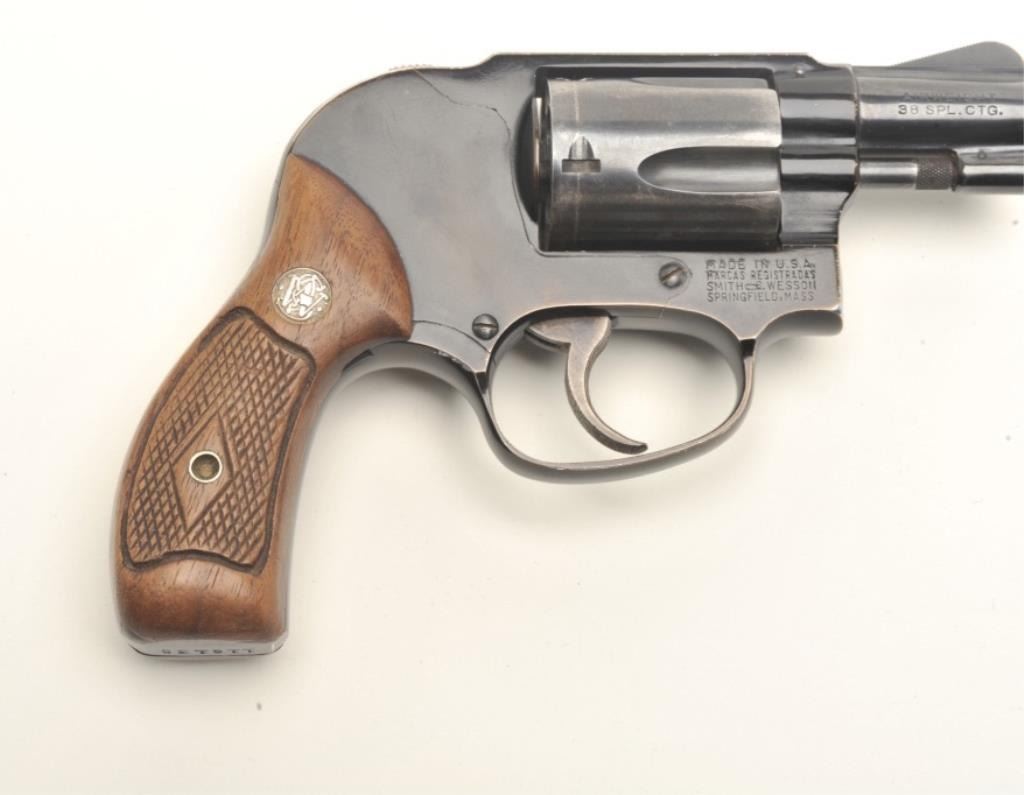 Smith & Wesson early flat latch Airweight DA revolver, .38 Special caliber, 2” pinned barrel, blued finish, checkered wood medallion grips, S/N 116135, in overall very good + condition showing the majority of itsoriginal blue finish, very good bore, crisp action, sharp markings and very good grips. (C&R/PPT). Est.: $400-$800.