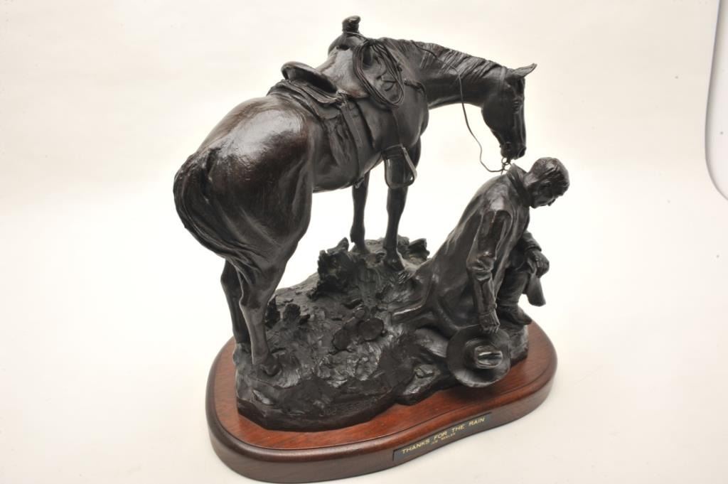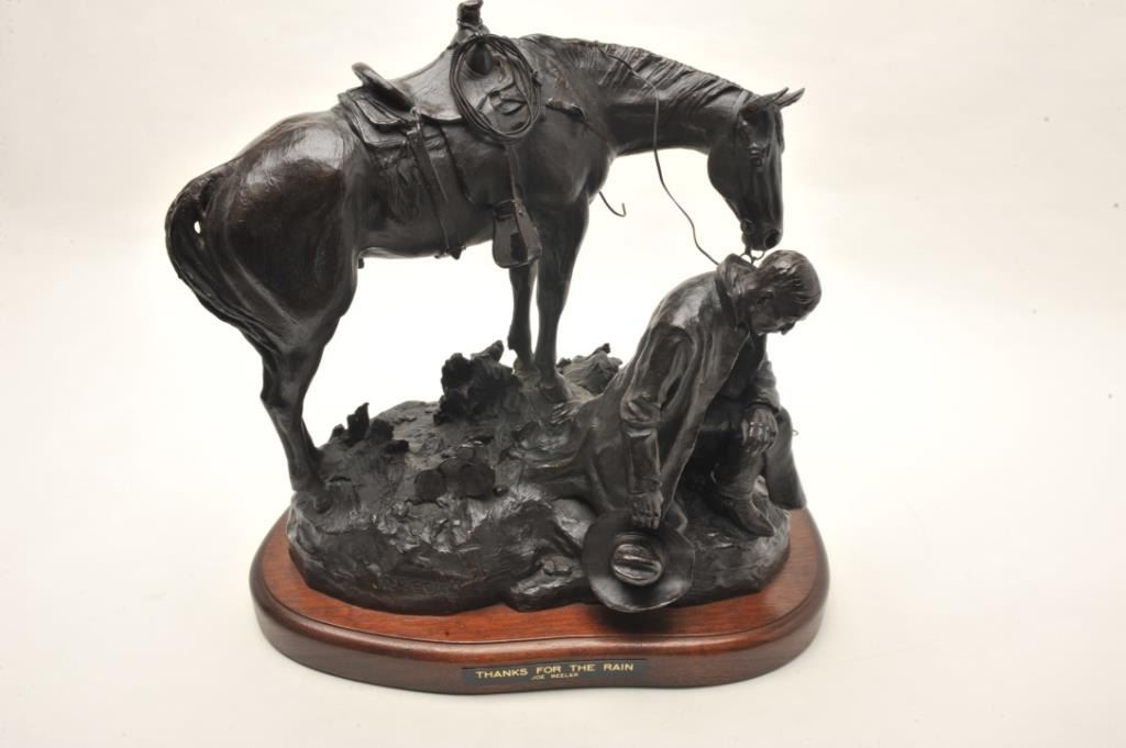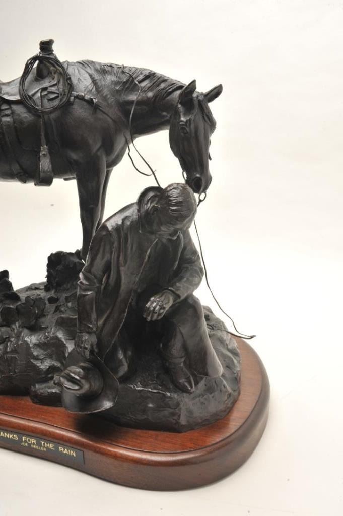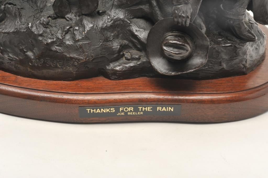 Original Bronze entitled "Thanks for the Rain" by Joe Beeler numbered 8 of 50. Approx. 20" in ht. on original wood base with title. One of Beeler's Best Western Subjects and from a Major Southern California ArtCollector. Joe Beeler now desceased was a real Cowboy Artist who died in the saddle in Sedona, Arizona and was a Co-Founder of C.A. Artists along with Charlie Dye. Est:$2,500-5,000