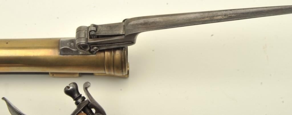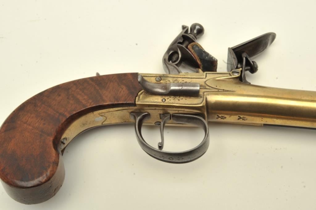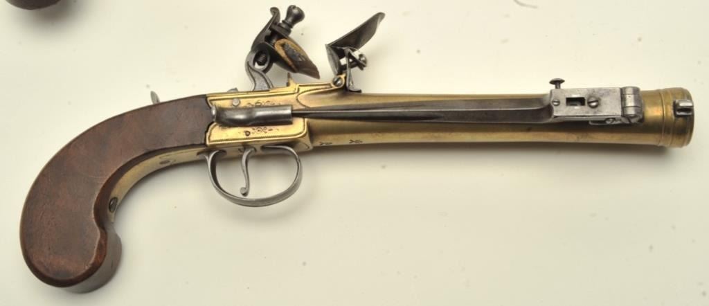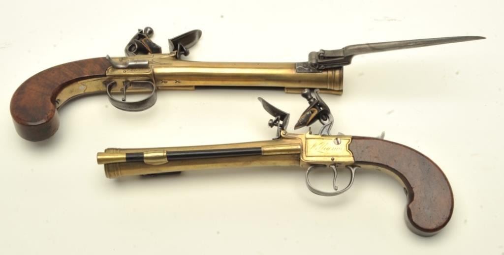 Lot 211a Pair of brass blunderbuss pistols with side mounted spring bayonets and ramrods signed “Williams”