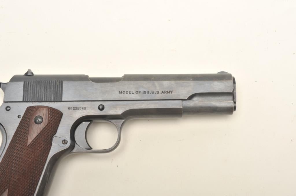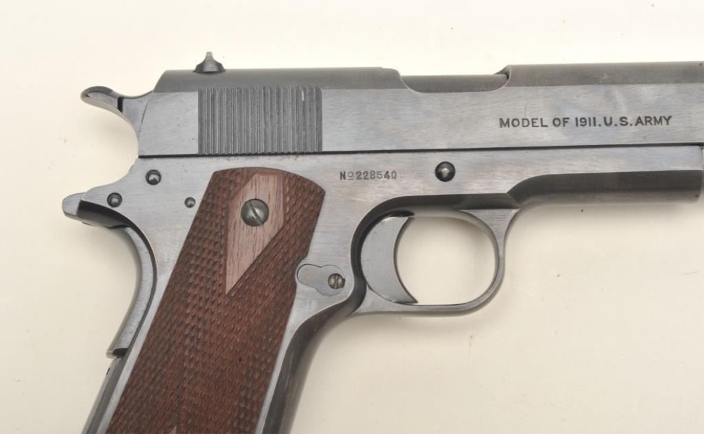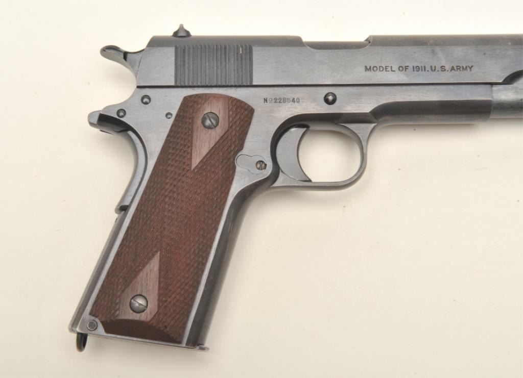 Colt United States Property Model 1911 semi-automatic pistol (ca. 1918), .45 caliber, 5” barrel, blued finish, checkered wood grips, S/N 228540, in overall fine condition showing approximately 99% originalmilitary finish, crisp action, sharp markings, fine bore and fine grips. (C&R/PPT). Est.: $3,000-$6,000.