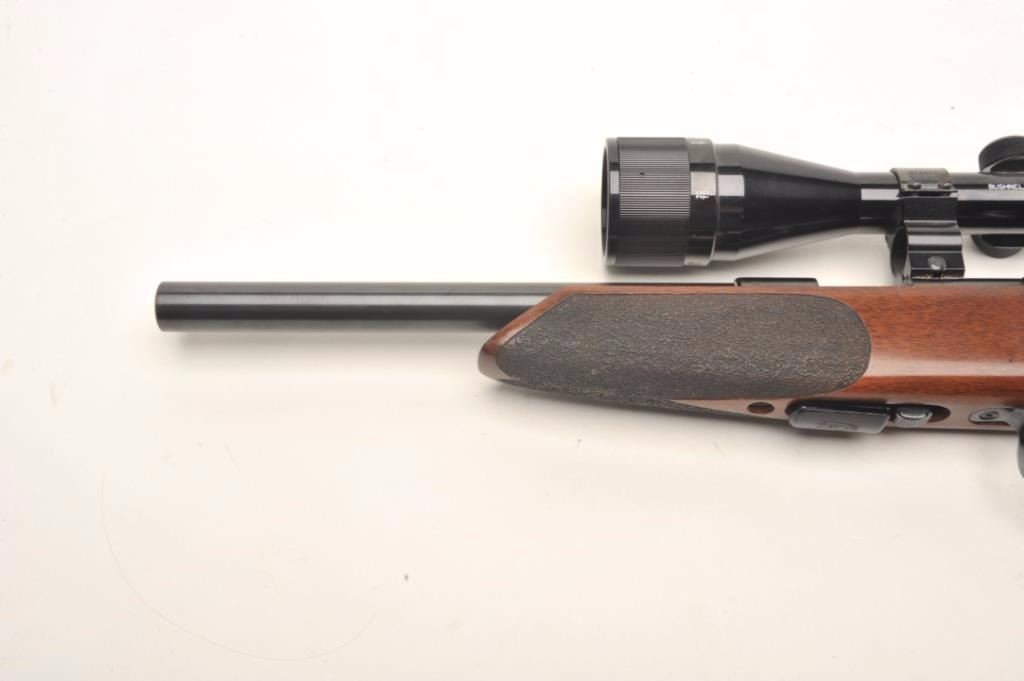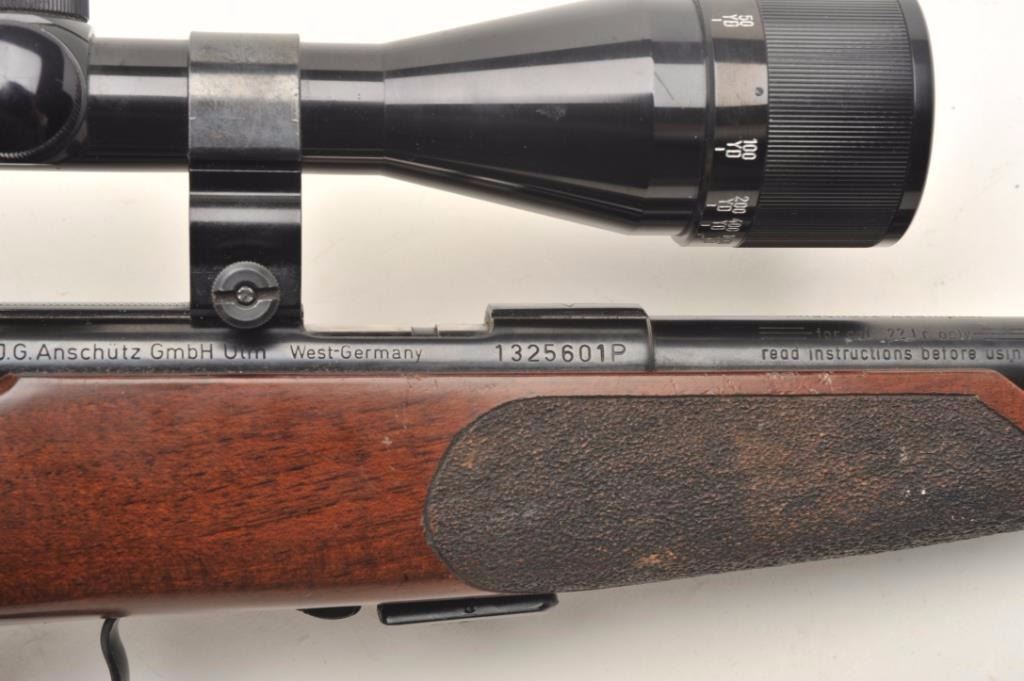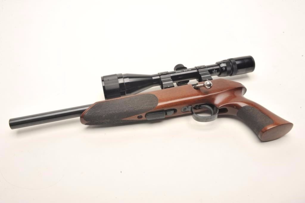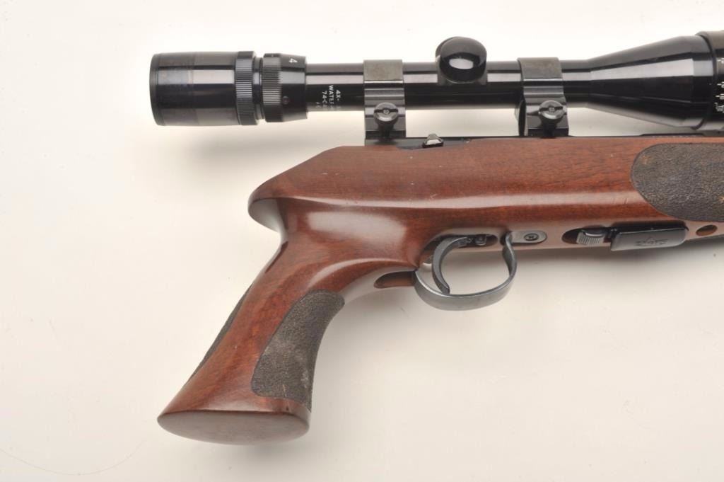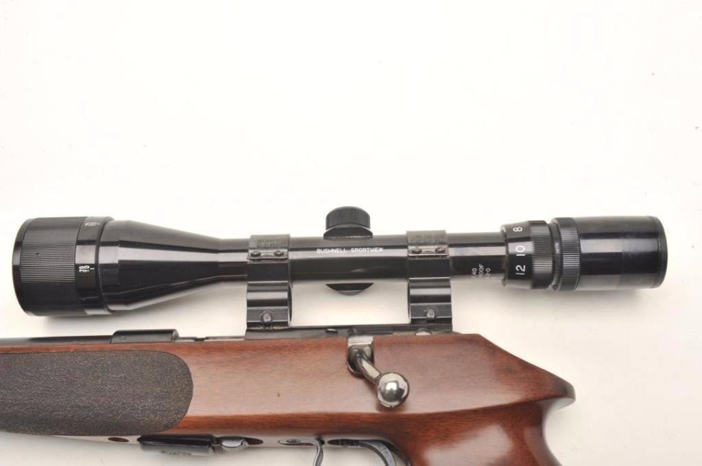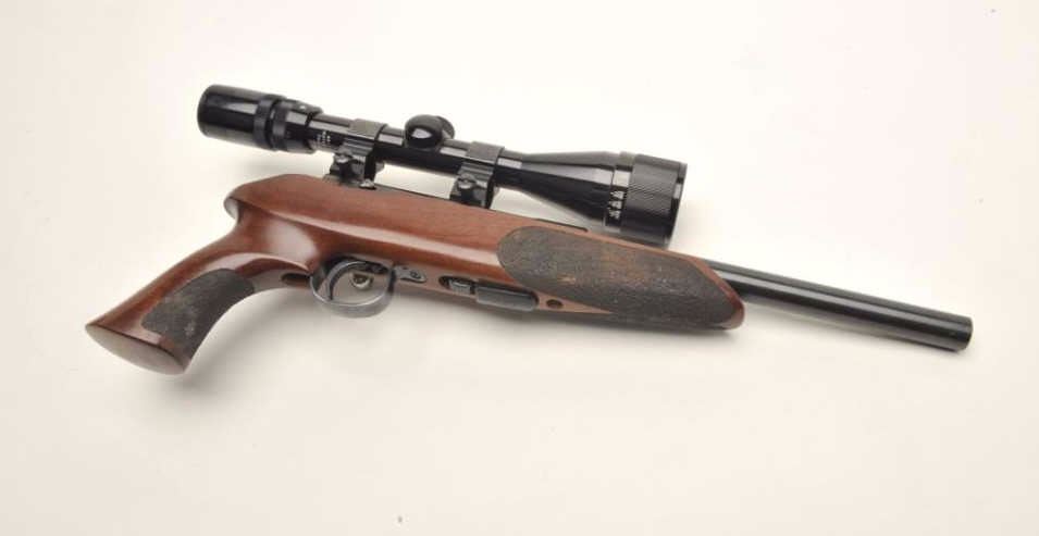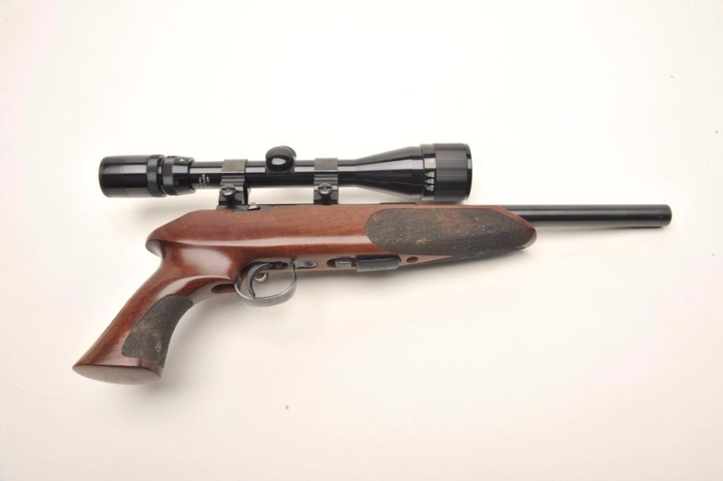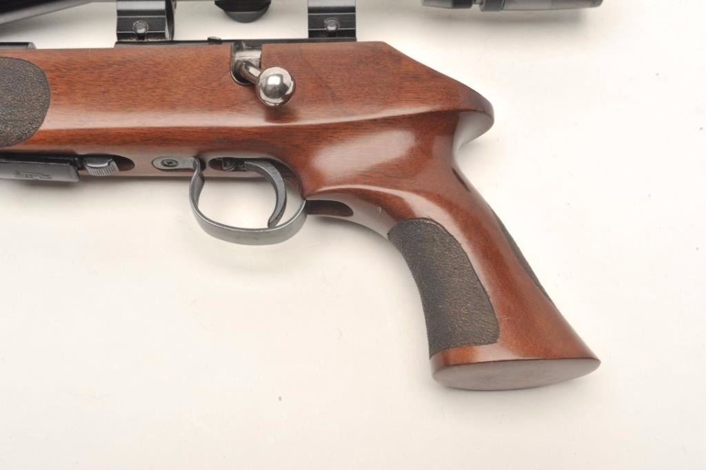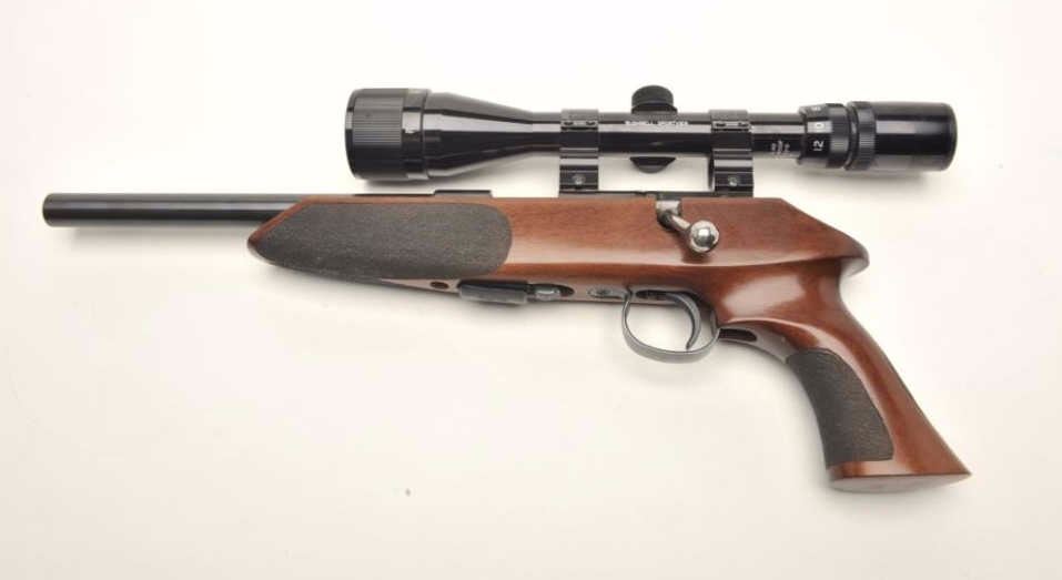 Anschutz Exemplar .22 L.R. Bolt Action pistol with detachable clip, left handed bolt, 10 ½” barrel, 20” overall and mounted with Bushnell variable scope on see through mounts. West German manufacture. S/N1325601P. High quality. Fine to almost excellent used condition overall. Est.: $600-$1200