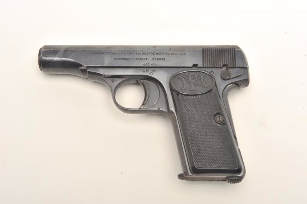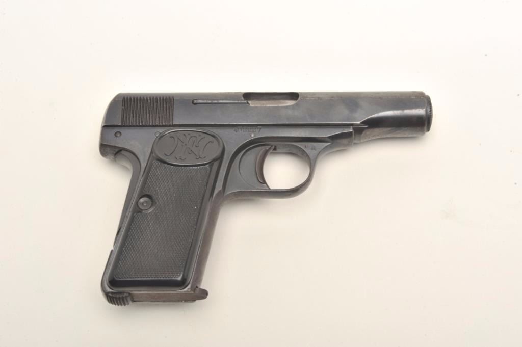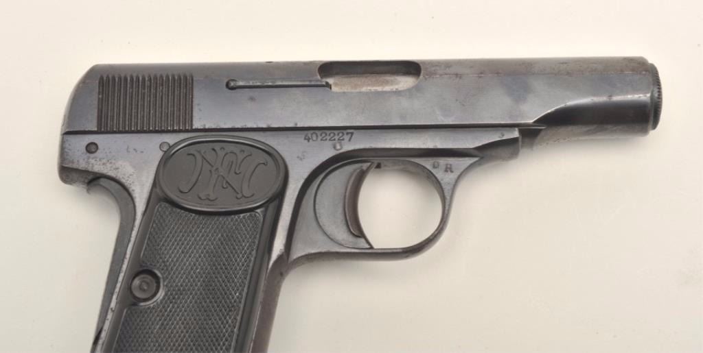 FN Model 1922 semi-automatic pistol, .32 ACP caliber, 3.25” barrel, blued finish, checkered black grips, S/N 402227, in overall good to very good condition displaying the majority of its original muted blue finish,good bore, action, markings and grips. (C&R/PPT). Est.: $150-$250.