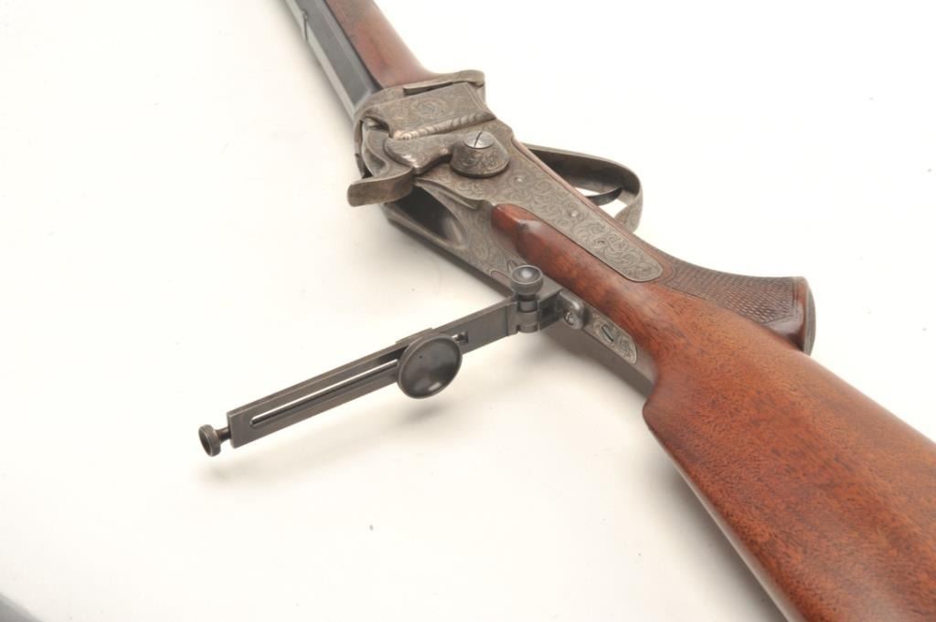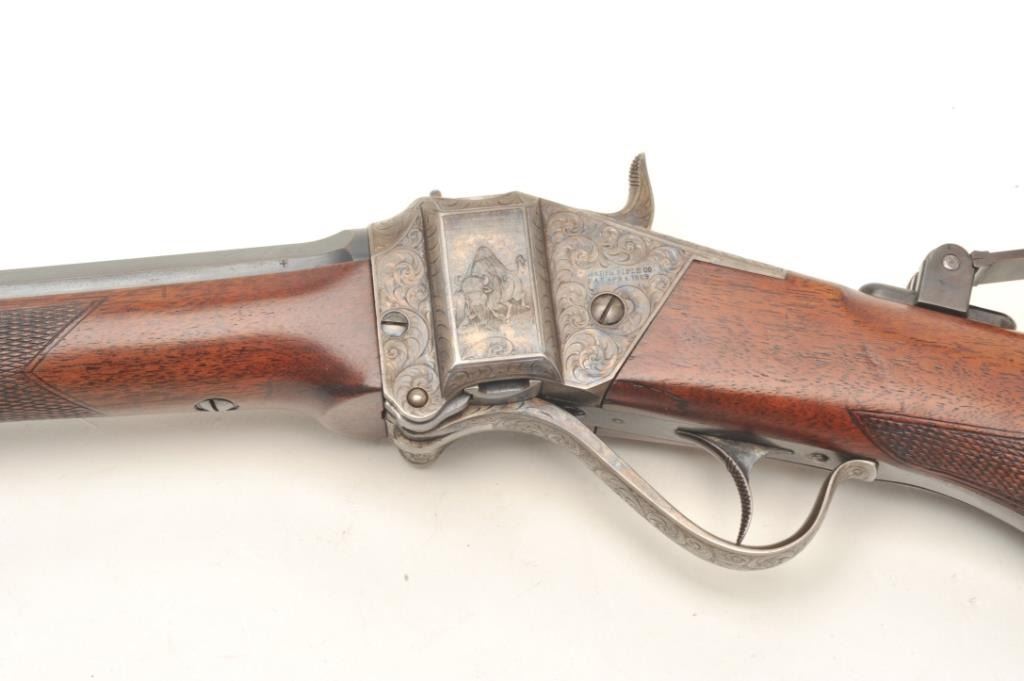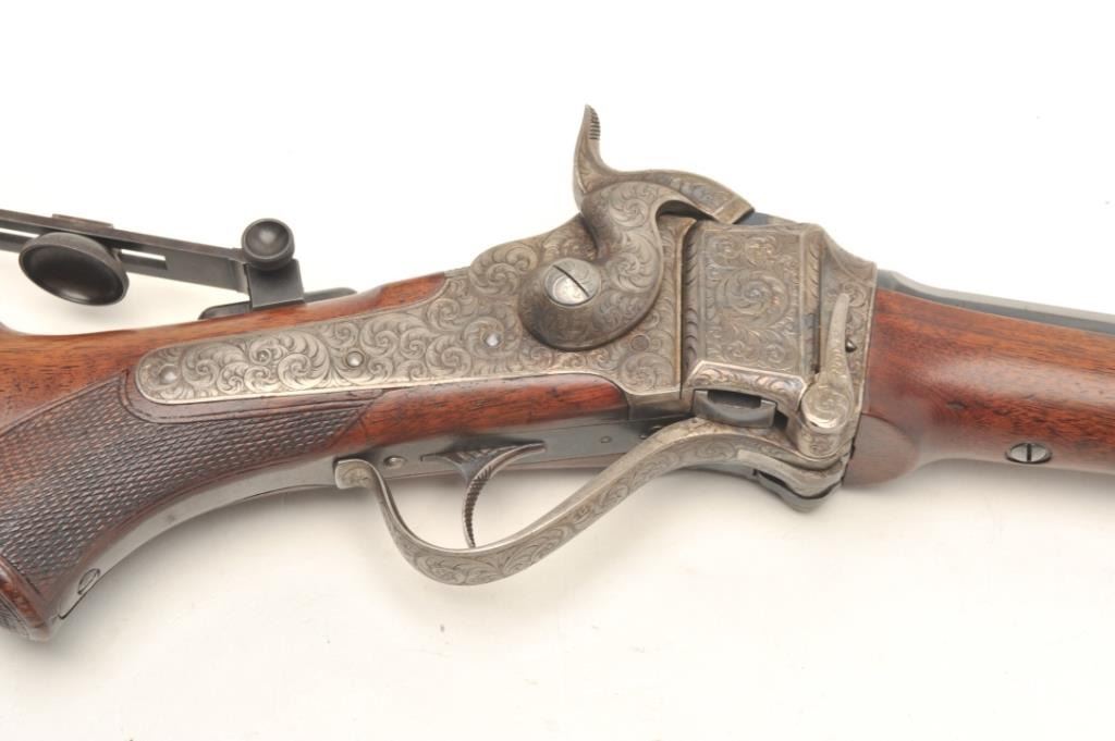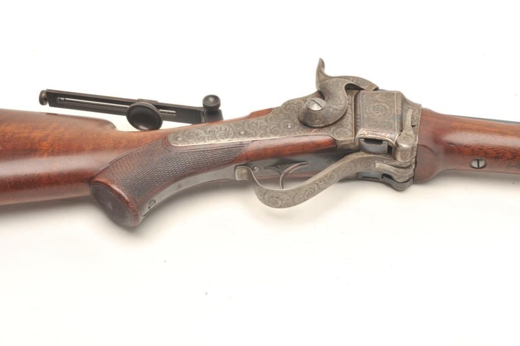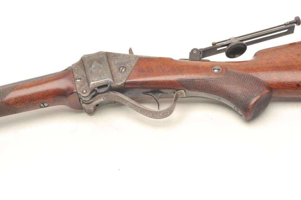 Sharps Model 1874 Creedmoor Target Rifle #1, .44-90 caliber, 34” octagon barrel, spirit level front sight and vernier tang sight, finely engraved receiver and hammer including a period engraved panel scene of a buffaloon the left side receiver flat; blued finish to barrel and case hardened receiver, checkered deluxe wood stocks and checkered shotgun butt plate with engraving at the top and bottom of the plate, S/N 155005. This gun is in overall fine to excellent condition showing the majority of its blued finish on the barrel and scattered areas of case color on the receiver; the bore is fine, the action crisp, the markings clear and the engravingis outstanding; the wood stocks are fine overall with 3 old holes on the rear top of the butt stock where likely the tang sight could be repositioned if so desired by the shooter of the gun. This exceptional pieceis accompanied by a factory letter from the late Dr. Robert L. Moore, dated 1991, who at the time was the owner of the original Sharps Rifle Co. records. He states “Your Sharps Rifle serial number 155005 has been located