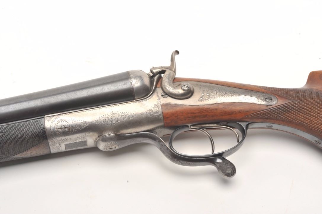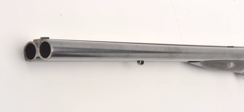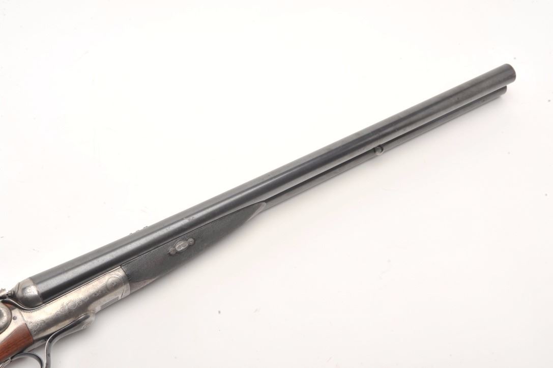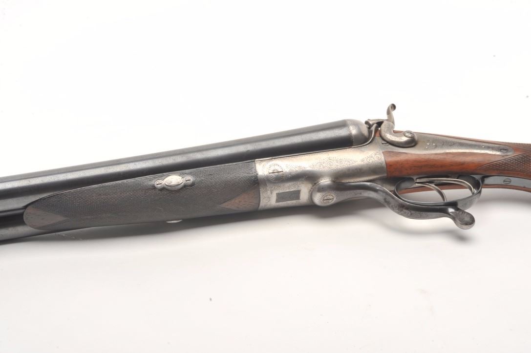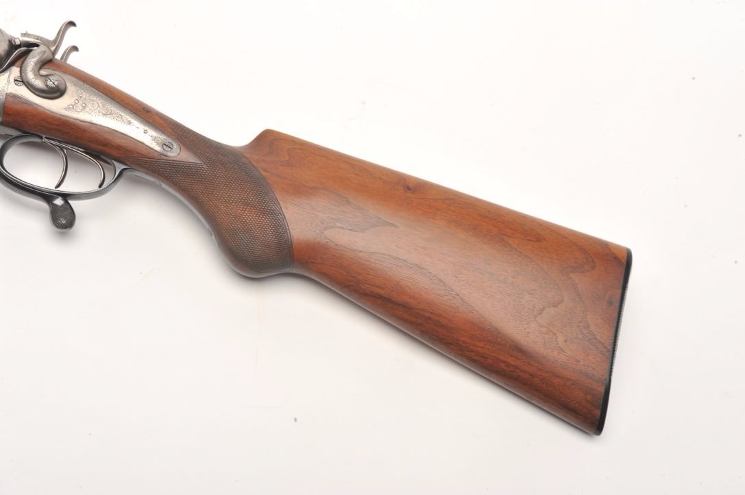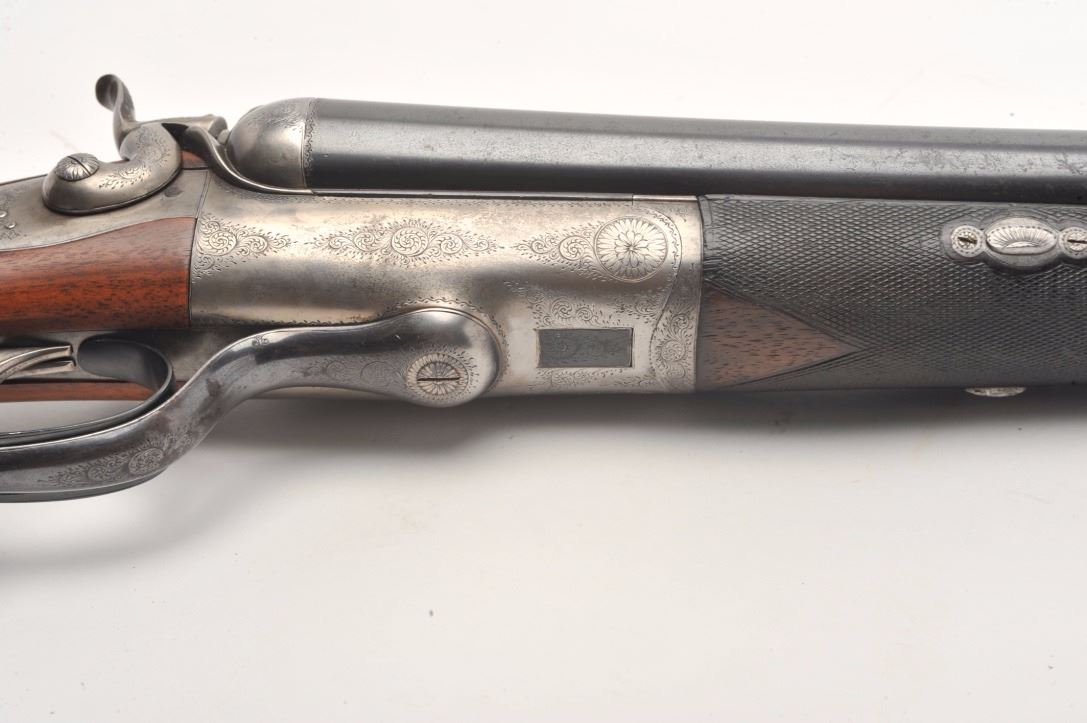 Massive under lever hammer double rifle, 8 bore with extra smoothbore set of barrels, rifled barrels measure 26” and smoothbore barrels measure 37.5”; blued and case hardened finish, back action locks, fulllength polished rib with three leaf express sight on the rifle barrels, no visible S/N; in overall very good to near fine condition with the majority of an old re-blue finish to barrel sets and muted case colors withtasteful border engraving; action is tight on the face, near fine bores on both sets; wood is in overall very good condition with good figure and checkering and Prince of Wales pistol grip; hard plastic butt plate and15.25” LOP. A high quality European double rifle with extra set of smoothbore barrels to boot! (Antique). Est.: $17,000-$20,000.