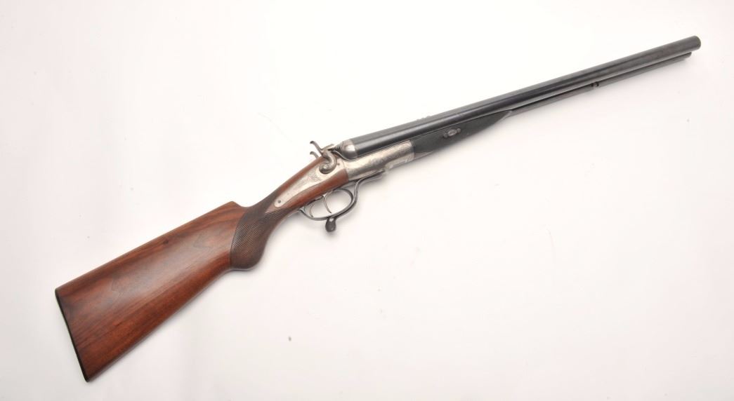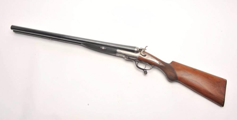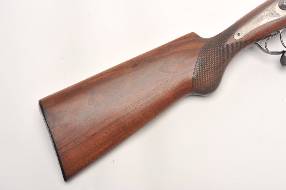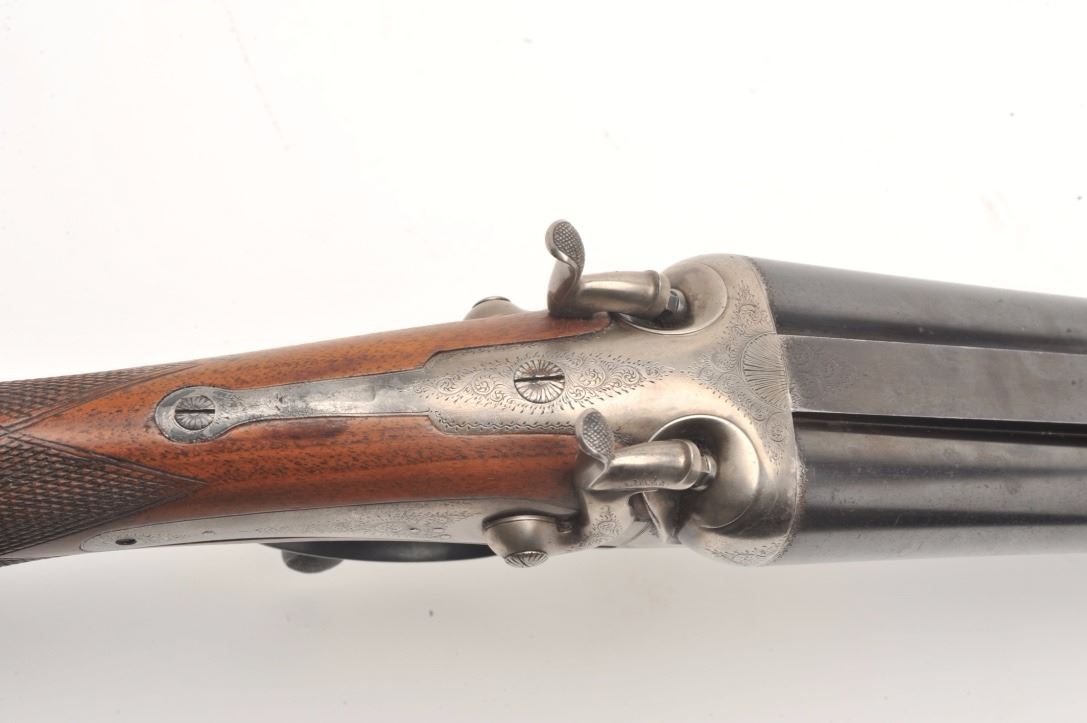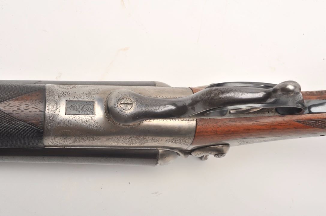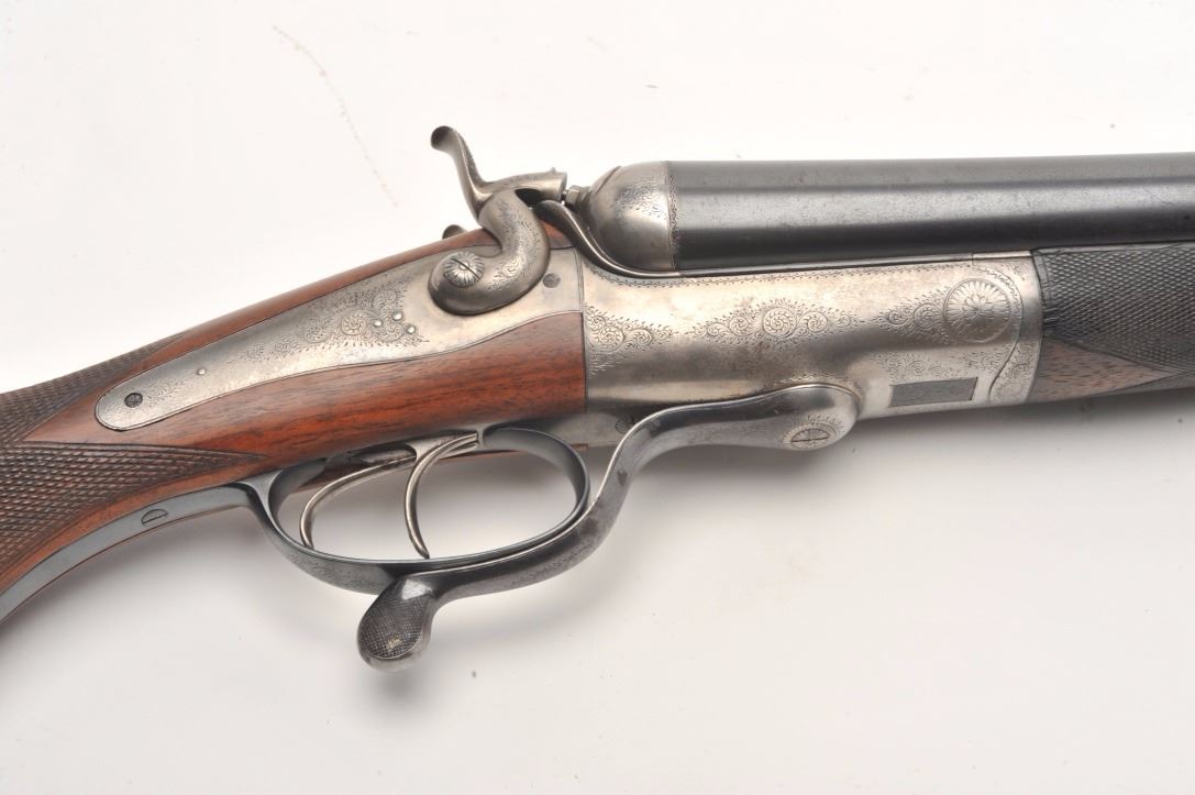 Massive under lever hammer double rifle, 8 bore with extra smoothbore set of barrels, rifled barrels measure 26” and smoothbore barrels measure 37.5”; blued and case hardened finish, back action locks, fulllength polished rib with three leaf express sight on the rifle barrels, no visible S/N; in overall very good to near fine condition with the majority of an old re-blue finish to barrel sets and muted case colors withtasteful border engraving; action is tight on the face, near fine bores on both sets; wood is in overall very good condition with good figure and checkering and Prince of Wales pistol grip; hard plastic butt plate and15.25” LOP. A high quality European double rifle with extra set of smoothbore barrels to boot! (Antique). Est.: $17,000-$20,000.