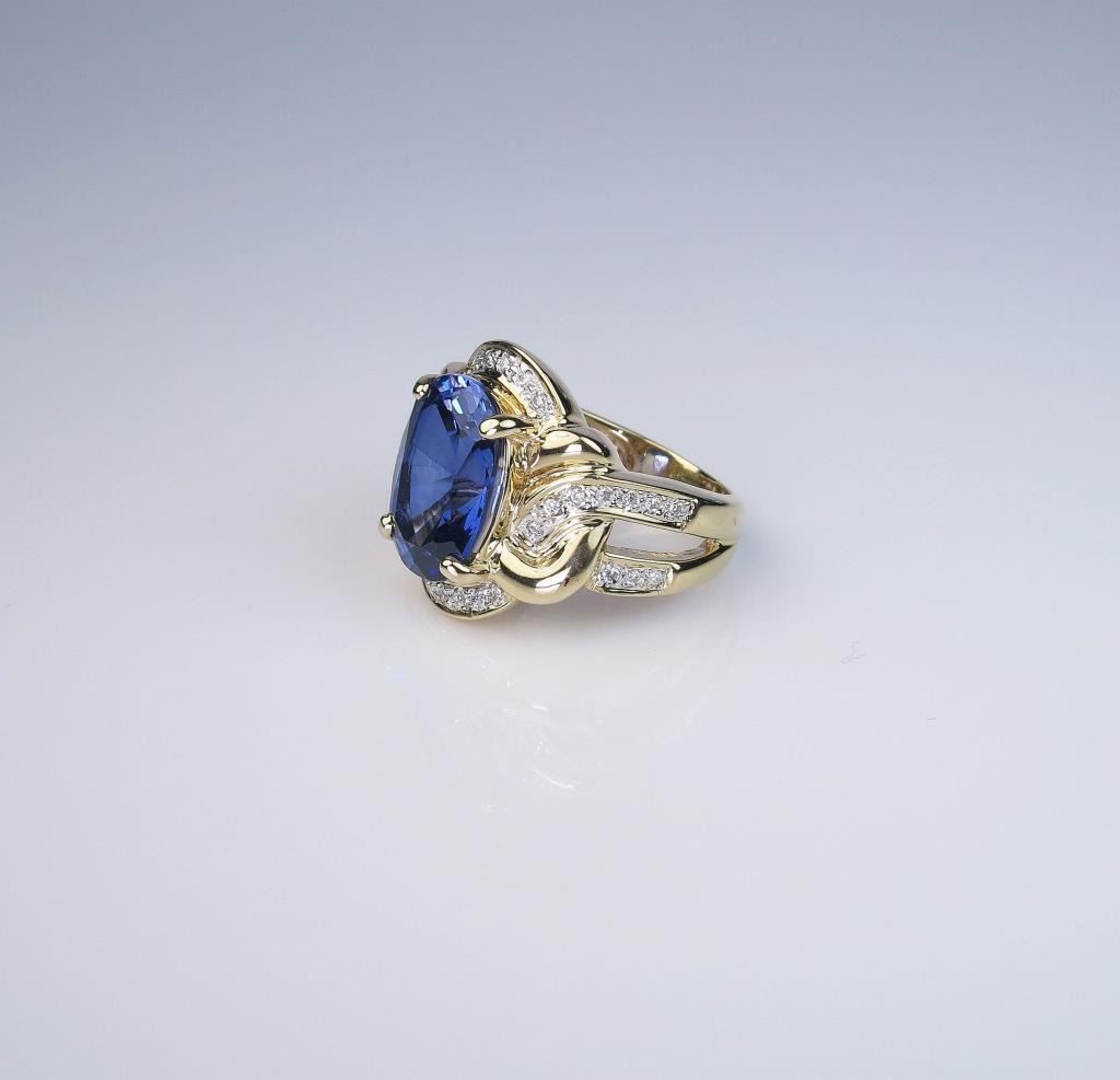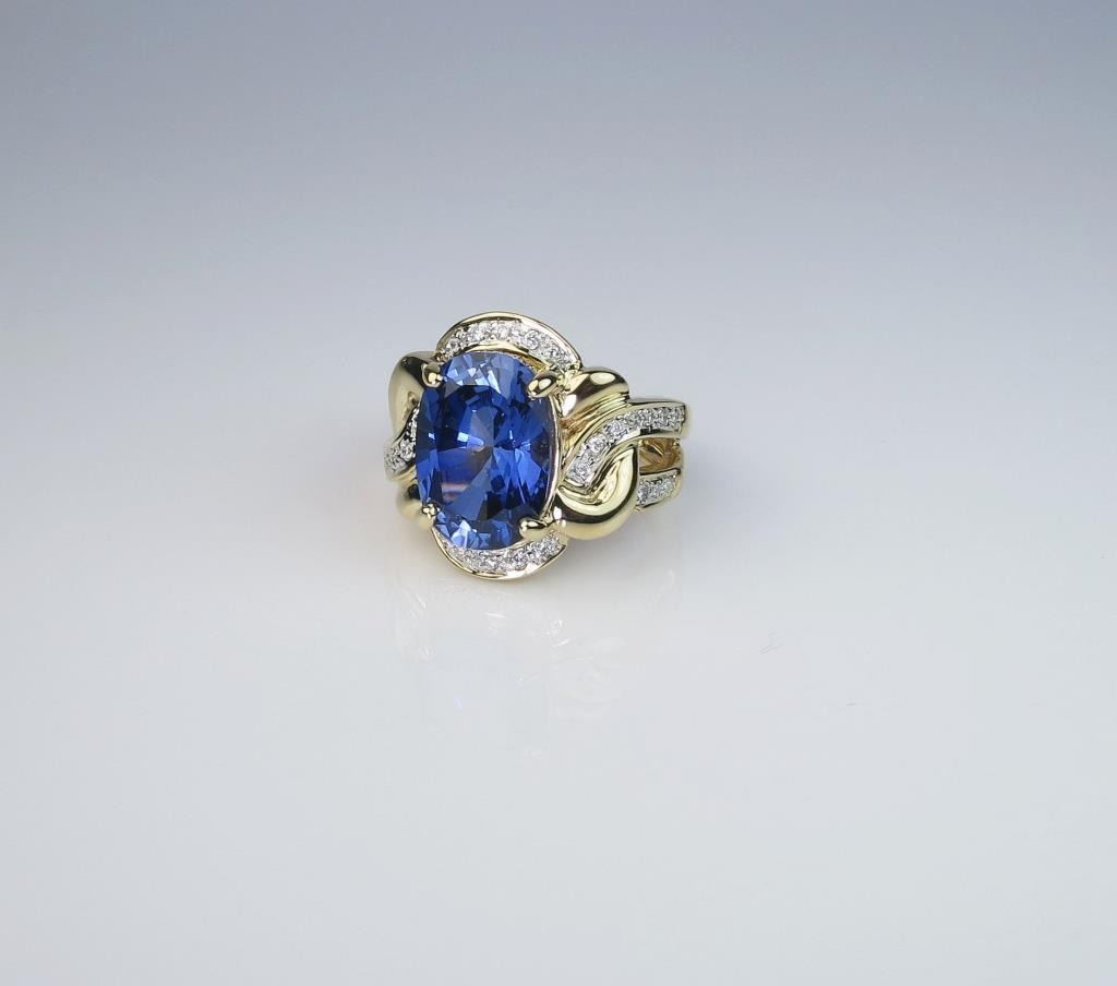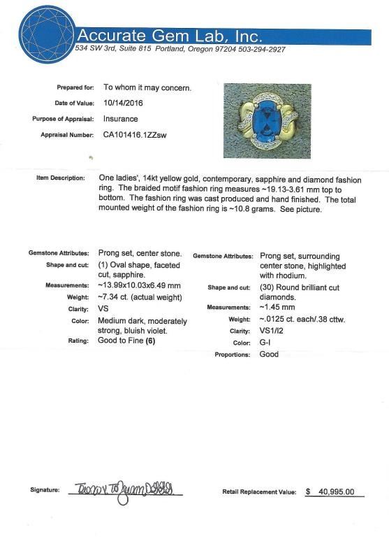 Magnificent Estate Piece 7.34 carat Ceylon colored Blue Sapphire and Diamond Ring featuring a fabulous oval blue sapphire surrounded by 30 round cut diamonds weighing approx. 0.50 carats with F-G colors and VSclarity set in a dynamic woven design crafted in 14 karat yellow gold and measuring 18 x18 mm. Please see Full Appraisal at $40,000.00 Estimates $15,000-$20,000