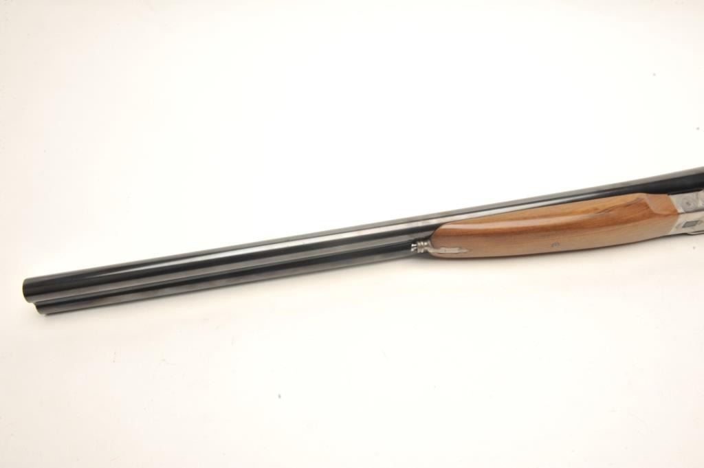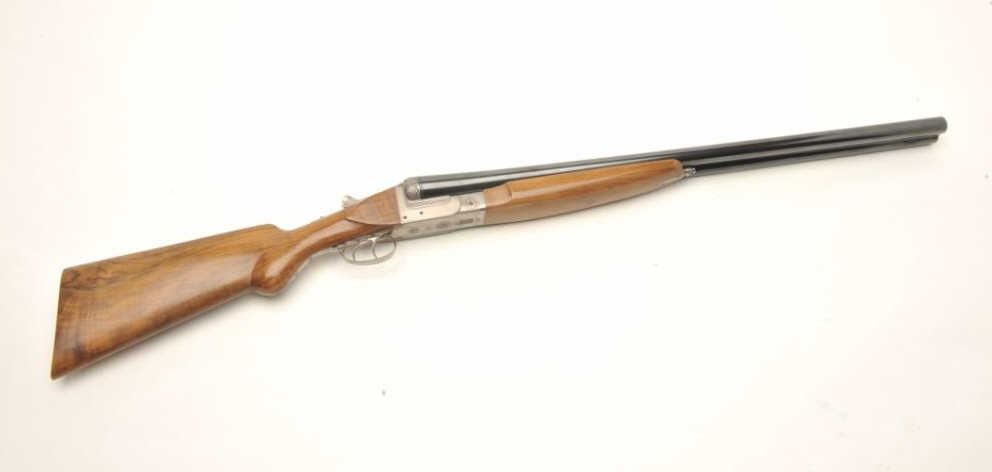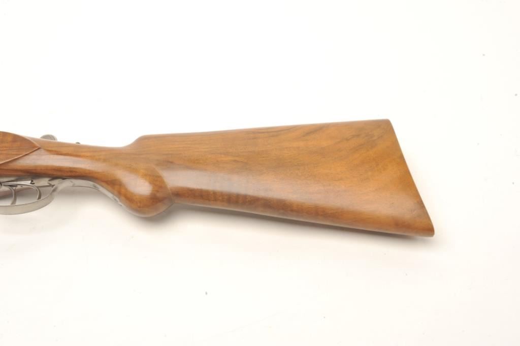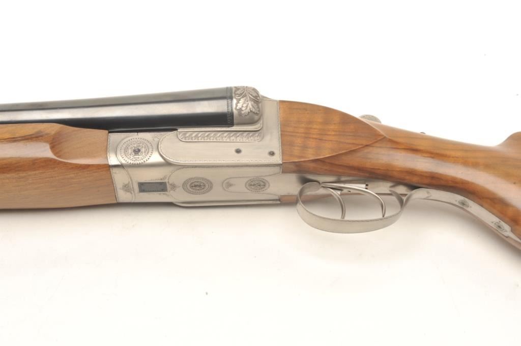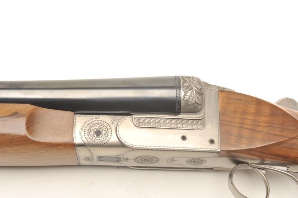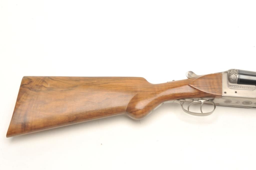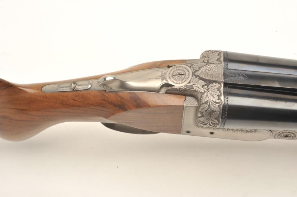 One of only two Exhibition French hammerless SxS 4 smoothbore by Petiot with 32” barrels, blued finish to barrels, full length polished rib, brass bead front sight, coin finished receiver with relief engraving, doubletriggers, tang mounted safety, smooth wood stocks with palm swell to the pistol grip and beavertail forend, 15.5” LOP to a smooth finished butt; S/N 1789.1989; crisp actions, appears tight on face, retains majority ofwhat appears to be original blued finish on barrels; wood is very good with small storage and handling mars but nothing serious. A massive European SxS with deluxe wood. Est.: $40,000-$50,000.