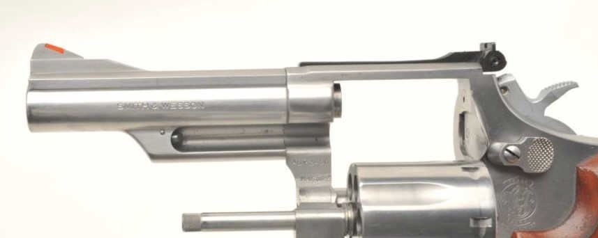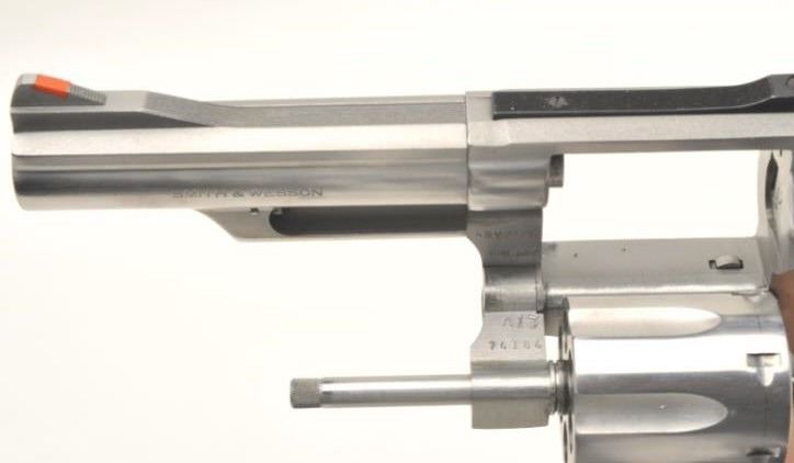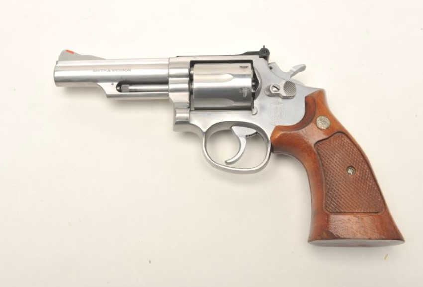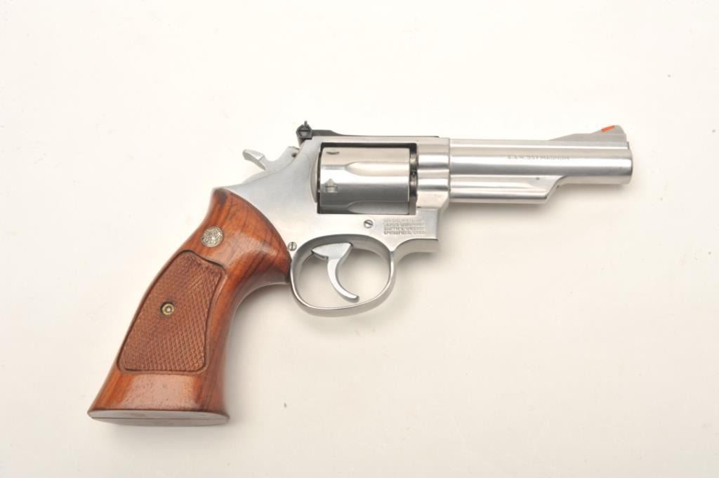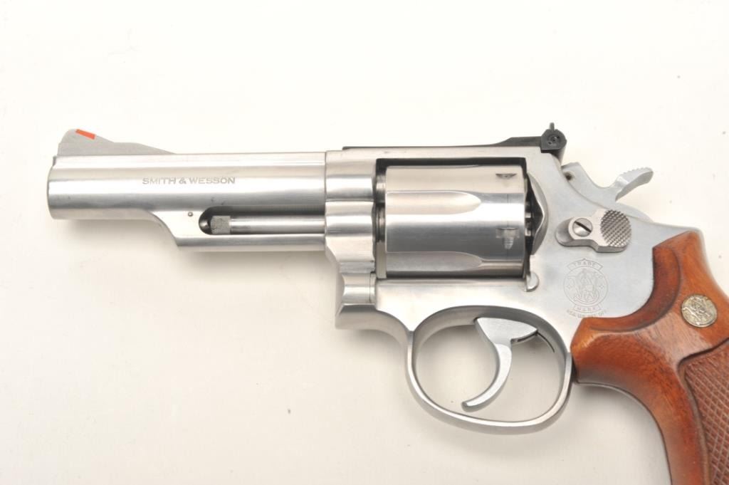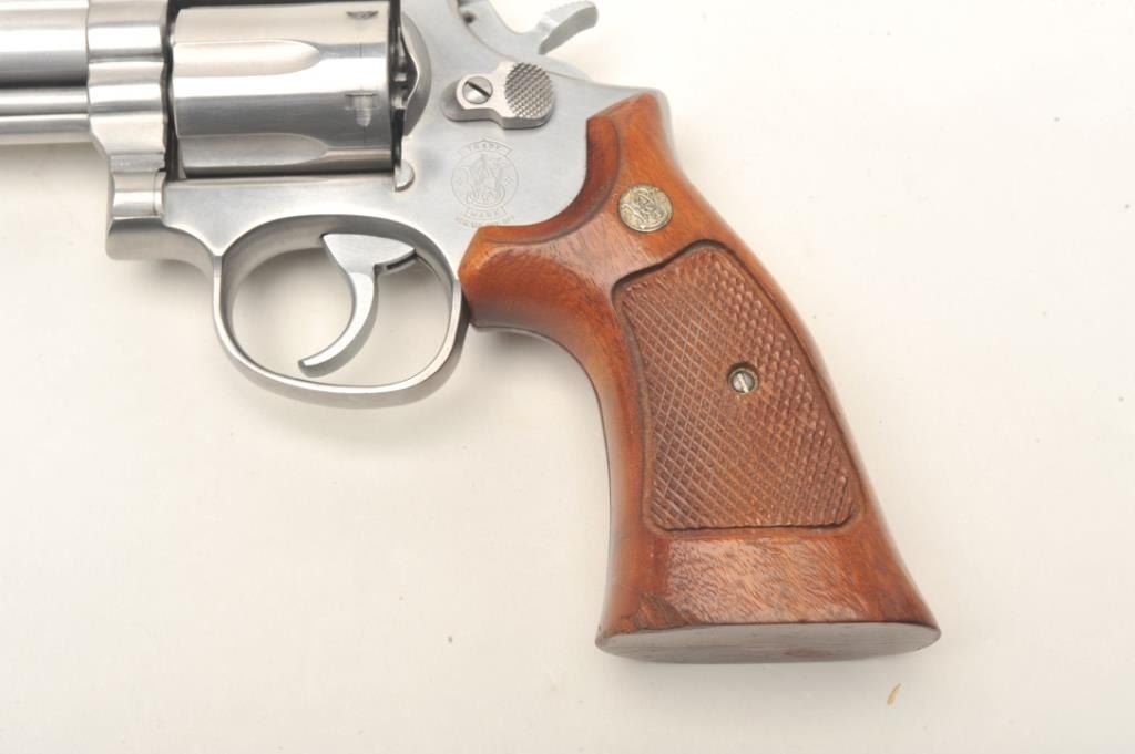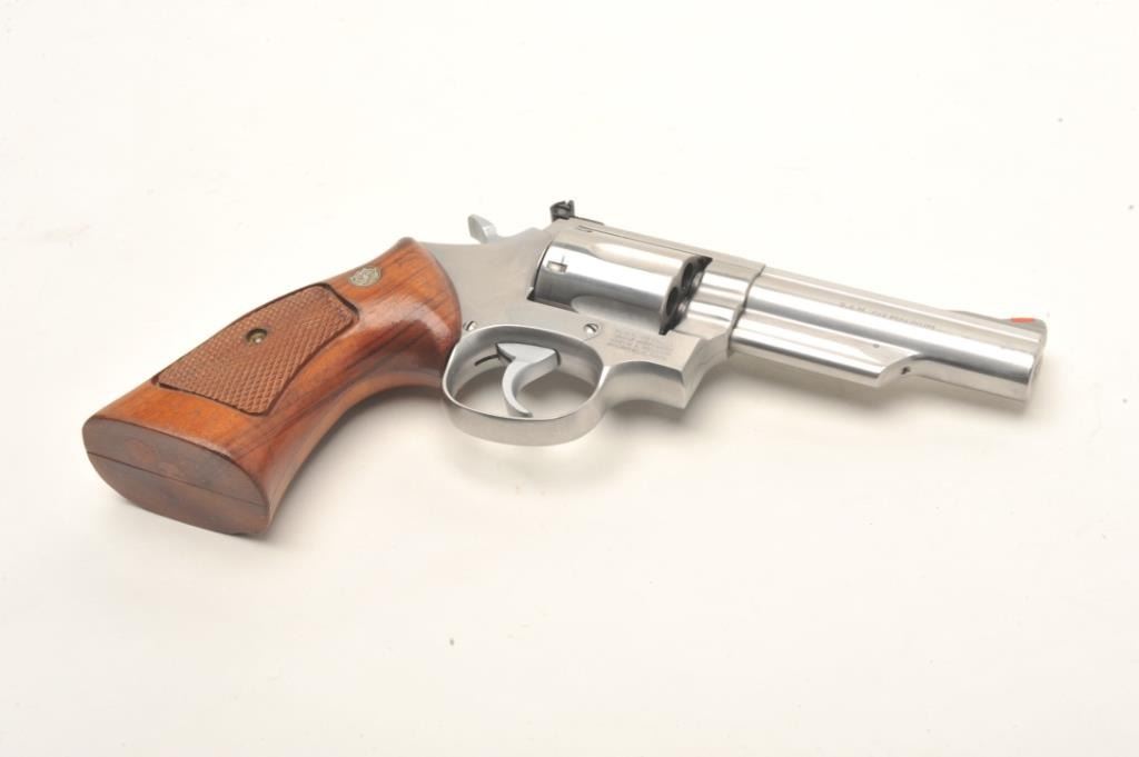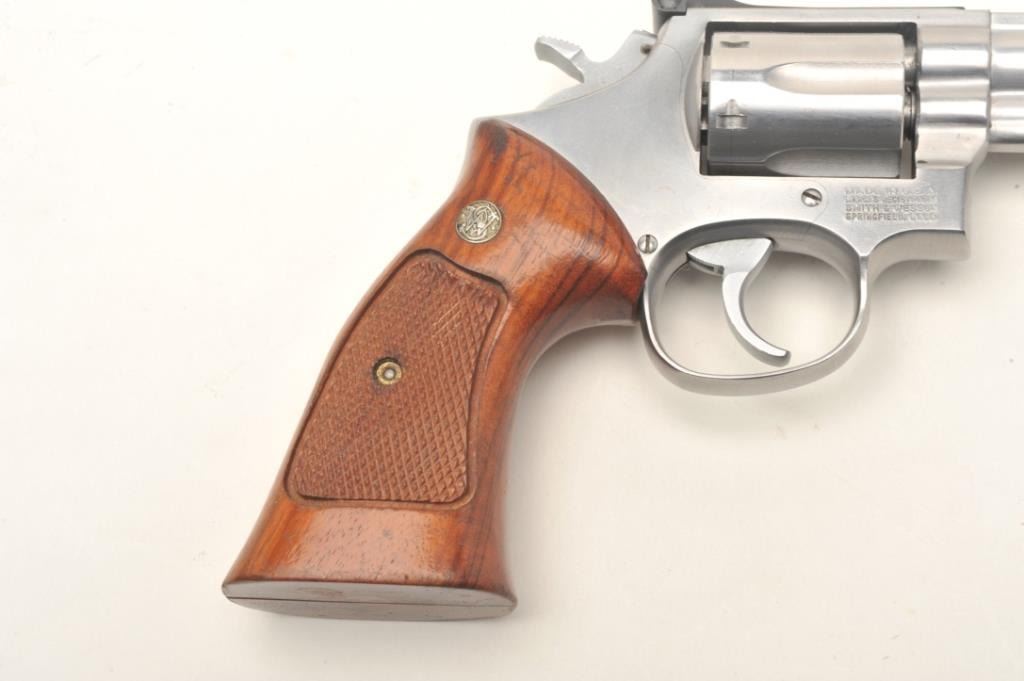Smith & Wesson Model 66-2 stainless steel double action revolver with 4” barrel in .357 mag caliber, S/N ABY2460 showing target features. In very good plus to almost fine used condition. (No CA Sale) Est.: $350-$700