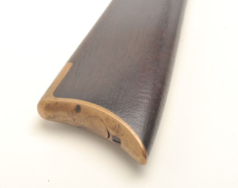 Important original period inscribed Henry rifle, S/N 1672; inscribed “Enos W. Tyler/Co. D/W.S.S.”. This well-known Henry is pictured in Les Quick’s book on Henry rifles from the Doug Beneck Collection. W.S.S.stands for Western Sharpshooters and were the U.S. Volunteers under Lt. Colonel John M. Birge, Commanding. Tyler served with both the 14th Missouri and the 66th Illinois; he was mustered into service on Nov. 9, 1861 and was discharged on Sept. 17, 1864. Birge’s Sharpshooters served at Fort Donelson, TN; Shiloh, TN; Corinth, MS; Resaca, GA; Atlanta, GA; Peach Tree Creek, GA and Jonesboro, GA. Tyler died on Aug. 24, 1903 in Free Soil,MI. This early Henry is in overall good to very good condition showing a beautiful dark patina to the barrel assembly and terrific taffy colored, un-cleaned patina to the brass frame and butt plate; the action is good the bore fair to good and the butt stock is very good +. A great Civil War soldier’s inscribed Henry rifle who belonged to one of the premier Sharpshooter regiments that utilized weaponry that the opposing forces