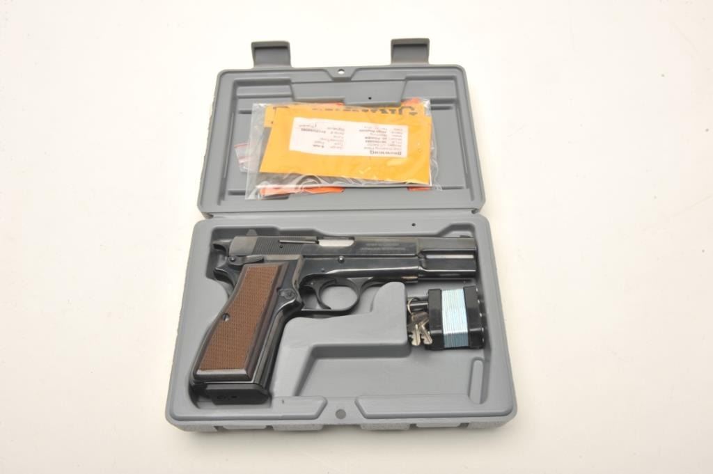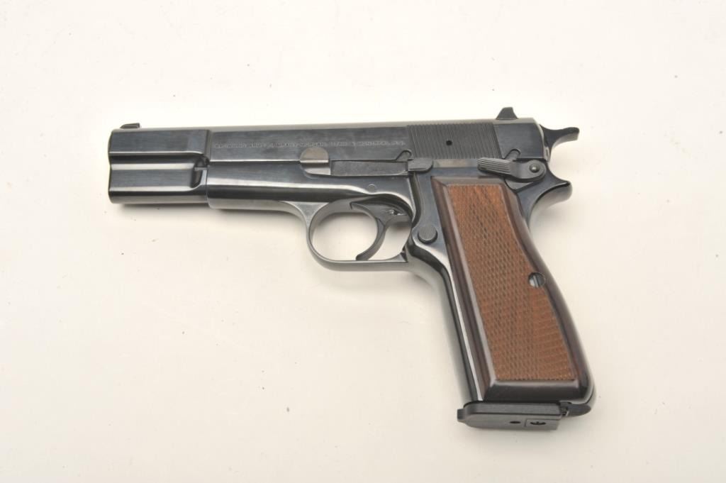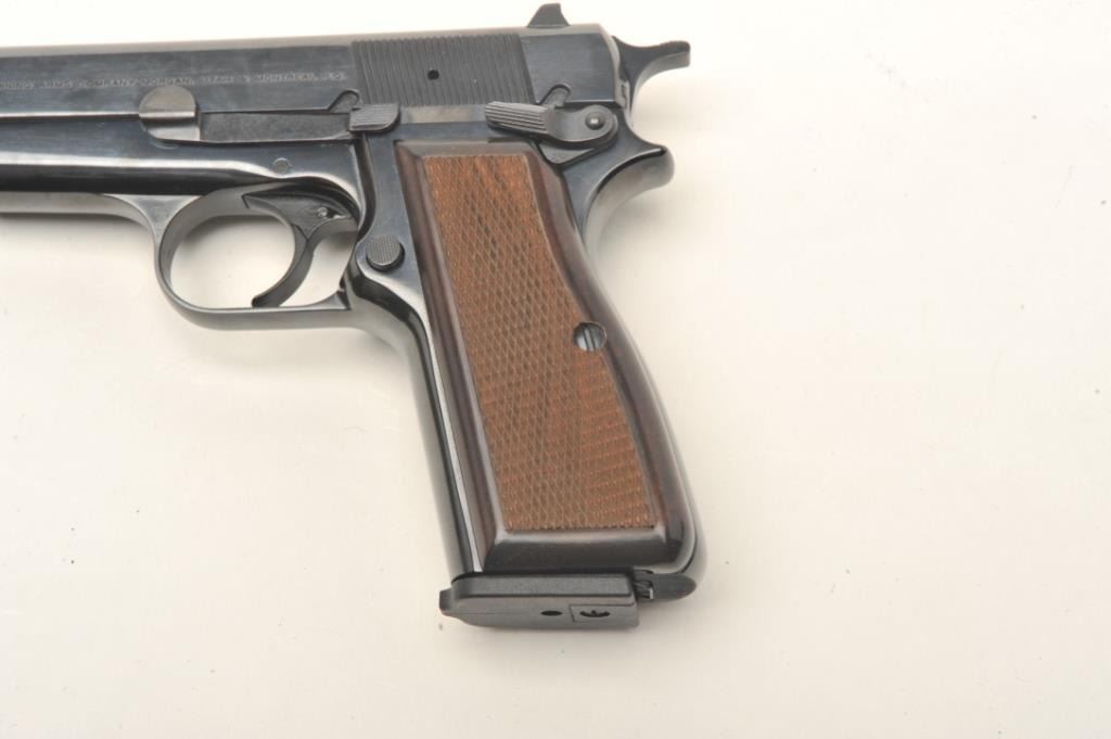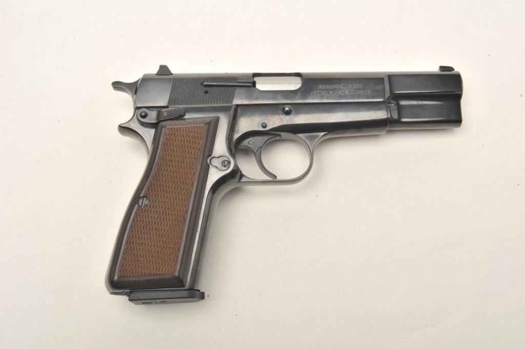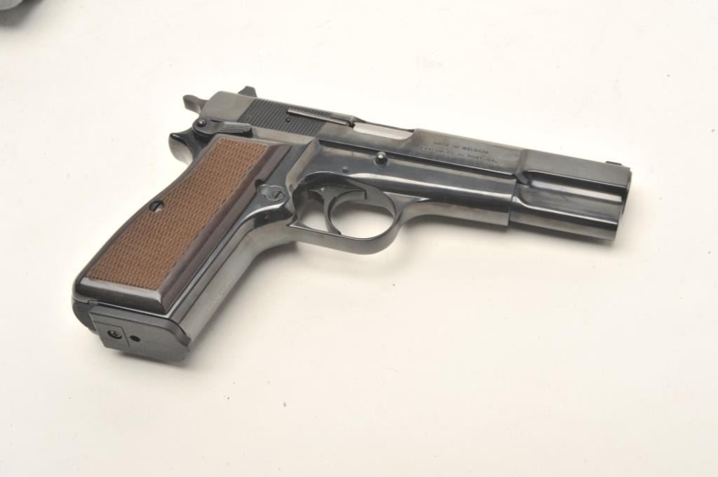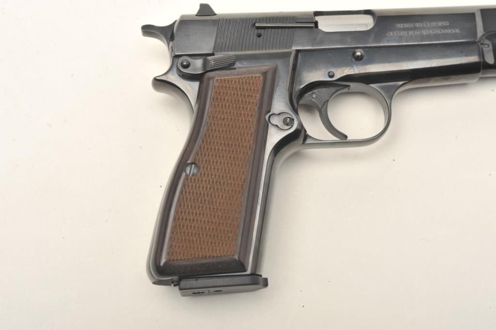 Belgium Browning Hi Power in 9mm and assembled in Portugal, S/N 511ZW50095 with 10 round clip, white outline sights and ambidextrous safety. Excellent to almost new in box. (CA Legal/ No PPT) Est.: $600-$1200
