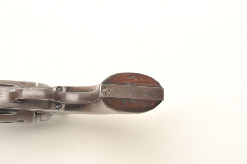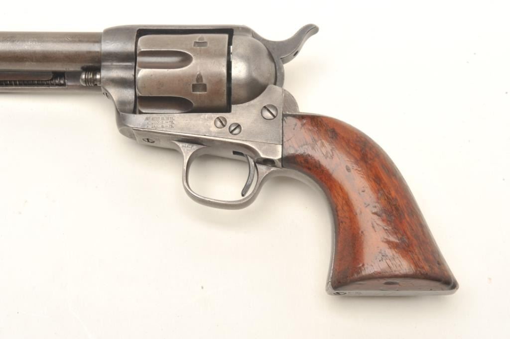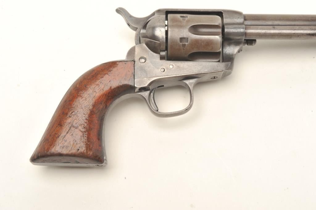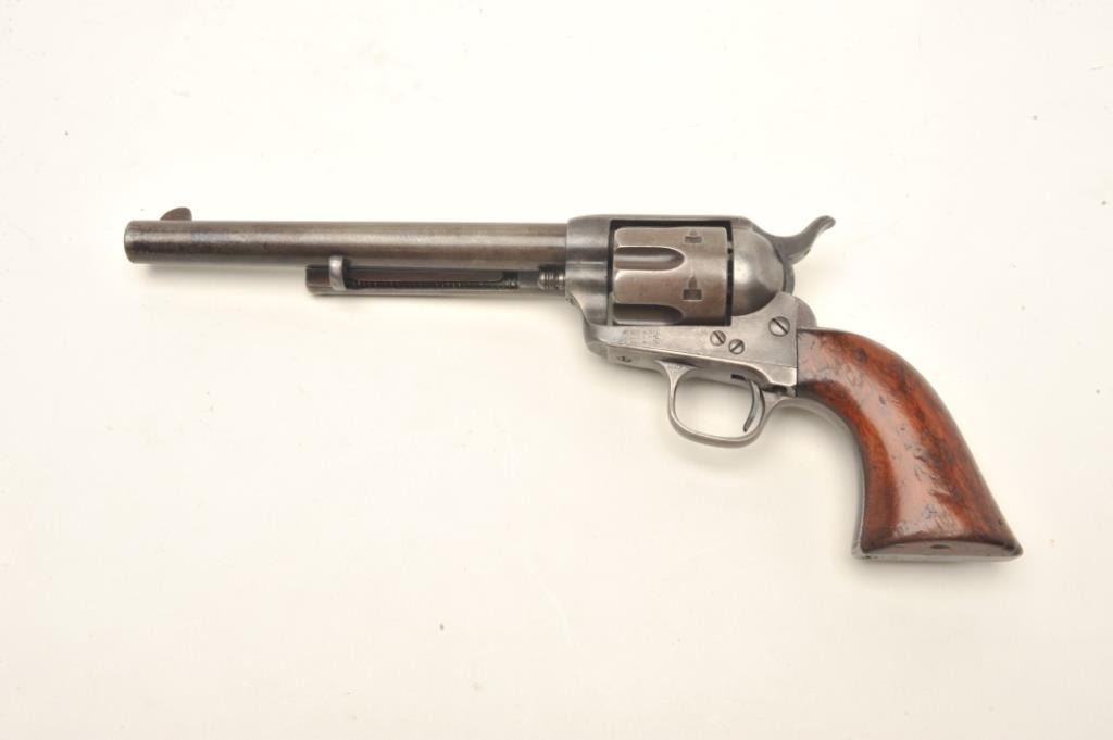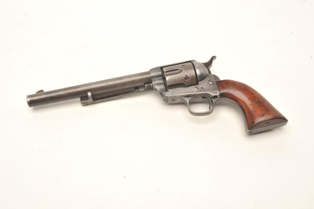 Colt SAA revolver in .44-40 caliber with a 7 ½” etched barrel, traces of original finish, and varnished wood grips, S/N 87216. Made in 1883 during the height of the frontier era. A good, sharp and honest early Colt. Fullyvisible etched barrel that is light. Faint traces of blue and case hardening where protected. All matching serial numbers and correct markings. Good to very good one piece original wood grips with a light coat of old varnish and fit well. (Antique) Est.: $2750-$5500