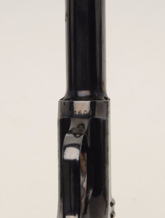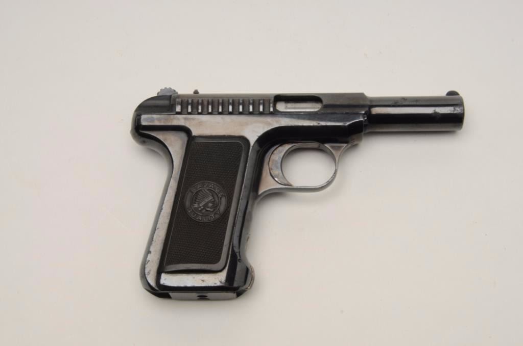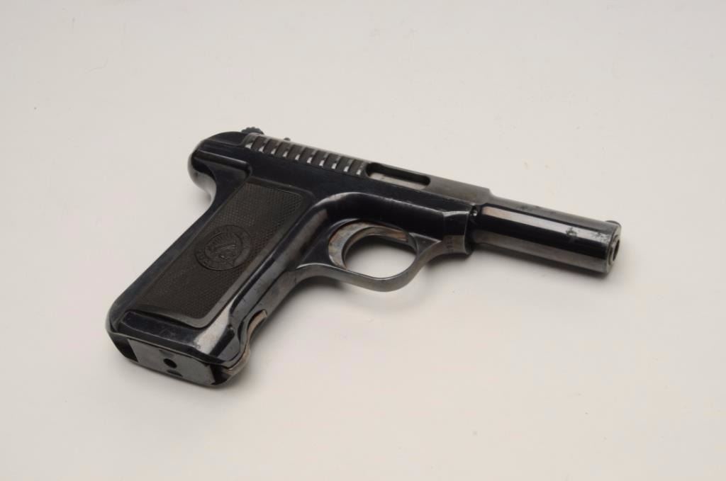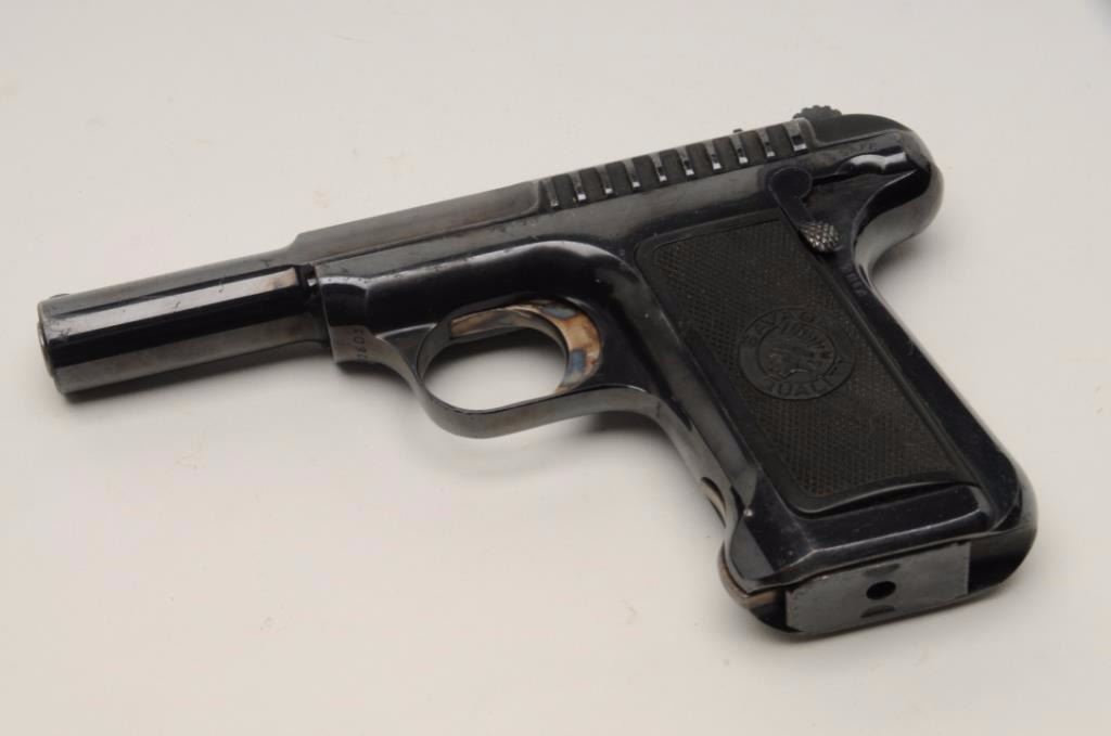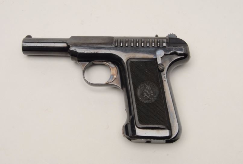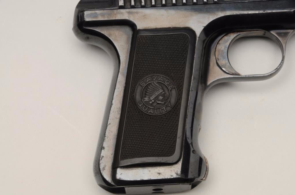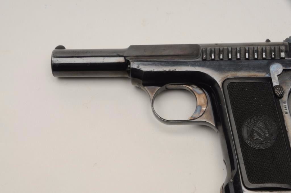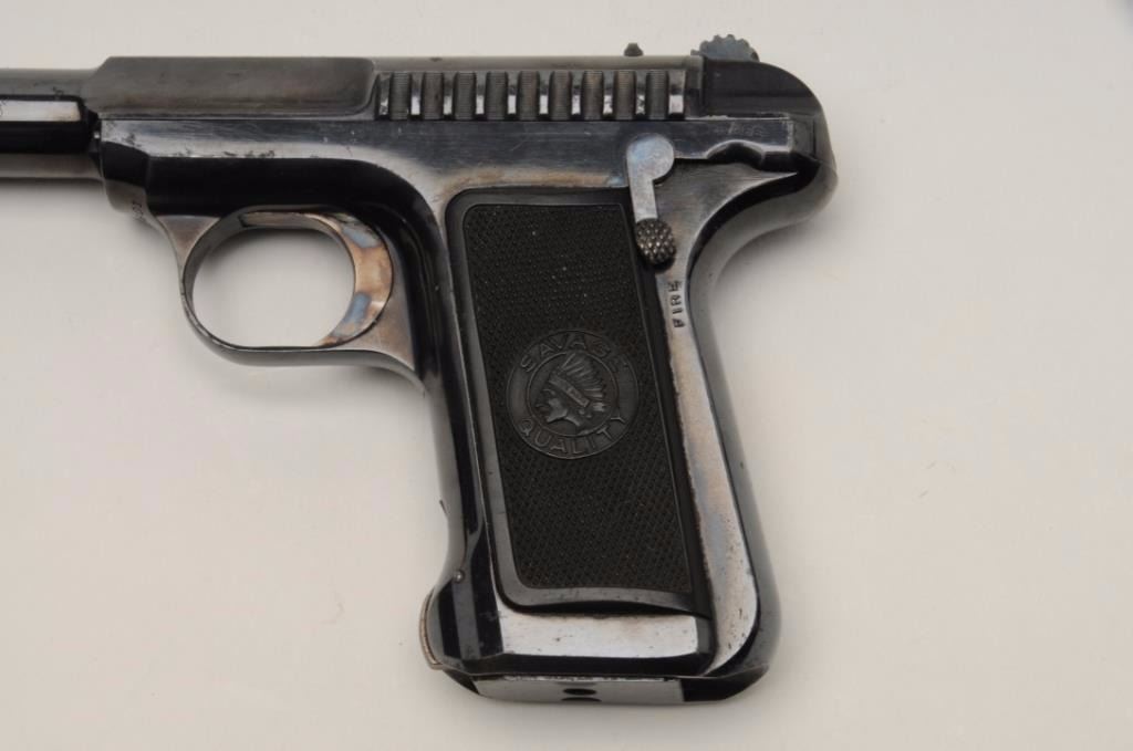 Savage Model 1910 Semi-Auto pistol in .32 ACP caliber, S/N 21601. 95%-98% bright original blue with bright case colors on trigger. Excellent grips and fine overall. Billed as “10 Shots Quick” and very early. (C&R/NoPPT). Est.: $300-$600