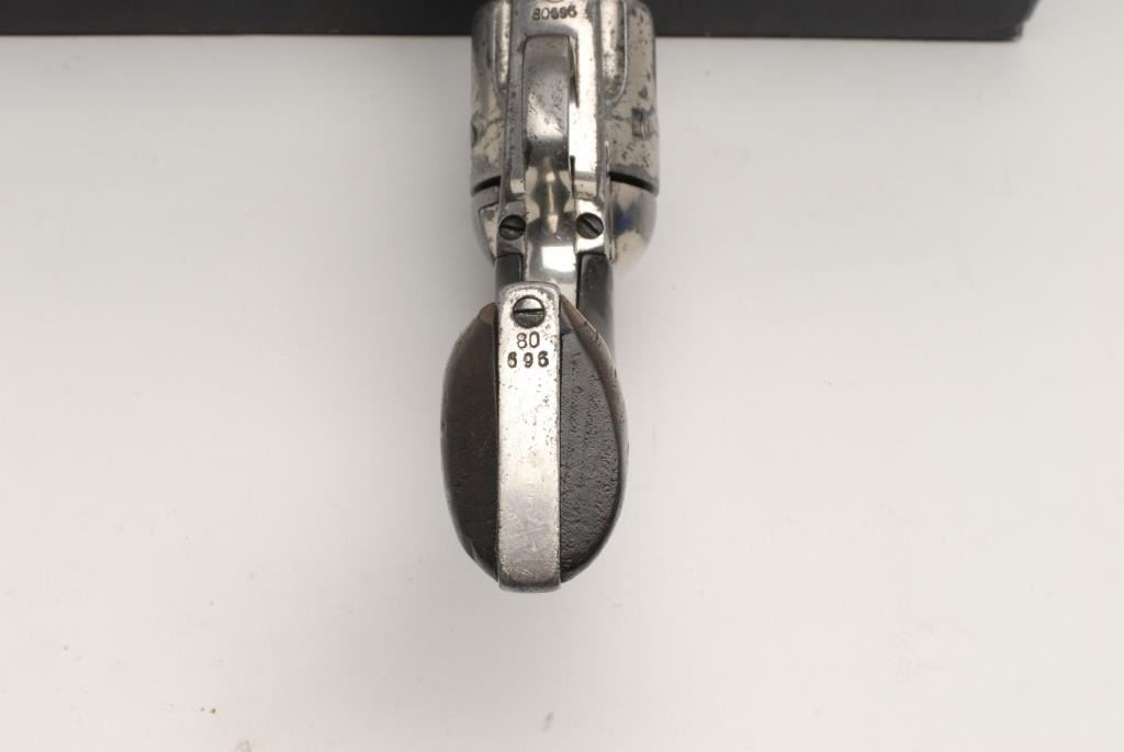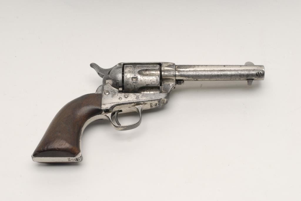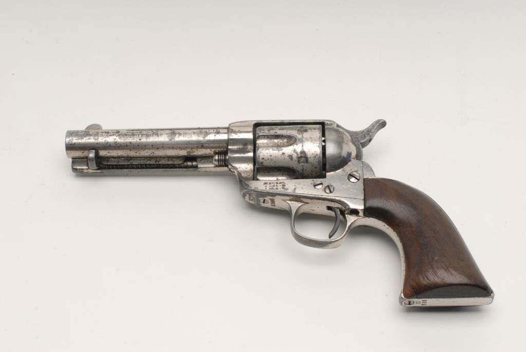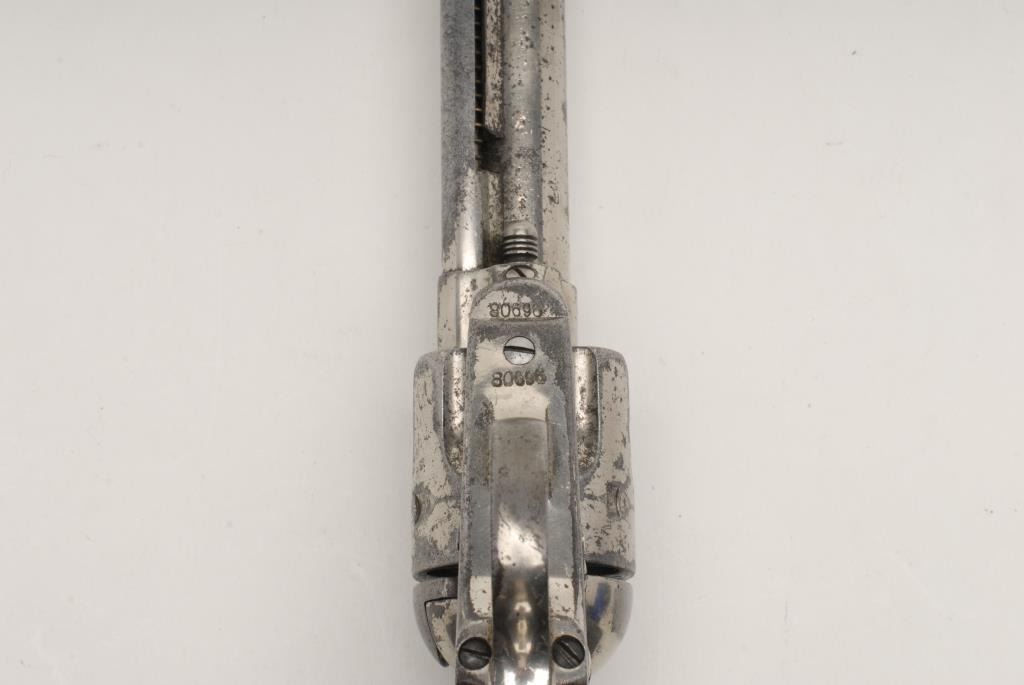 Colt Single Action Army, .44-40, 4 ¾” etched panel barrel, Nickel finish, wood grips, S/N 80696. This revolver remains in good to very good condition showing considerable nickel finish remaining along with scattered areasof pinprick pitting. The barrel has been reduced and the sight was reconfigured but was done very well probably by a gunsmith during the period of use. The grips remain in good condition showing a loss of wood at the toe along with dings, scratches and loss of varnish but fit the gun well. The action is crisp and the bore is fair. (Antique) Est.: $2,500-$5,000