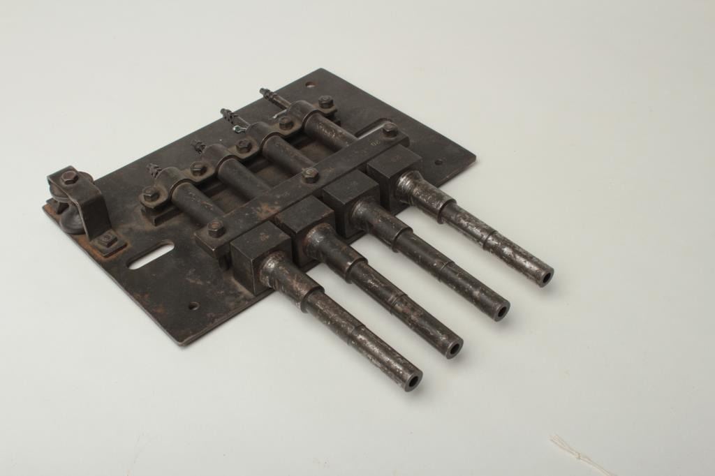 A volley trap gun consisting of four firing pin devices bolted to a steel plate and threaded with four six inch long rifled barrels. The barrels appear to be for some kind of bottle nose caliber in the .30 - .32range. There is a pulley device that one would assume would activate the firing pins when pulled. Each barrel and corresponding part is numbered 1-20, so again, one would assume that this was part of a larger volleydevice. Est:$400-600