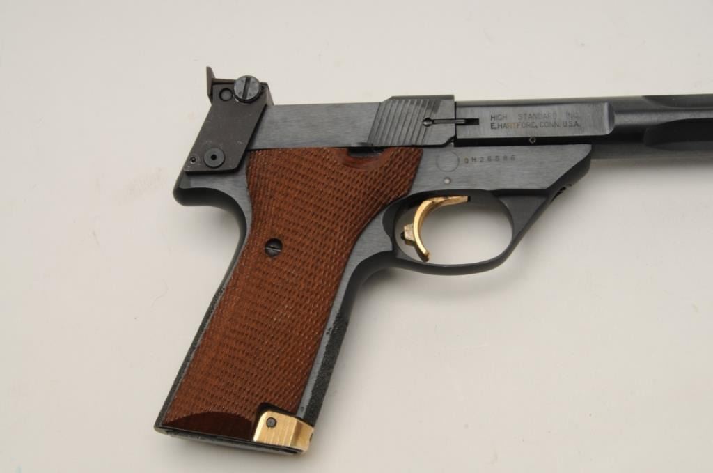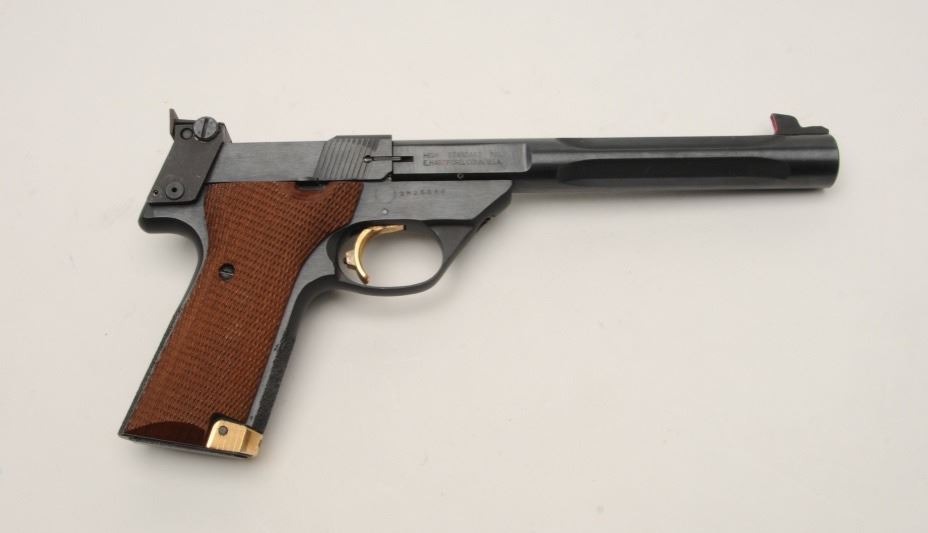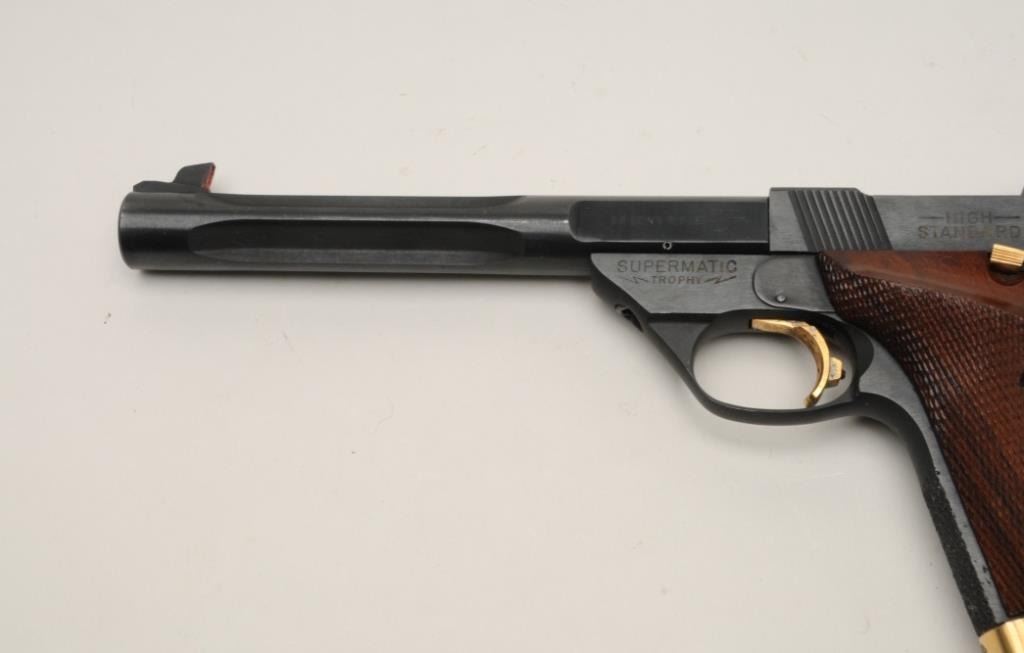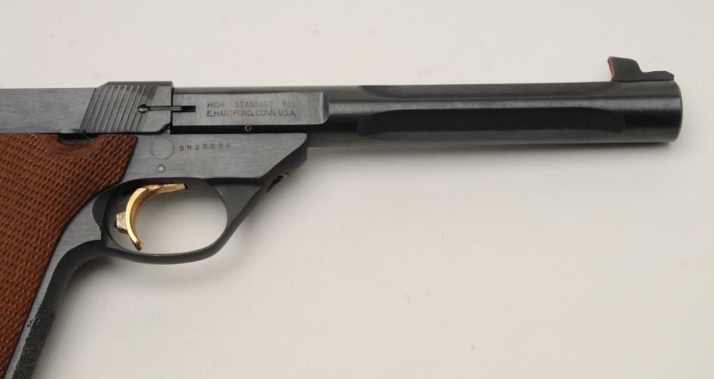 Hi Standard “Trophy” Target Model in .22 caliber with a 7 ¼” heavy barrel, S/N SH25586. In fine to excellent used condition showing 96%-98% original blue. (C&R/No PPT) Est.: $400-$800