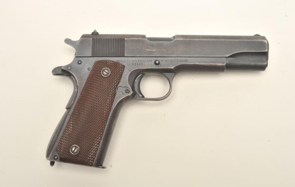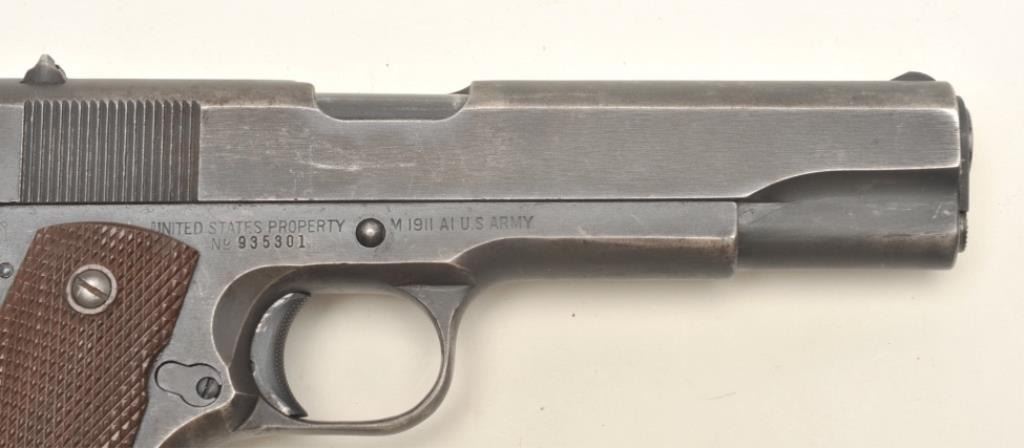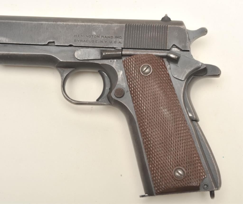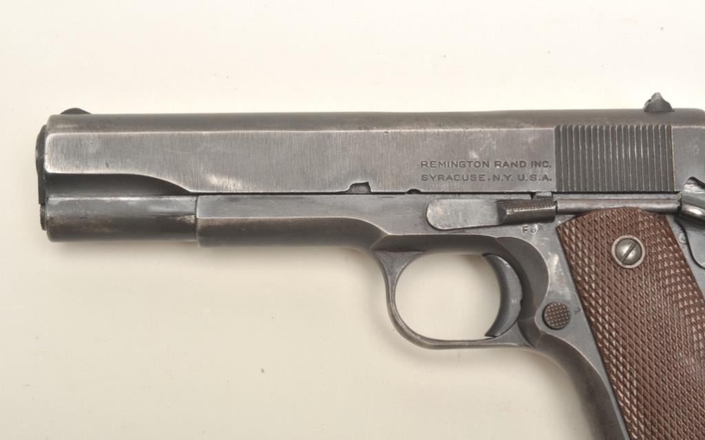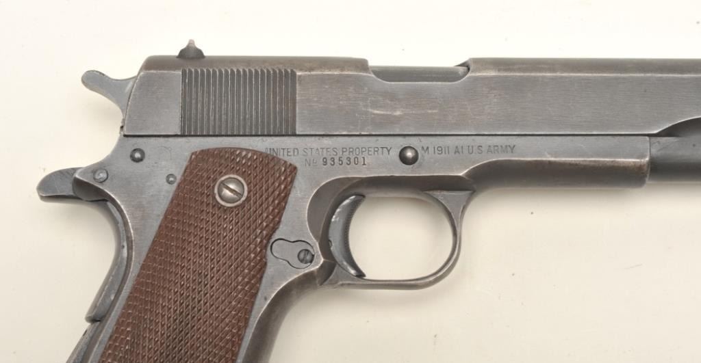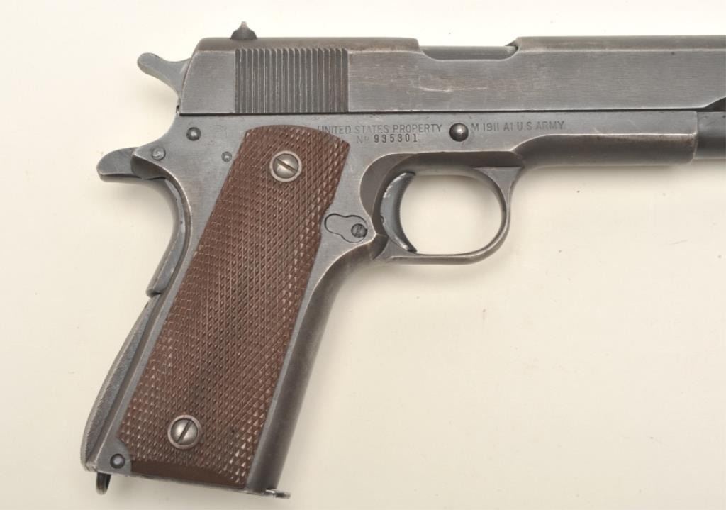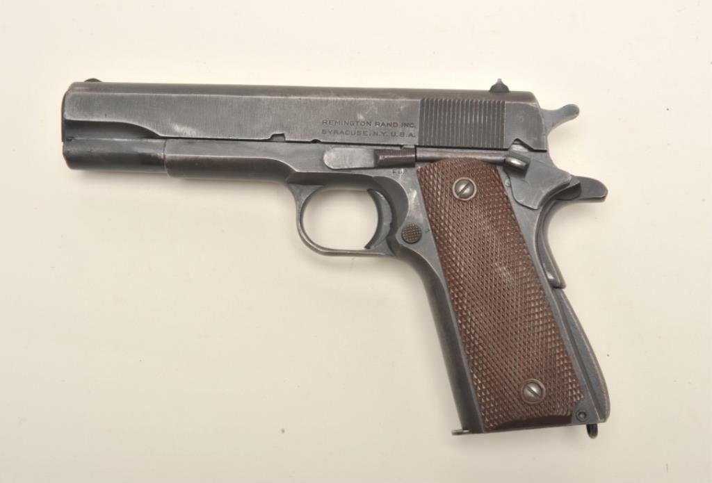 Remington Rand United States Property Model 1911-A1 semi-automatic pistol, early Duralite finish, checkered brown plastic grips, S/N 935301, overall very good to fine condition showing the majority of its original military finish, fine bore, crisp action, sharp markings and fine grips. (C&R/PPT). Est.: $1,400-$2,800.