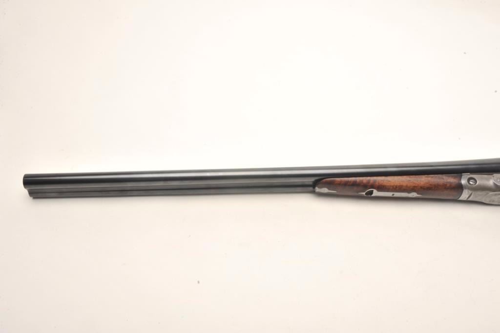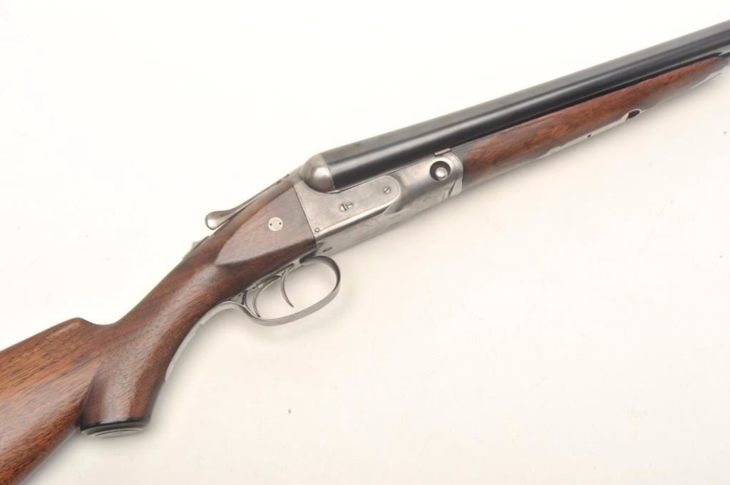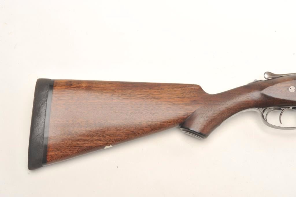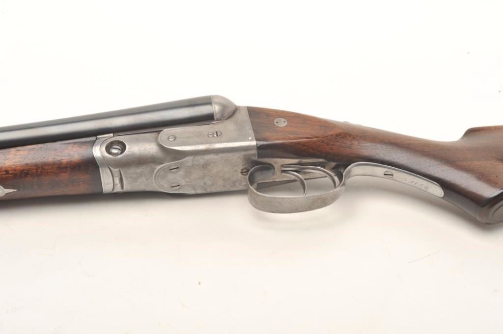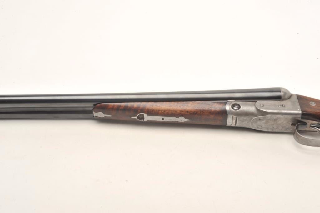 Parker V Grade SxS shotgun S/N 93738 custom re-blued and restocked in 12GA with 26” barrels choked about Mod and Imp. Mod. The barrels show a crown over star over double K unidentified proof and #554 “probablyBelgium” with very thick walls and 2 ¾” chambers. Simply stocked in tight grain walnut with no checkering and elongated pistol grip. 14 ½” pull to the end of the rubber pad. 2” drop at the comb and 3” dropat the heel with a neutral cast. Traces of original case colors on the frame. Very good plus to near fine as restored condition with bright and excellent bores. Someone spent a lot restoring this Parker before repros wereavailable. Est.: $800-$1600