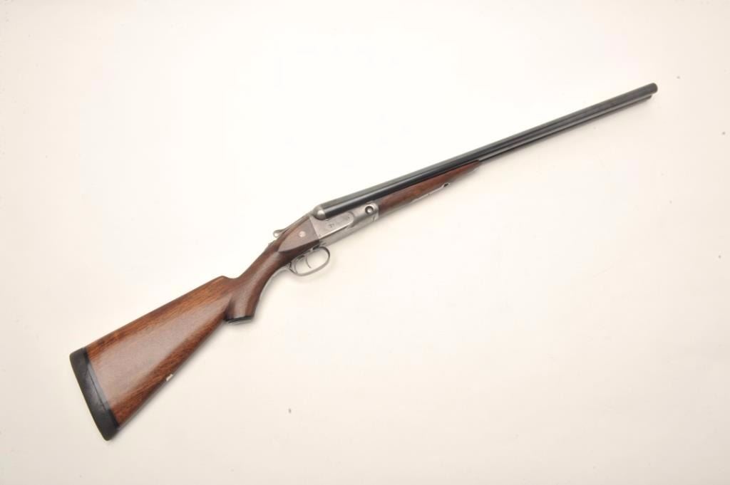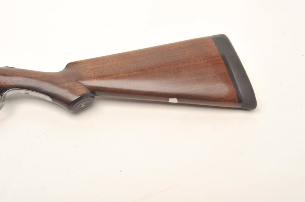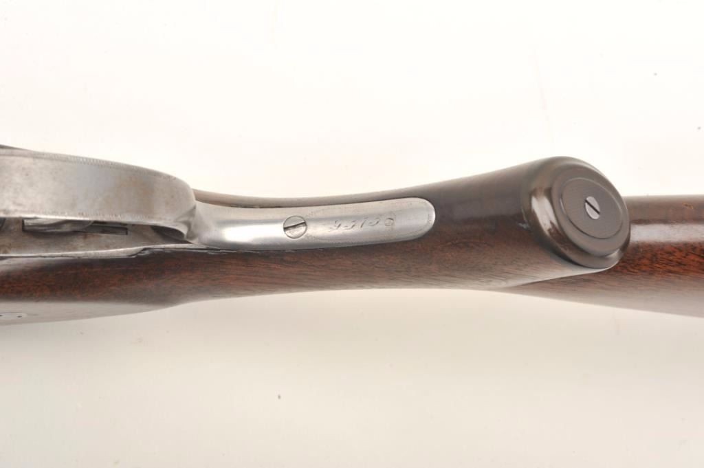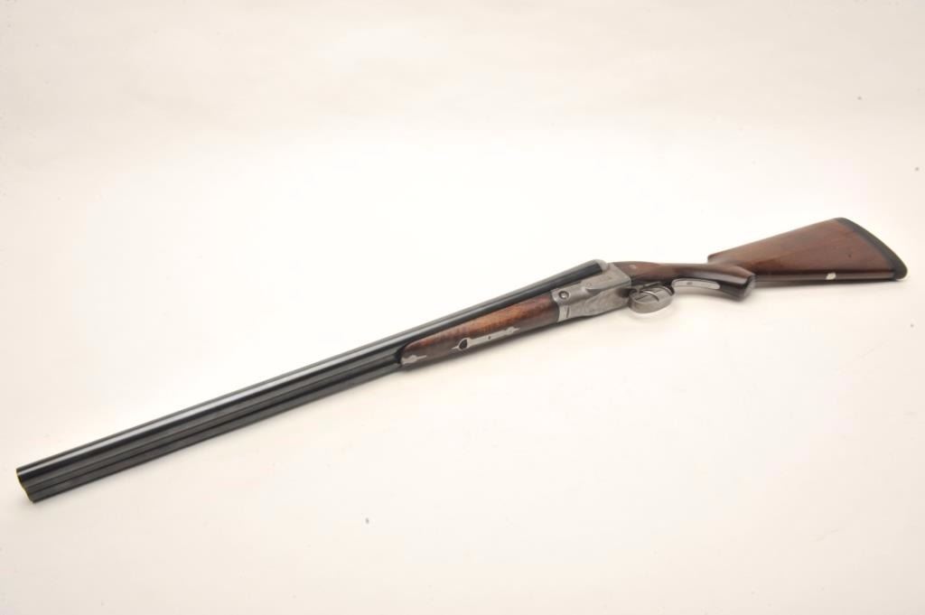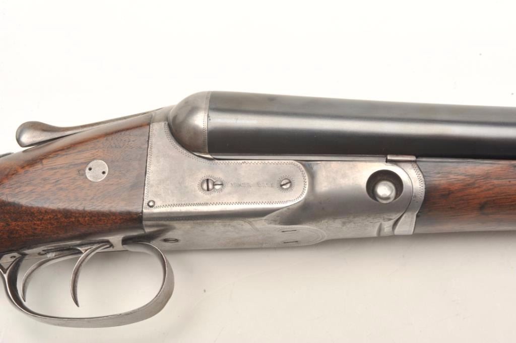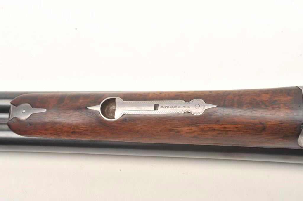Parker V Grade SxS shotgun S/N 93738 custom re-blued and restocked in 12GA with 26” barrels choked about Mod and Imp. Mod. The barrels show a crown over star over double K unidentified proof and #554 “probablyBelgium” with very thick walls and 2 ¾” chambers. Simply stocked in tight grain walnut with no checkering and elongated pistol grip. 14 ½” pull to the end of the rubber pad. 2” drop at the comb and 3” dropat the heel with a neutral cast. Traces of original case colors on the frame. Very good plus to near fine as restored condition with bright and excellent bores. Someone spent a lot restoring this Parker before repros wereavailable. Est.: $800-$1600
