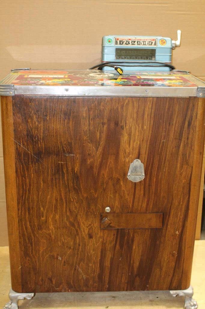 Rare 1930’s era large electric and mechanical horse race machine made of wood, metal and glass; five cent coin operated; approximately 45” in height, 32” wide and 26” deep; lights work at time of description however complete working condition is unknown. Est.: $8,000-$12,000.