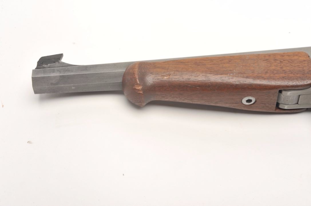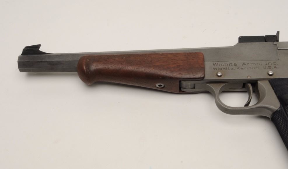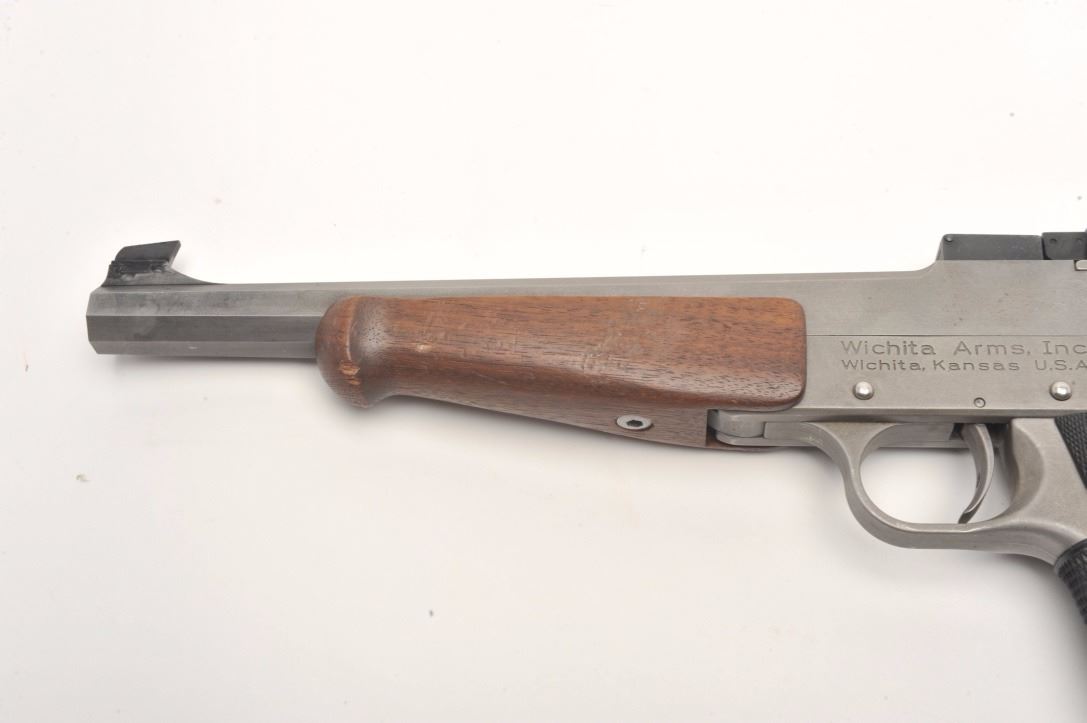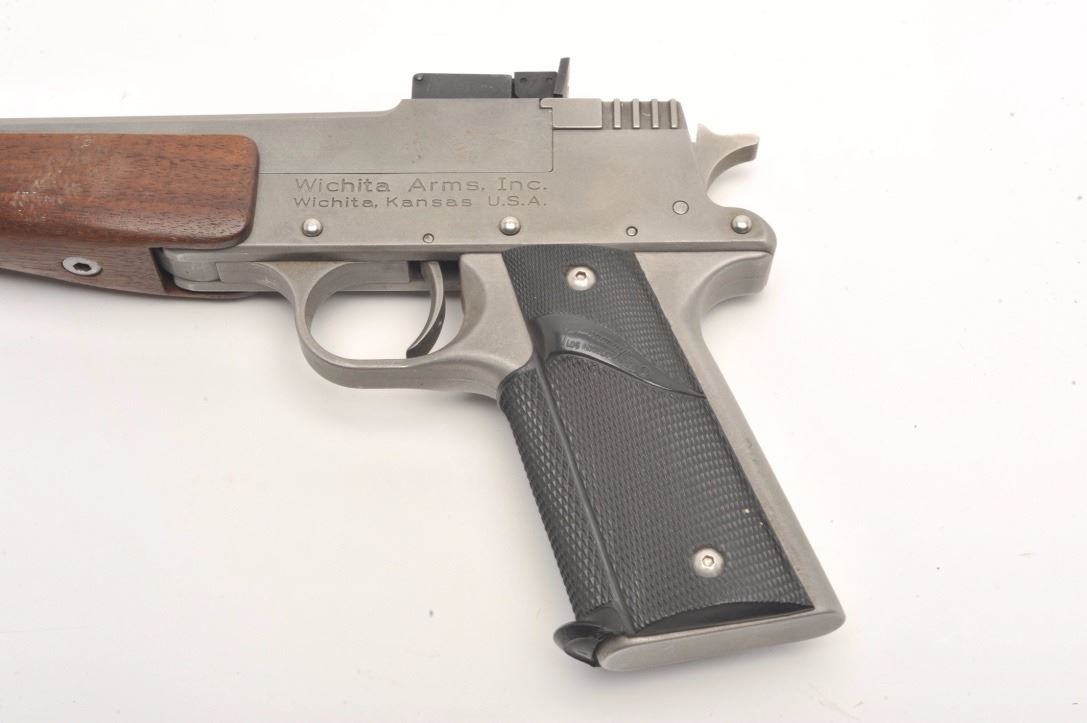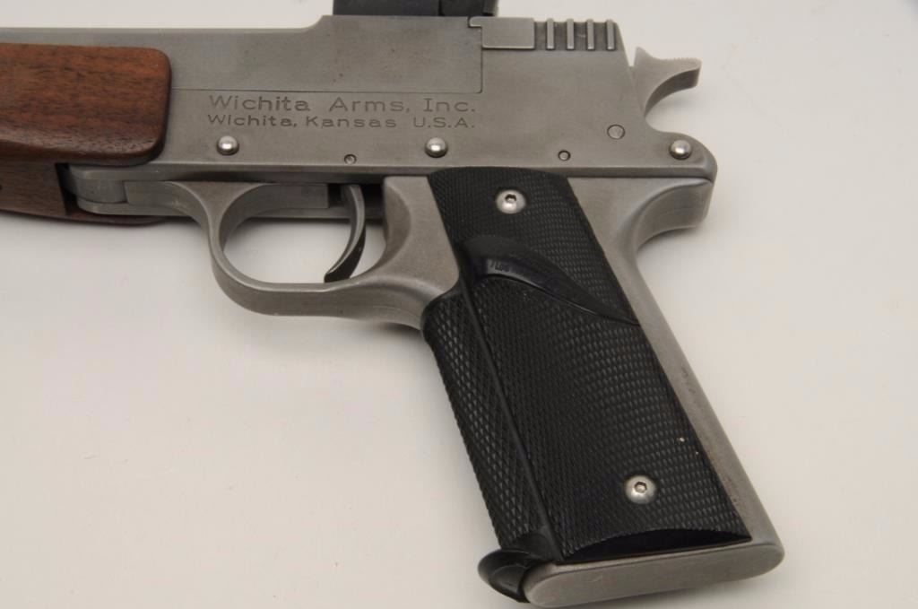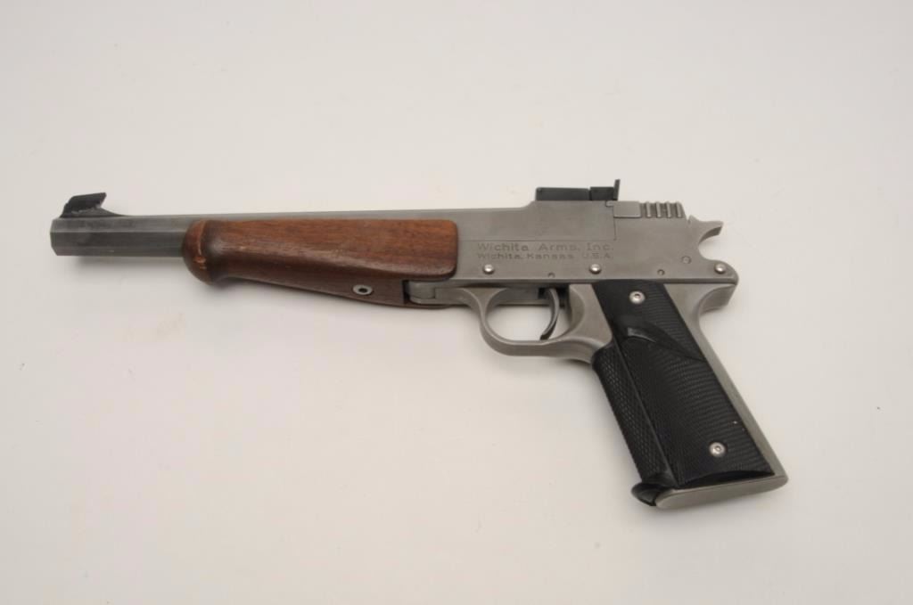 Wichita Arms Single Shot Target pistol in brushed stainless finish and chambered for .357 Mag., S/N 280. 10 ½” octagon barrel with wood fore end and Pachmayr grips. Excellent used condition. (CA Legal/No PPT) Est.:$400-$800
