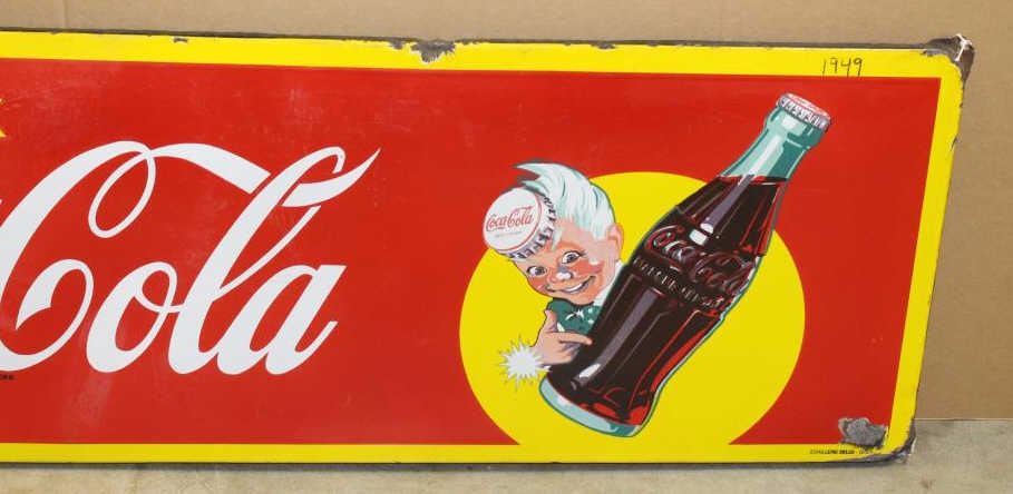 Large color enamel on metal classic Drink Coca-Cola sign, approximately 18” x 58” overall and in very good condition some scattered chips to enamel; “1949” inked on top right corner. Est.:$1,800-$2,500.