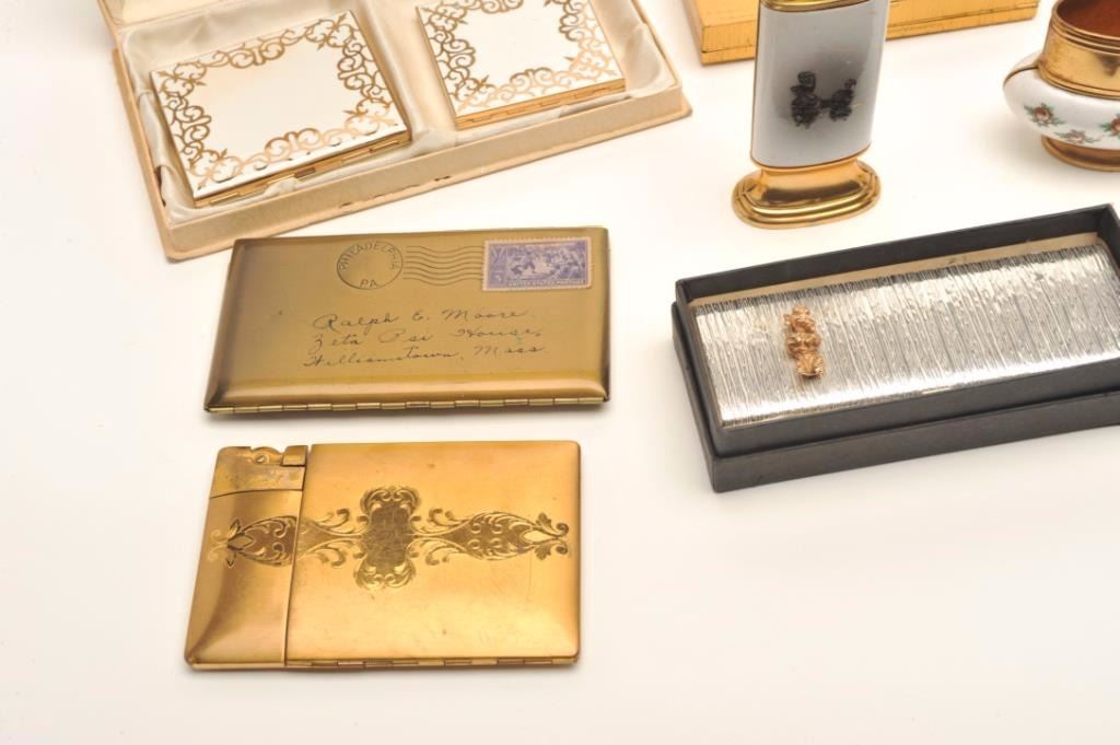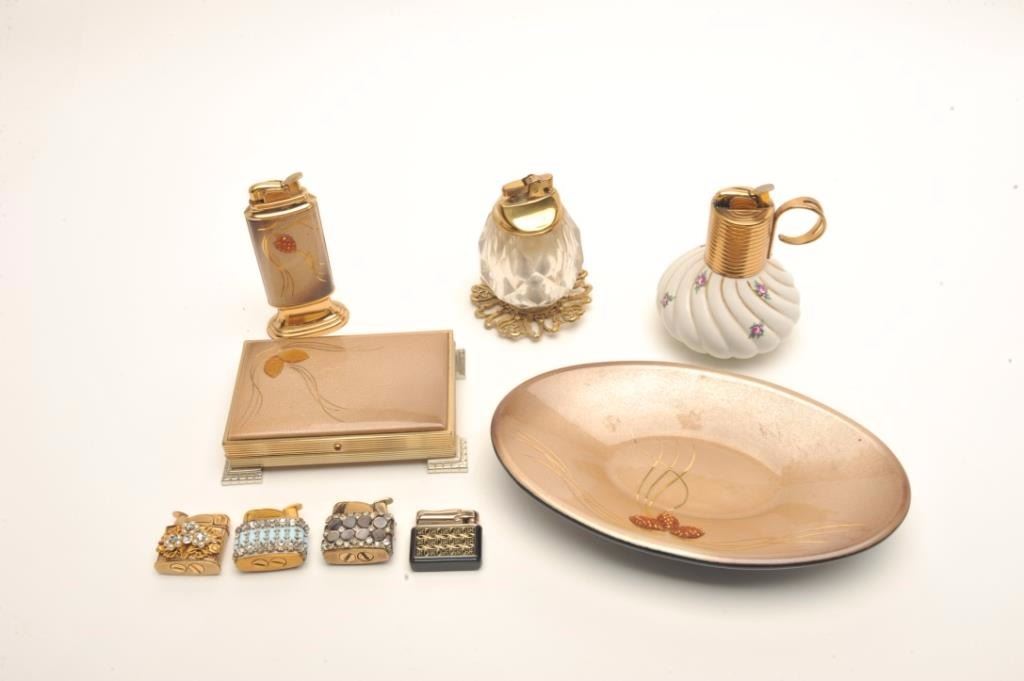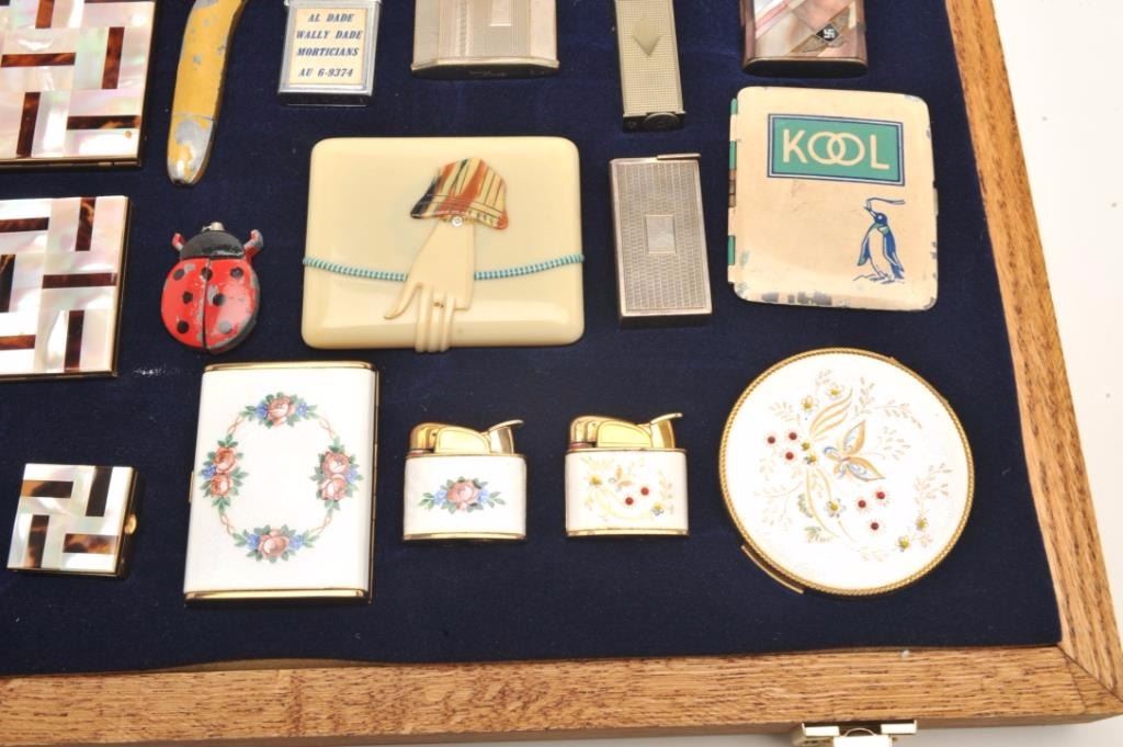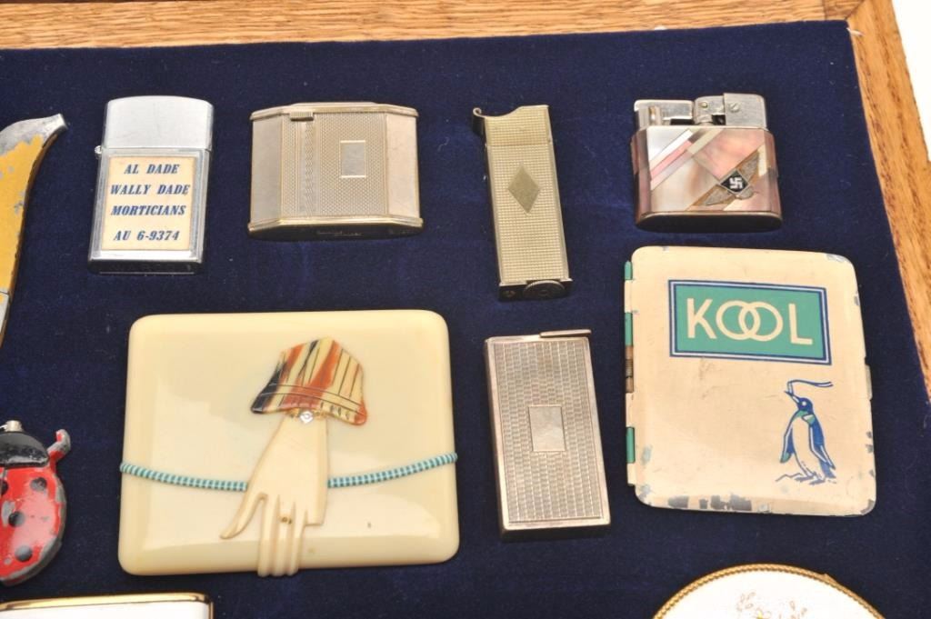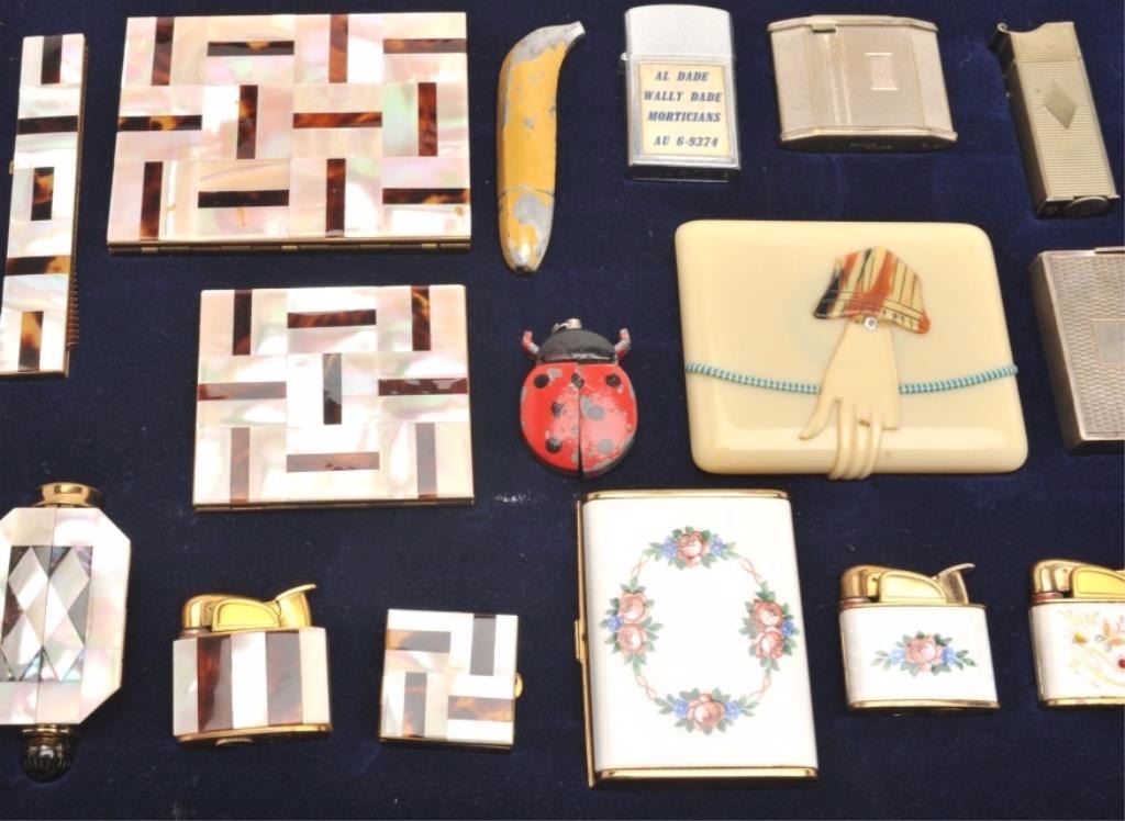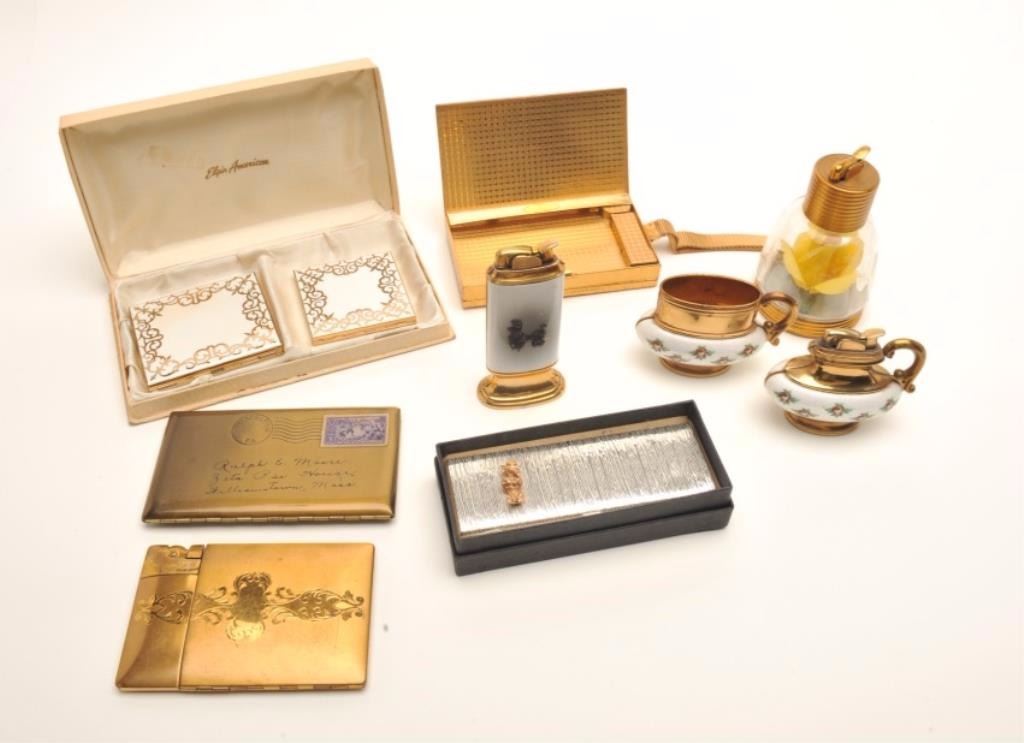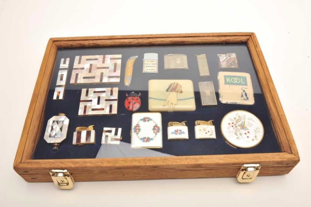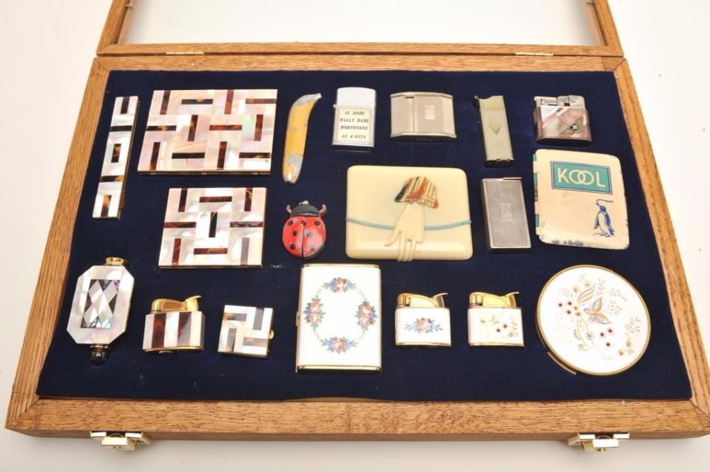 Misc. lot of vintage and collectible cigarette cases, lighters by various makers including a couple sets and several advertisers; in this lot is a gold-tone metal cigarette case that looks like anenvelope with a 3 cent postage stamp and engraving (ca. 1939); also an ivory colored Bakelite cigarette case with a lady’s hand holding a handbag (ca. 1930’s); a metal and painted KOOL cigarette case (ca. 1930’s);several pearl and shell cigarette cases, lighter, etc.; a painted porcelain set and others contained in a wood and glass display case and more. (Reference: James Flanagan’s definitive work “The Big Book ofCigarette Lighters”). Est.: $500-$600.