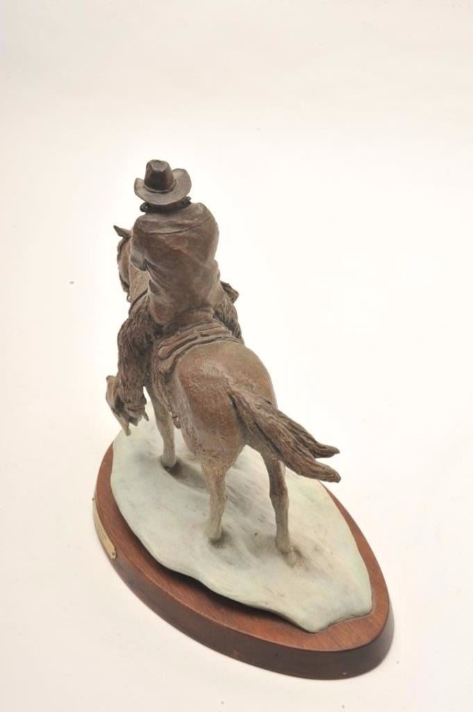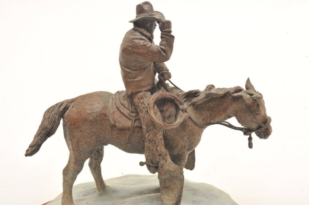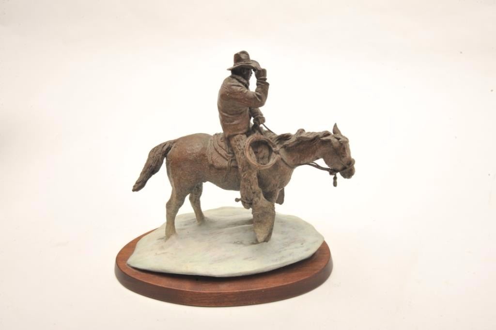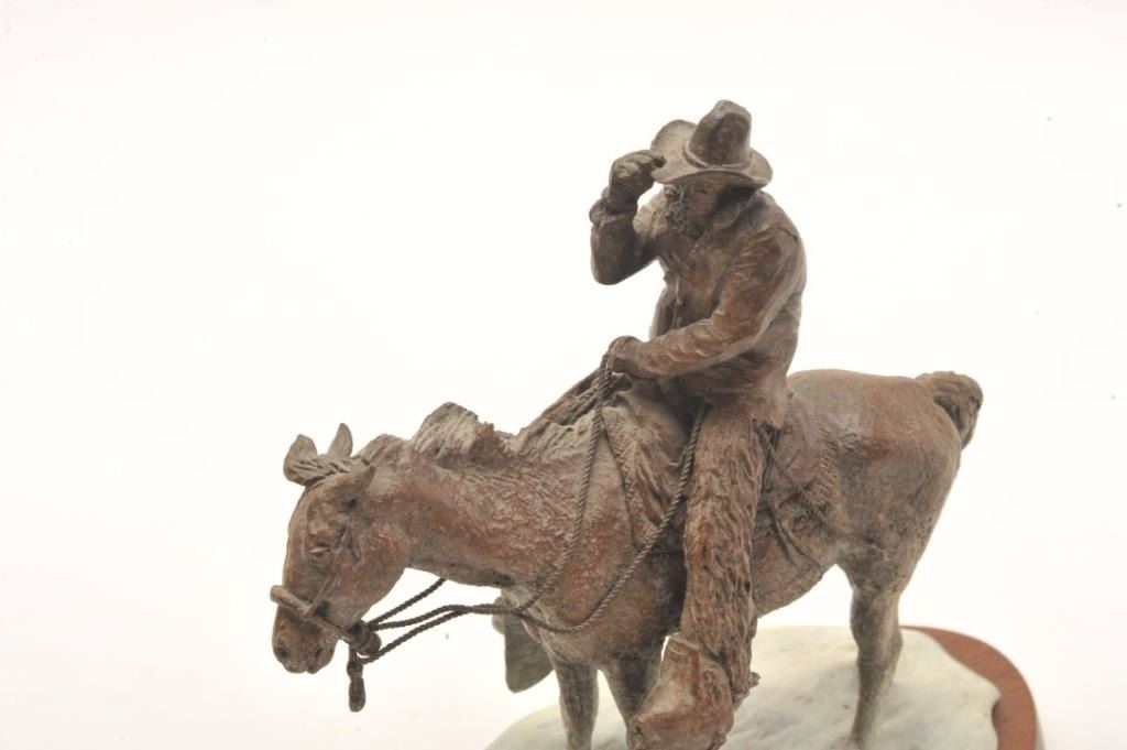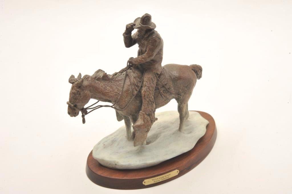 Original bronze entitled “Winter Time” by Keith Christie. Measures approximately 10” x 11” including the base and marked #38/50. Shows cowboy on mount in snow. The bronze is polychrome painted and mounted in white stone to simulate snow. Very well detailed and authentic piece by a well-known contemporary artist. Est.: $600-$1200