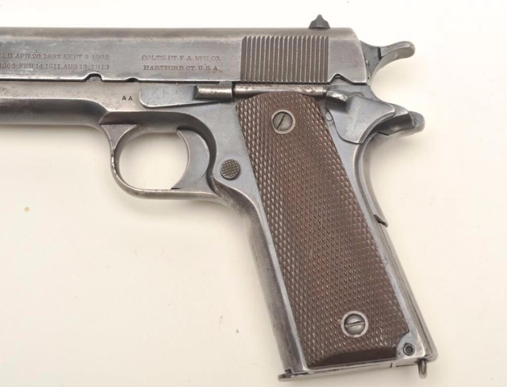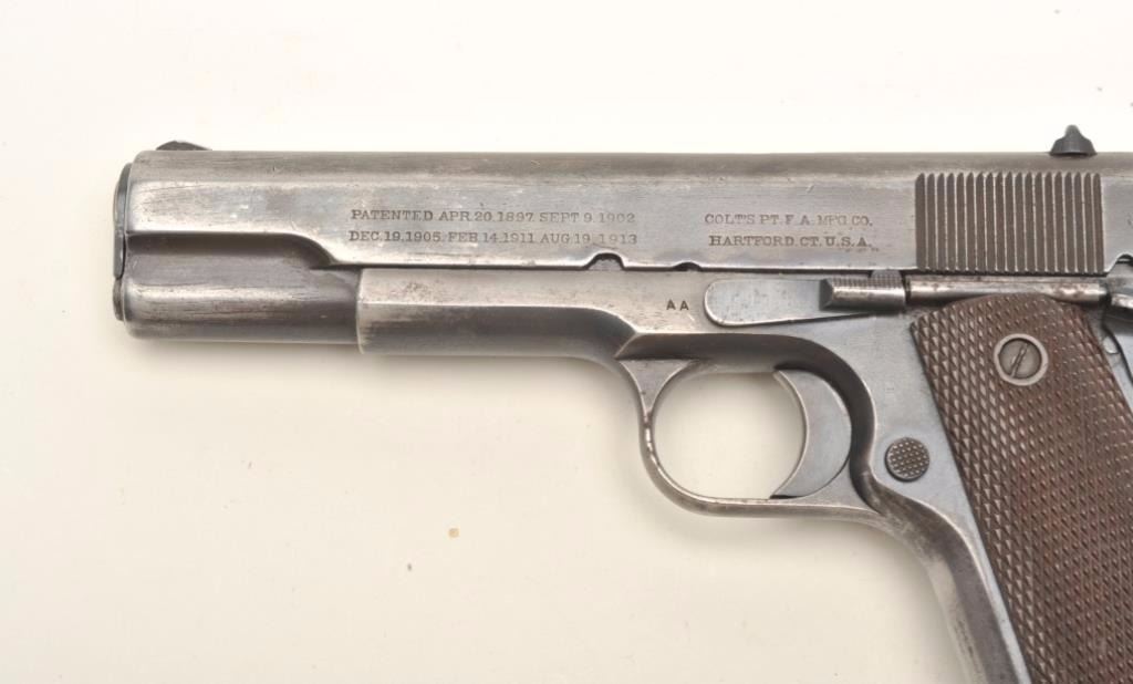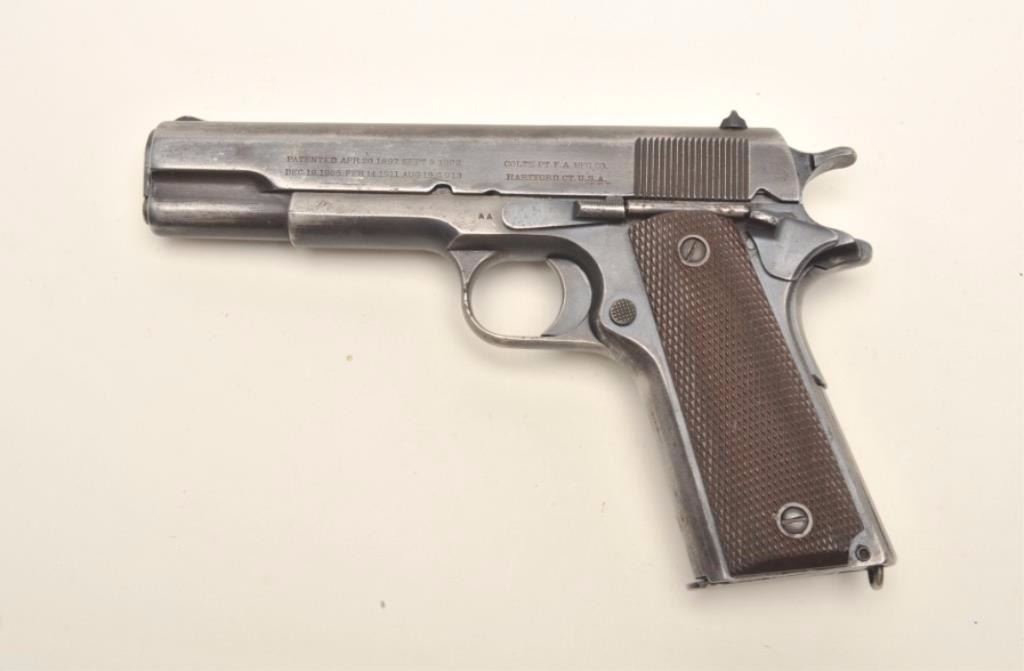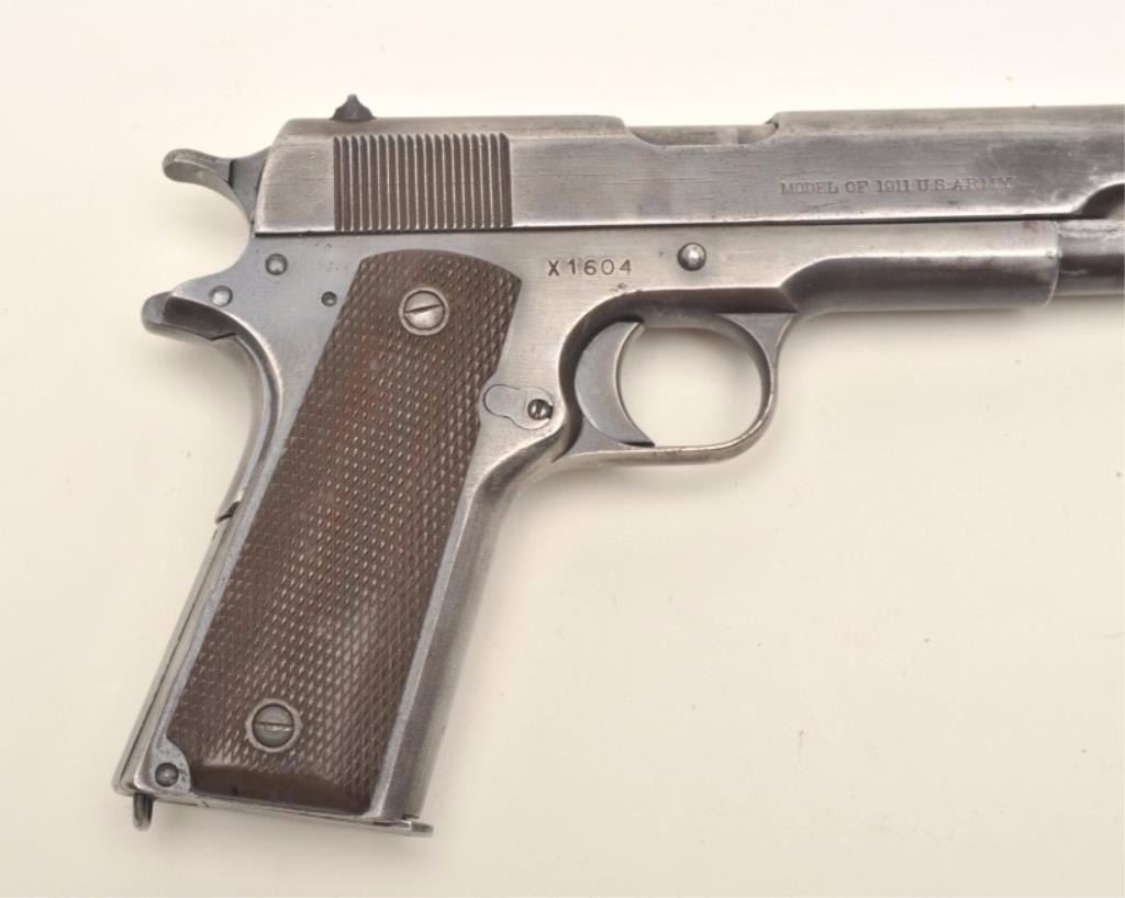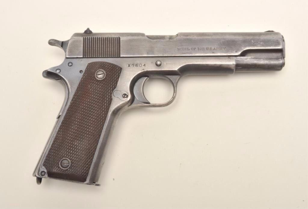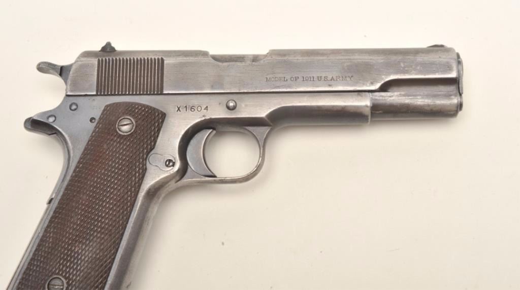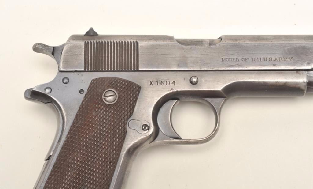 Colt Model 1911 semi-automatic pistol with replacement frame and Augusta Arsenal markings, .45 caliber, 5” barrel, military finish, checkered brown plastic grips, Arsenal rework S/N X1604 (ca. 1924-53), in overall good to very good condition showing areas of military blue finish mixed with grey patina on metal surfaces, very good bore, good markings and very good grips. A key variation for the 1911 collector.(C&R/PPT). Est.: $1,000-$2,000.