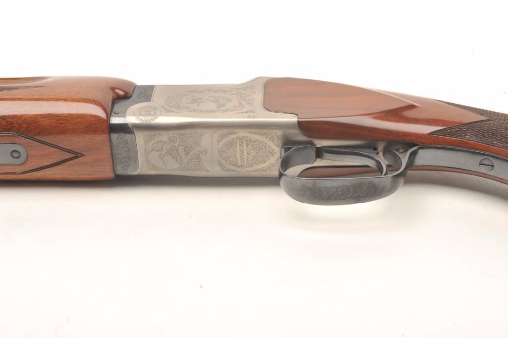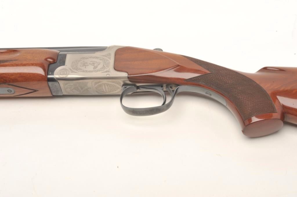 Winchester Model 101 XTR Lightweight O/U shotgun, 20 gauge, serial #K281758E. The shotgun is in very good overall condition with 27” barrels with a full-length ventilated rib and ivory bead front sight.The barrels retain nearly all of their blued finish while the coin finished receiver remains in the white. The receiver is tastefully engraved with game scenes on both sides and beneath the action. The finelycheckered high gloss wood stocks are in very good condition as well with small mars and compressions consistent with field use and standard pistol grip. The butt stock ends with a red rubber Winchester recoil padproviding a 14” LOP. The bores are very good, the action crisp and markings are sharp. The lot includes additional chokes; choke wrench and sight beads to be provided by the consignor at the conclusion of theauction. Est.: $750-$1,500. (Modern).