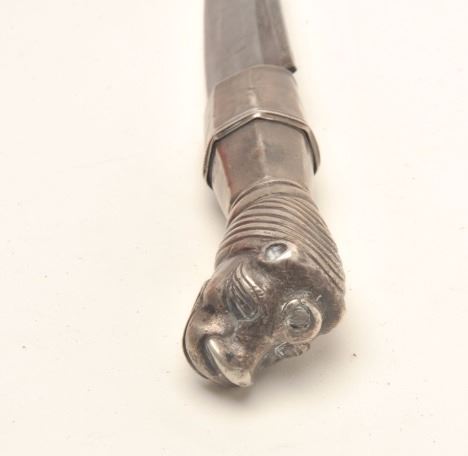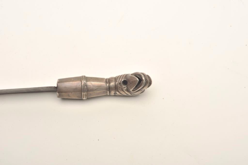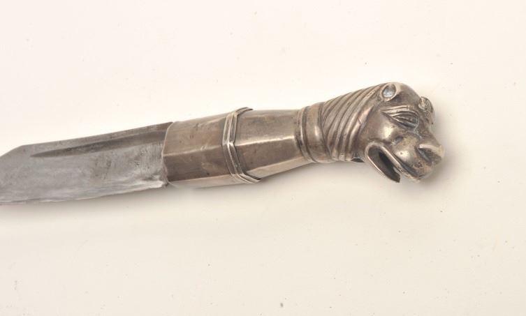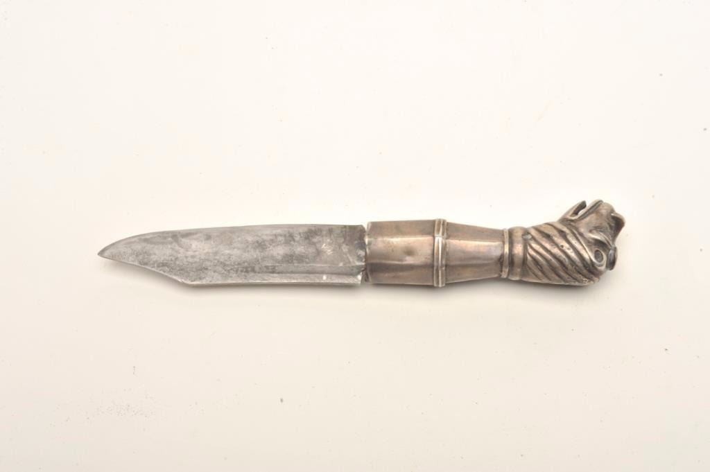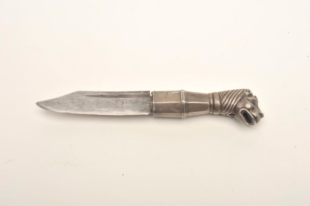 Interesting knife made from silver hilted hanger probably Germanic and period of American Revolution. Measures 9 5/8” overall with a 4 ¾” blade which is a thin forged steel with blood groove of an early Americanstyle. The hilt shows age and patina and the pommel where the blade is installed shows proper aging. The blade on the hanger was probably broken and the hilt re-used as was the tradition in early America. Little wasthrown away and may well have been a memento or battle trophy put to good use. Est.: $500-$1000