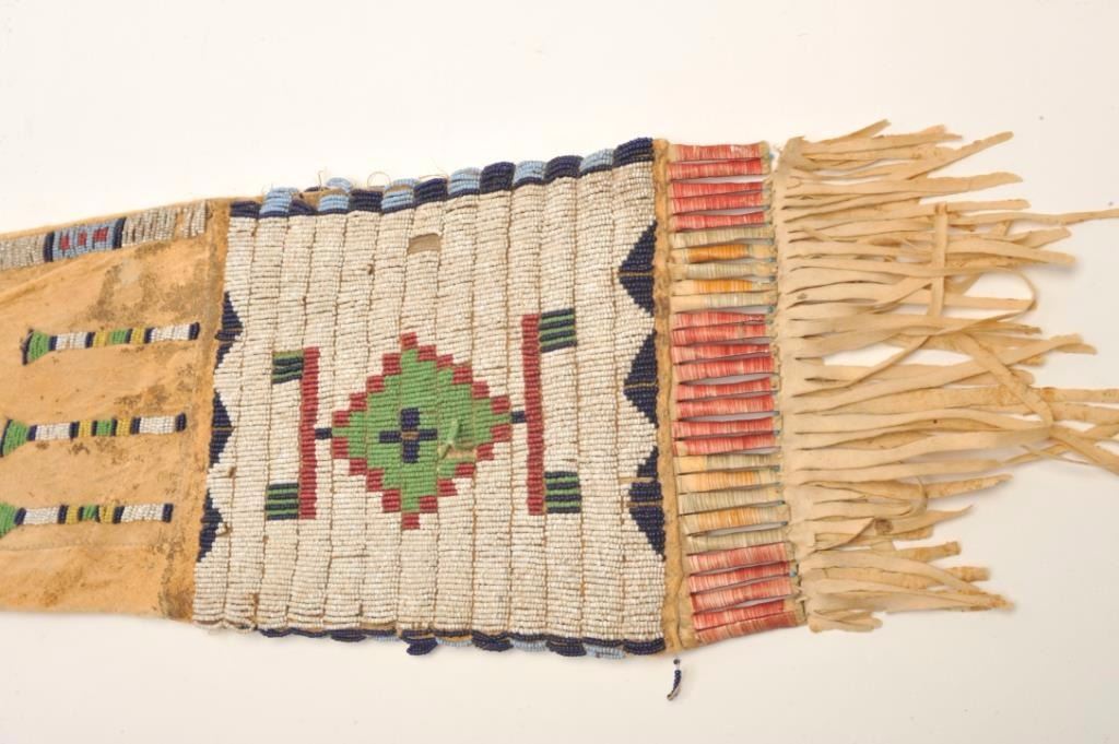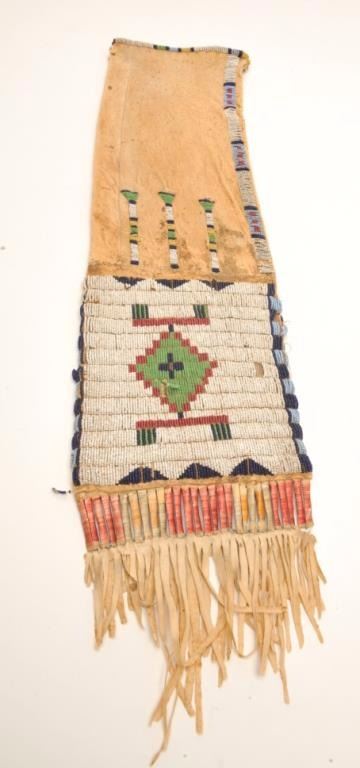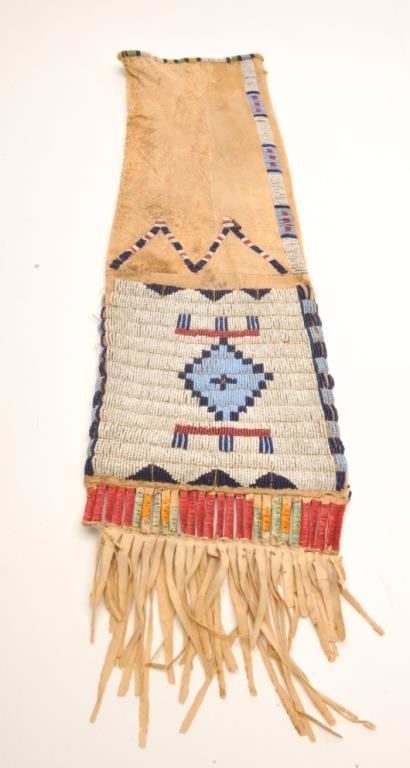 Beaded Sioux pipe bag circa 1890 to turn of the century. Measures approximately 28 ½” x 7 ¼” showing beads on braintanned buck skin. Quill work and fringe show damage and small losses as does the bead work. Differentscenes on each side. In fair to good condition only but an authentic piece that displays well and slightly lacking in condition due to age. Est.: $750-$1500