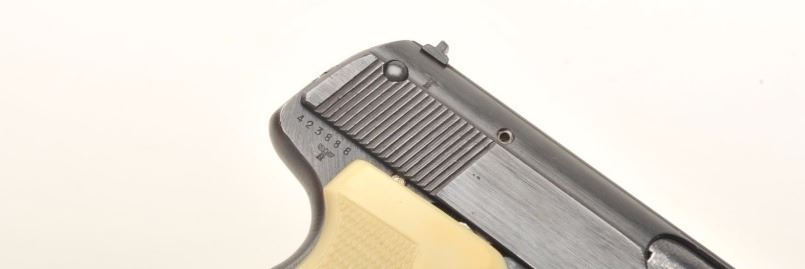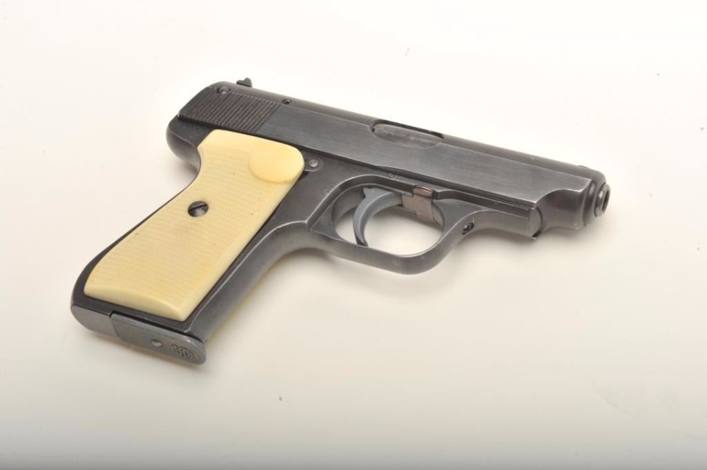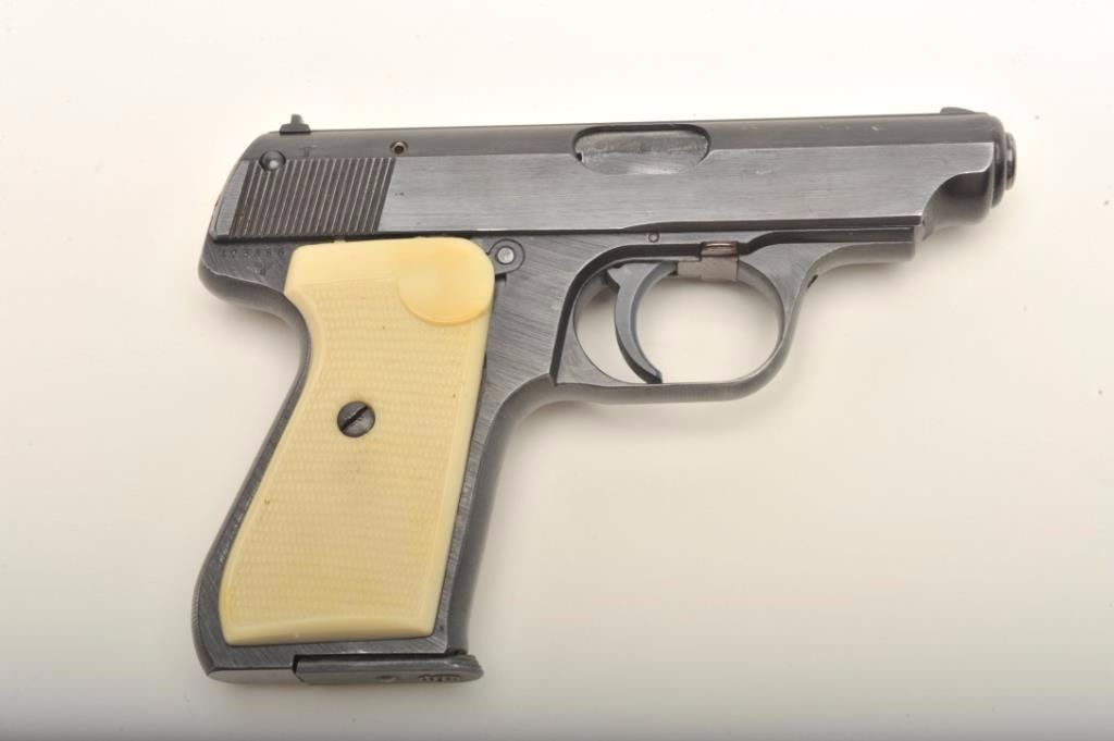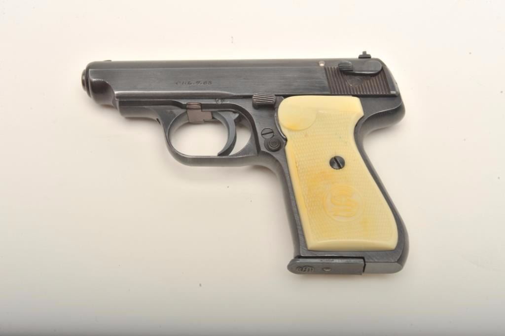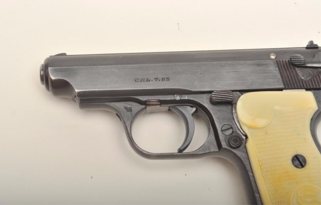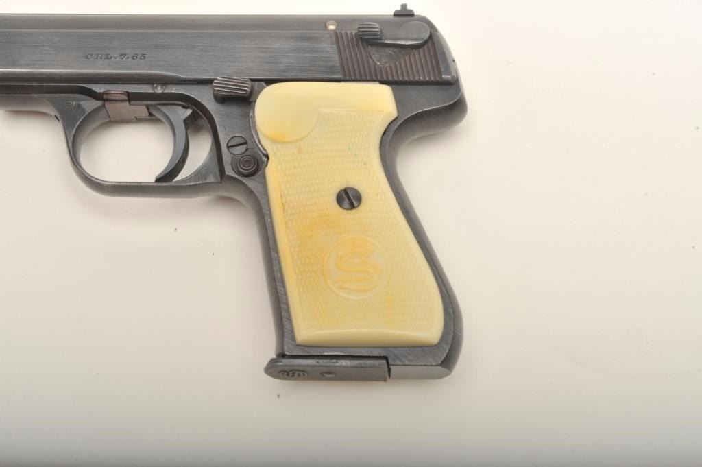 J.P. Sauer & Sohn Nazi era eagle C (Police or Gestapo) proofed .32 caliber semi-auto with rare factory simulated ivory grips in excellent condition, S/N 423888. This pistol shows 97%-99% original blue with just slighthandling and minor carry wear. The grips are excellent with S&S logo showing slight toning and pristine bore. Correct marked clip. Collector’s quality. (C&R) Est.: $700-$1400
