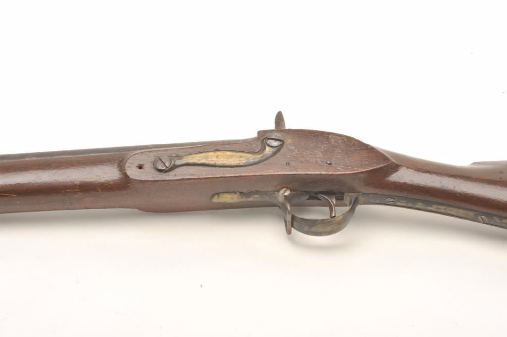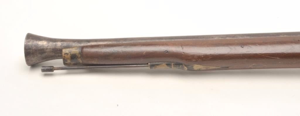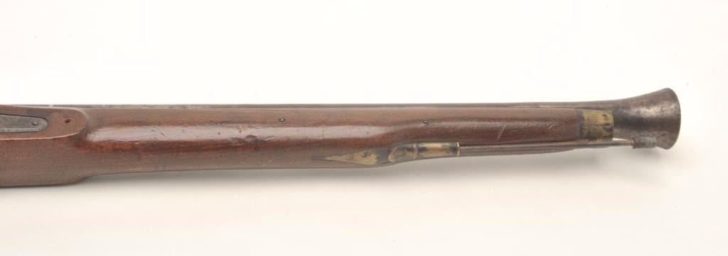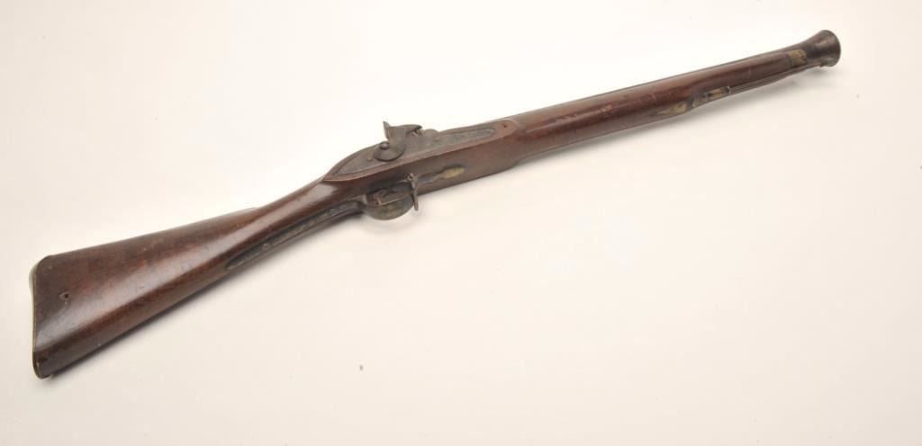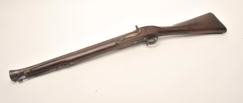 Percussion Blunderbuss constructed from British parts showing G.R. on converted Brown Bess lock with “EX” stamped in to the left side of the stock in block letters. 21 ½” iron barrel with nearly 1 ¾” bore to flaredbarrel that measures nearly 2” across. In fair to good condition overall with brass English style mounts and lazy “S” side plate. Measures 36 ½” overall. 2 of such guns were in the Juan Carlos Amadeo collection inArgentina started in the 19th century and were listed on his inventory as British guns purchased by Mexico and later sold to Argentina. (Antique) Est.: $600-$1200