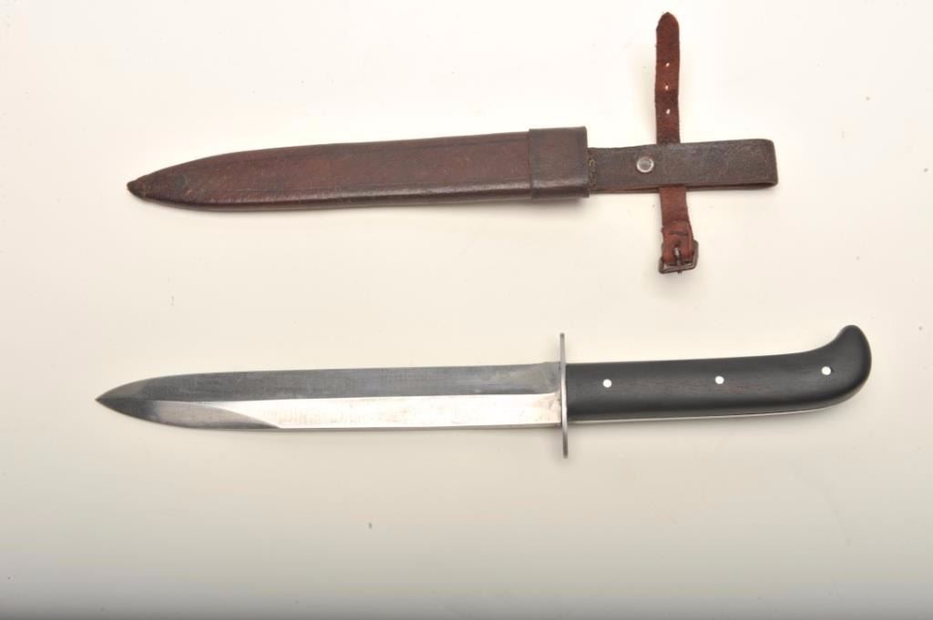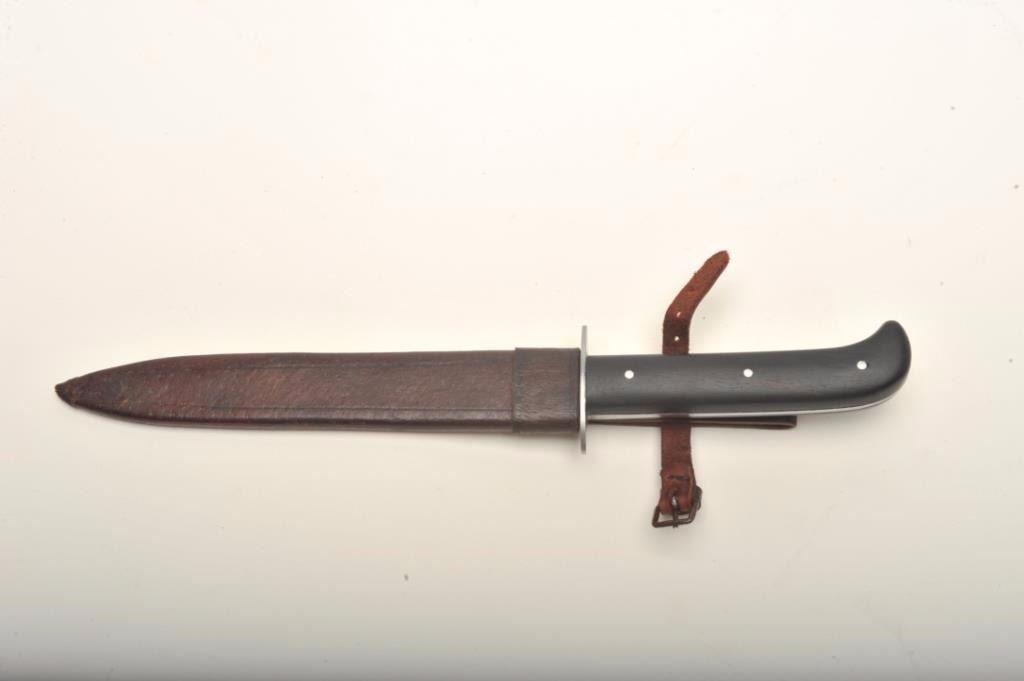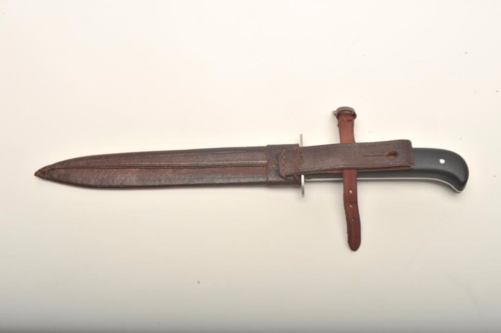 J.A. Henckels (Twin Marked) Pre-War German fighting knife with military style leather scabbard Measures 11 ¾” overall with a 7 ¼” blade. In very good plus to near fine condition showing slight sharpening to theedge. The scabbard is near fine with strap and buckle added to secure knife. Possible private purchase for commando or special German forces. Est.; $300-$600