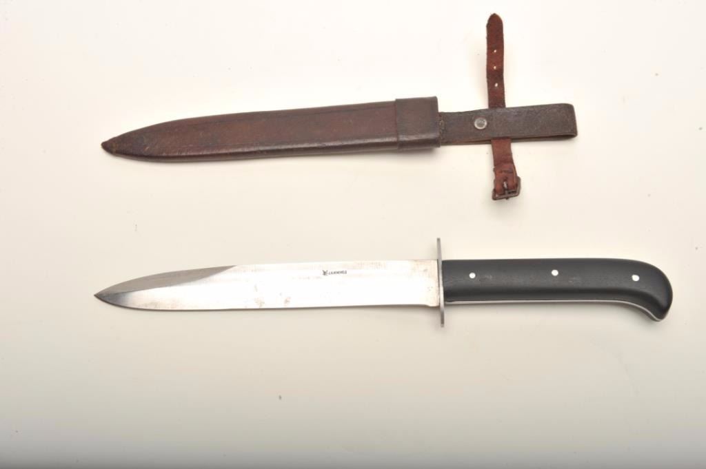 Lot 354 J.A. Henckels (Twin Marked) Pre-War German fighting knife with military style leather scabbard Mea