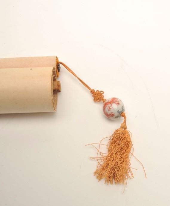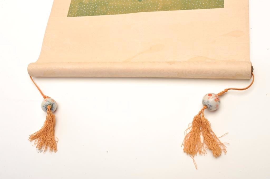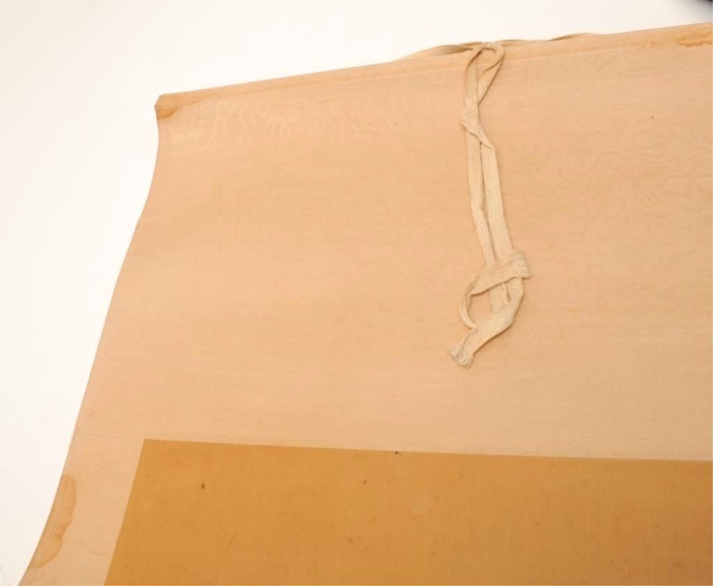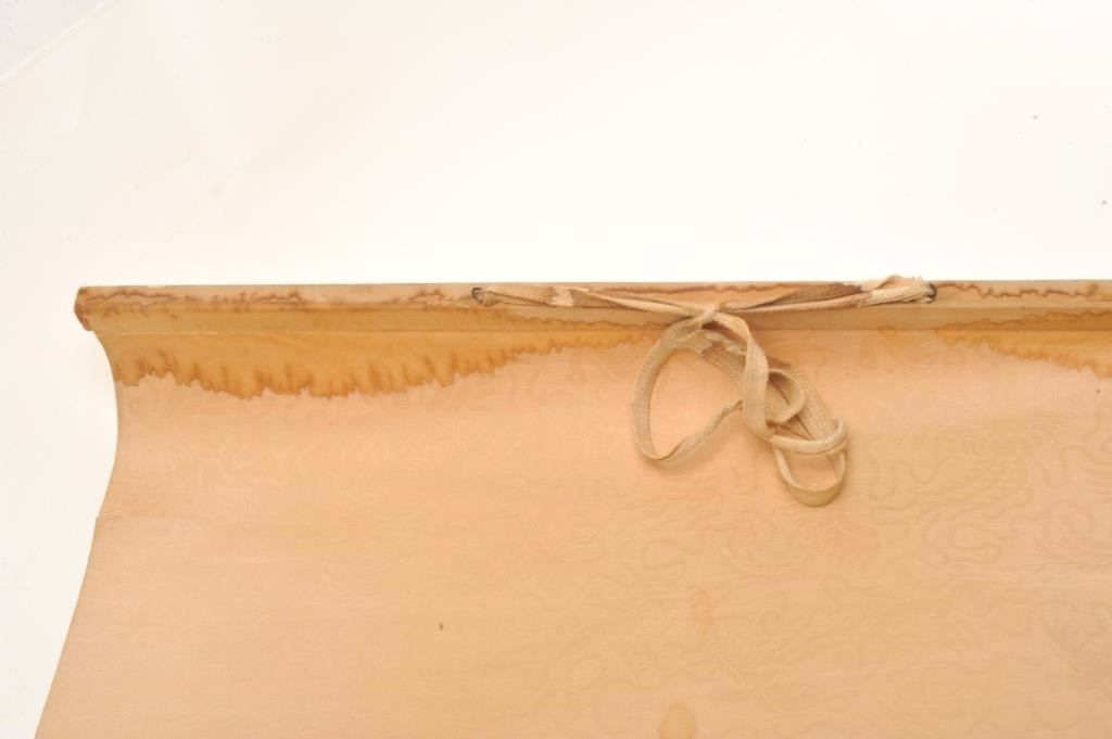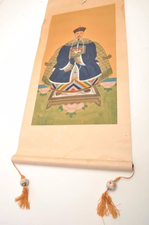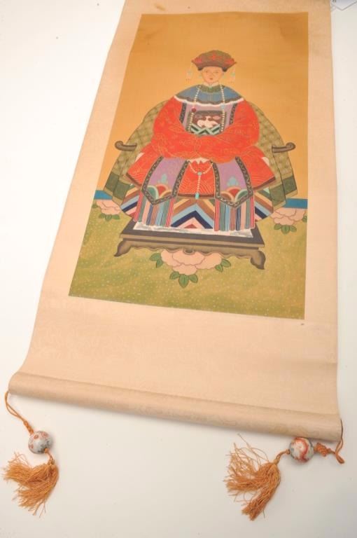 Pair of hand painted Chinese scrolls of noble and lady showing Phoenix bird on breast piece in artwork. Porcelain balls on tassels with dragons. Late 19th to 20th century. Measures 22” x 11 ¾” artwork only notincluding the silk. Est.: $250-$500