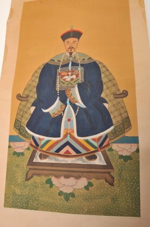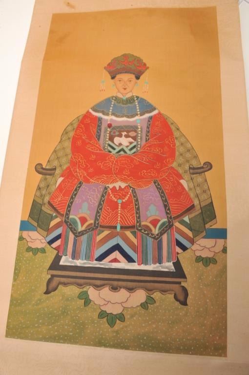 Lot 360 Pair of hand painted Chinese scrolls of noble and lady showing Phoenix bird on breast piece in art